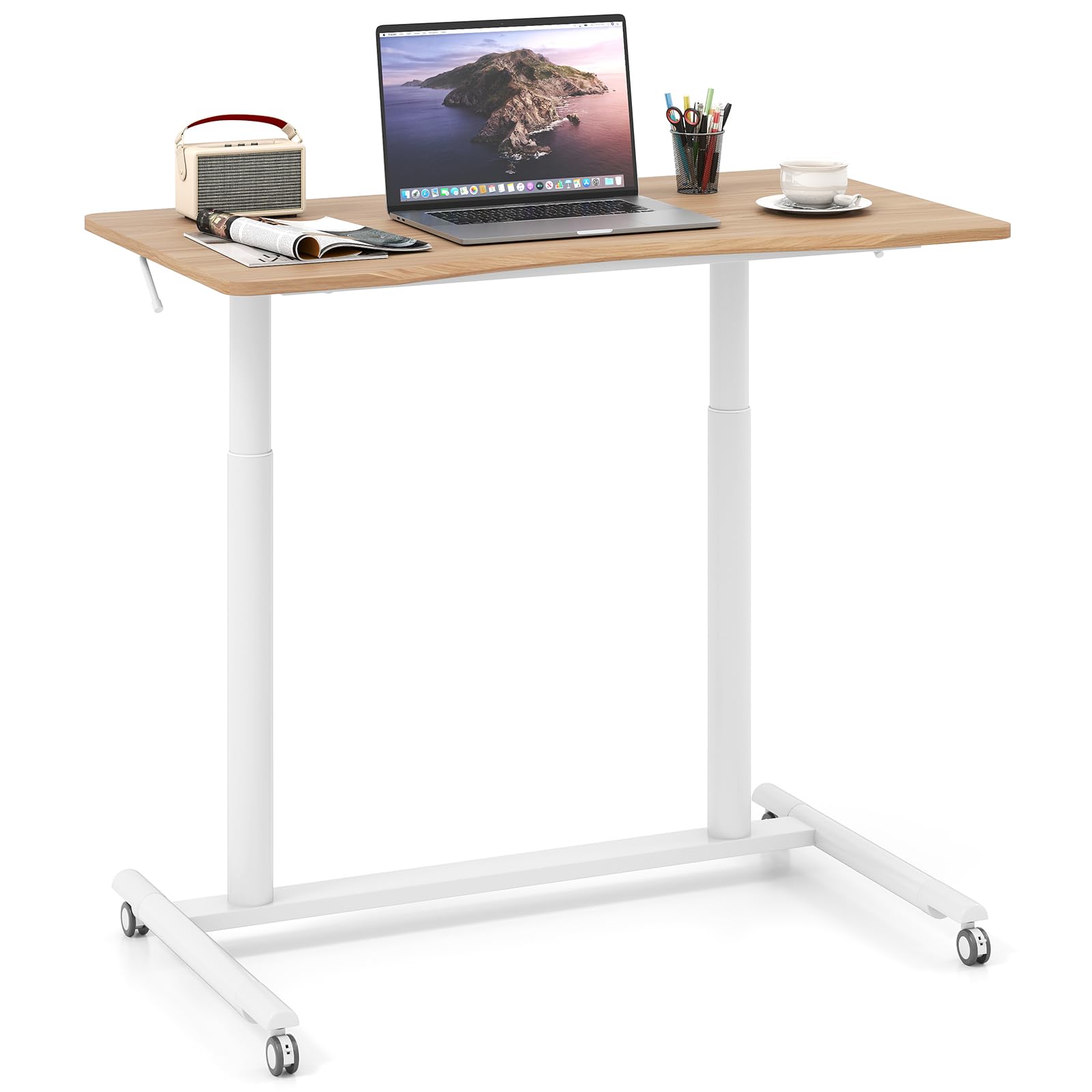 The mobile standing desk allows for seamless height adjustment from 27.5" to 42.5". The sit-stand alternation is designed to relieve various problems caused by sedentary work style, such as backache, neck or shoulder pain. Equipped with 4 lockable wheels, this rolling laptop desk offers the flexibility to move across your workspace. Supported by H-shaped metal base and reinforced with sturdy aluminum tubes, the height adjustable computer desk boasts reliable structure. For added convenience, the space-saving C-shaped design makes it fit snugly with the sofa or bed edges.