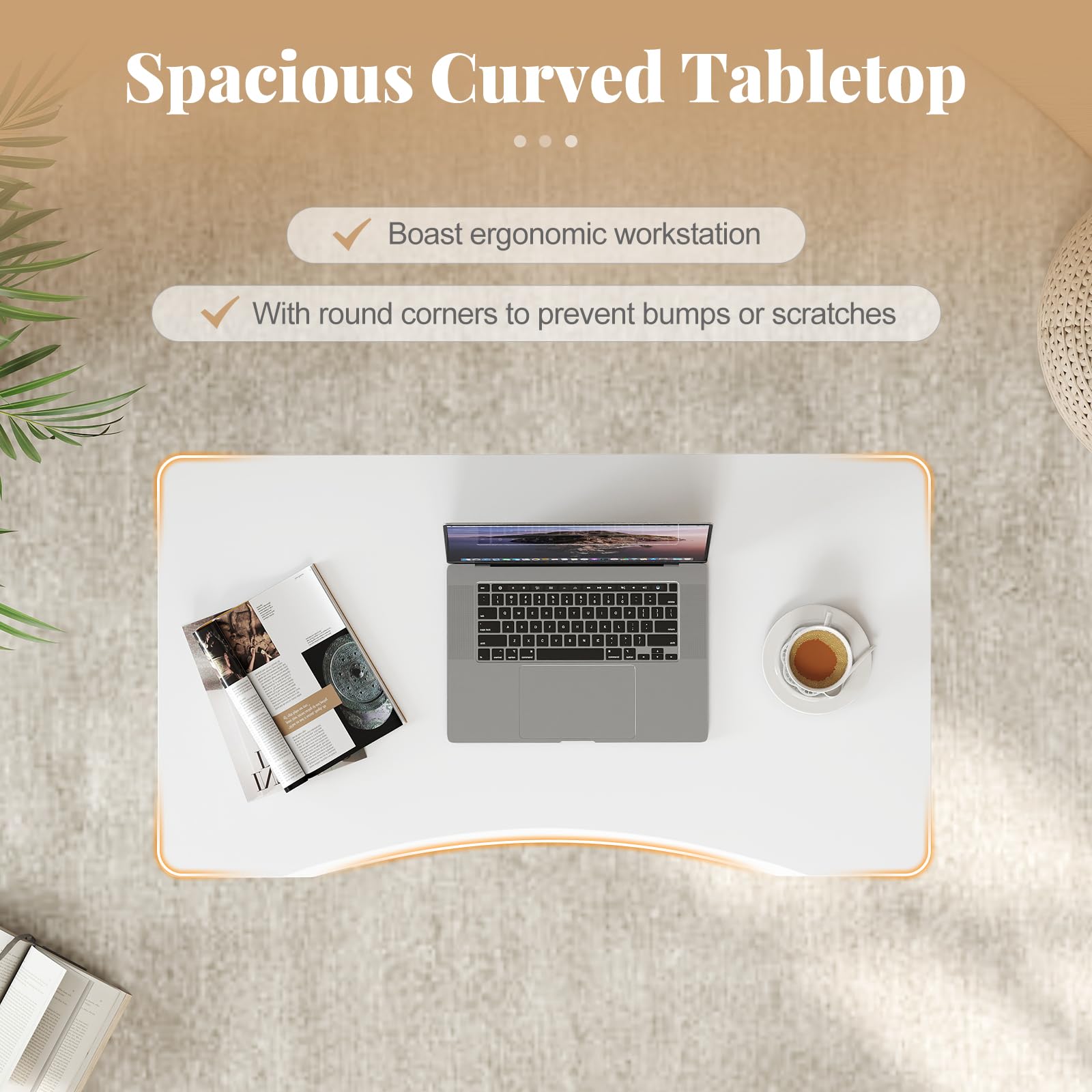 Spacious curved tabletop boasts ergonomic workstation