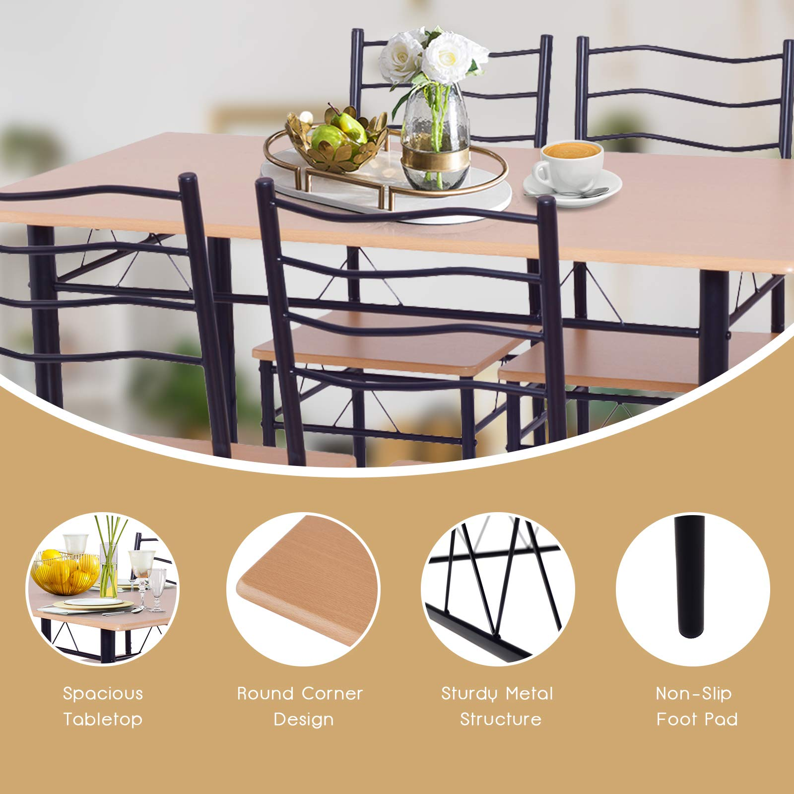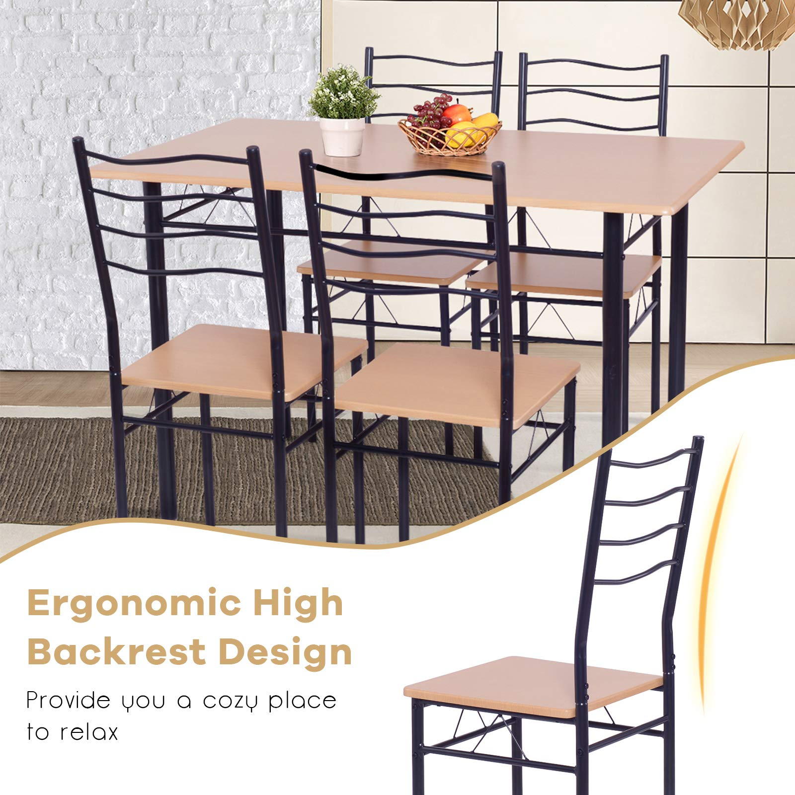 This is our modern and beautiful dining table and chairs set which is simple and elegant in appearance. Featuring durable iron construction, MDF chair seats and desktop, this dining table is sturdy and stable enough to withstand years of use. It can be widely used as a dining table to enjoy meals, or for other occasions: garden, picnic, party, play card games etc. Classical 1 table and 4 chairs in one set with large load capacity to greatly suit your needs, high quality at a great price. Don't hesitate to buy it!