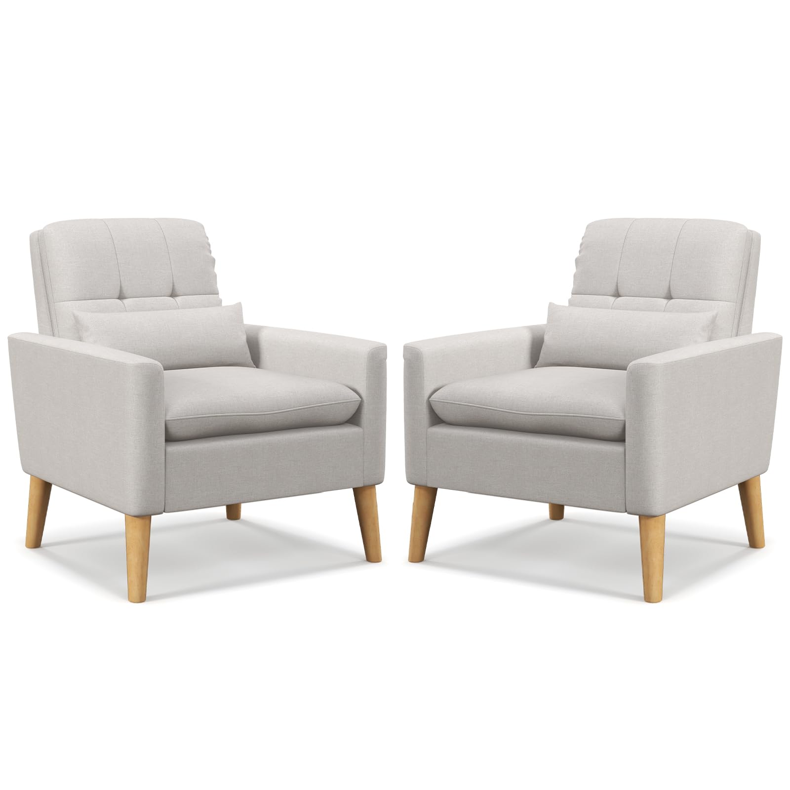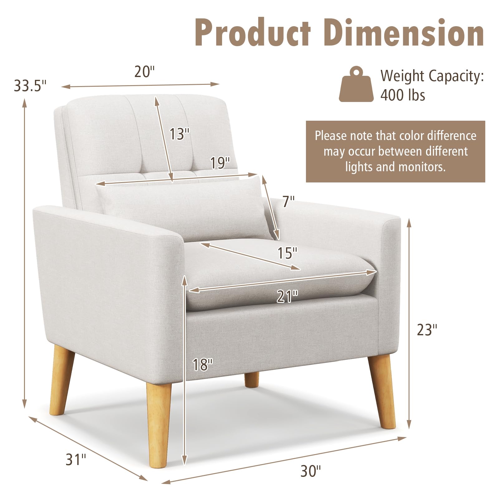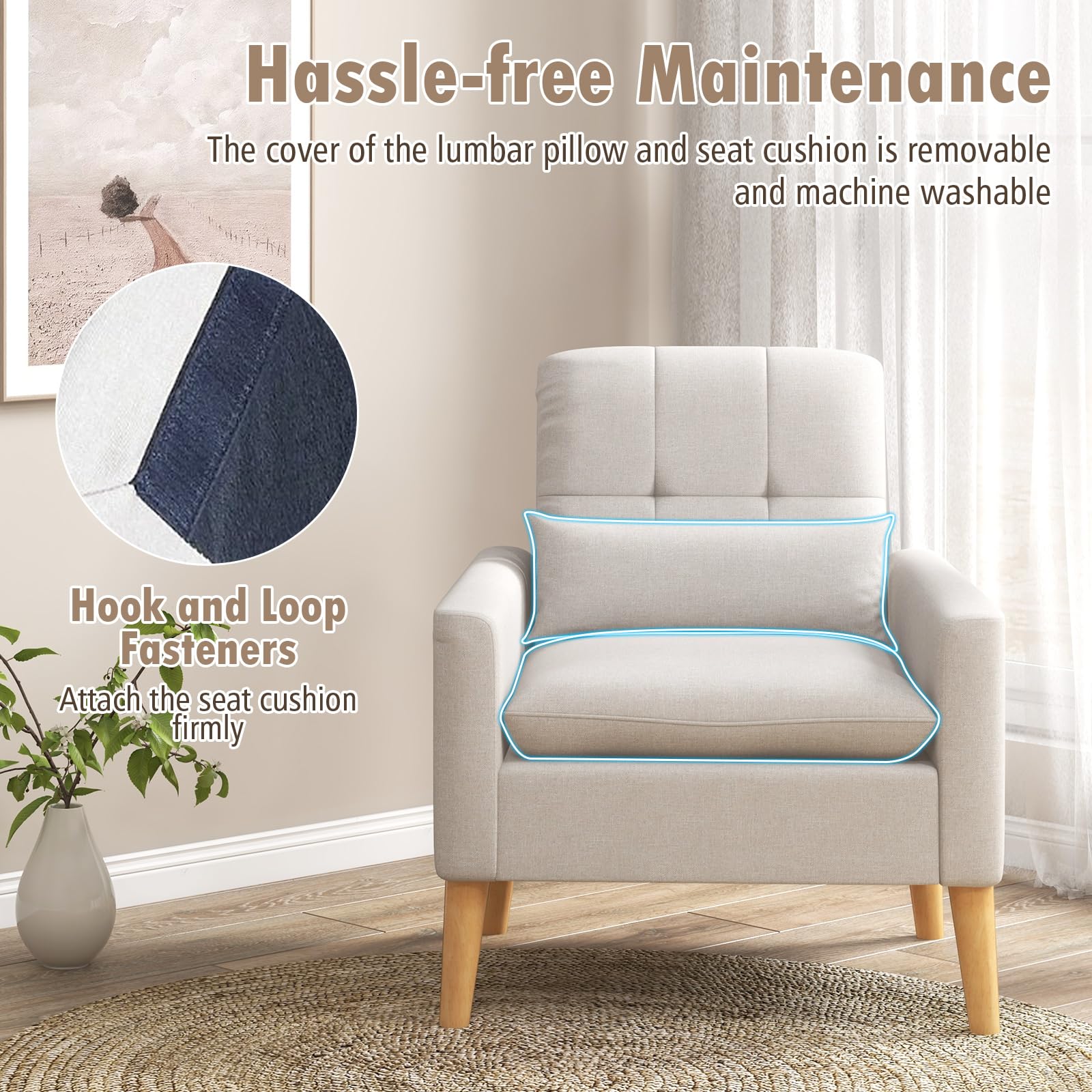 Designed for ultimate comfort and support, this modern accent chair features a supportive lumbar pillow and soft cushions. Besides, the hook and loop fasteners attach the seat cushion firmly. The sturdy rubber wood legs ensure overall stability, enabling this modern armchair to hold 400 lbs. Additionally, the cover of the lumbar pillow and seat cushion is removable and machine washable for hassle-free maintenance. With a mid-century modern style, the upholstered reading chair adds a timeless touch to any room. Furthermore, it is easy to assemble and perfect for relaxing, reading, or simply enjoying some leisure time.