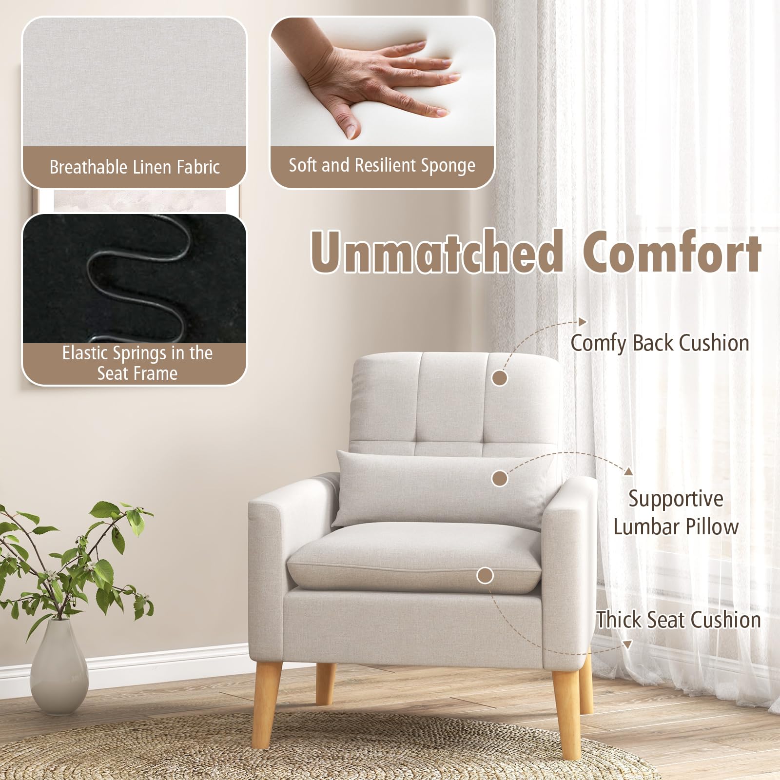 - [Ergonomic & Supportive Design]: The modern accent chair provides essential waist support with the addition of a lumbar pillow. Meanwhile, the snug back and seat cushion plus armrests cradle you in luxurious comfort. Filled with soft and resilient sponge, the single sofa chair brings further relaxation.