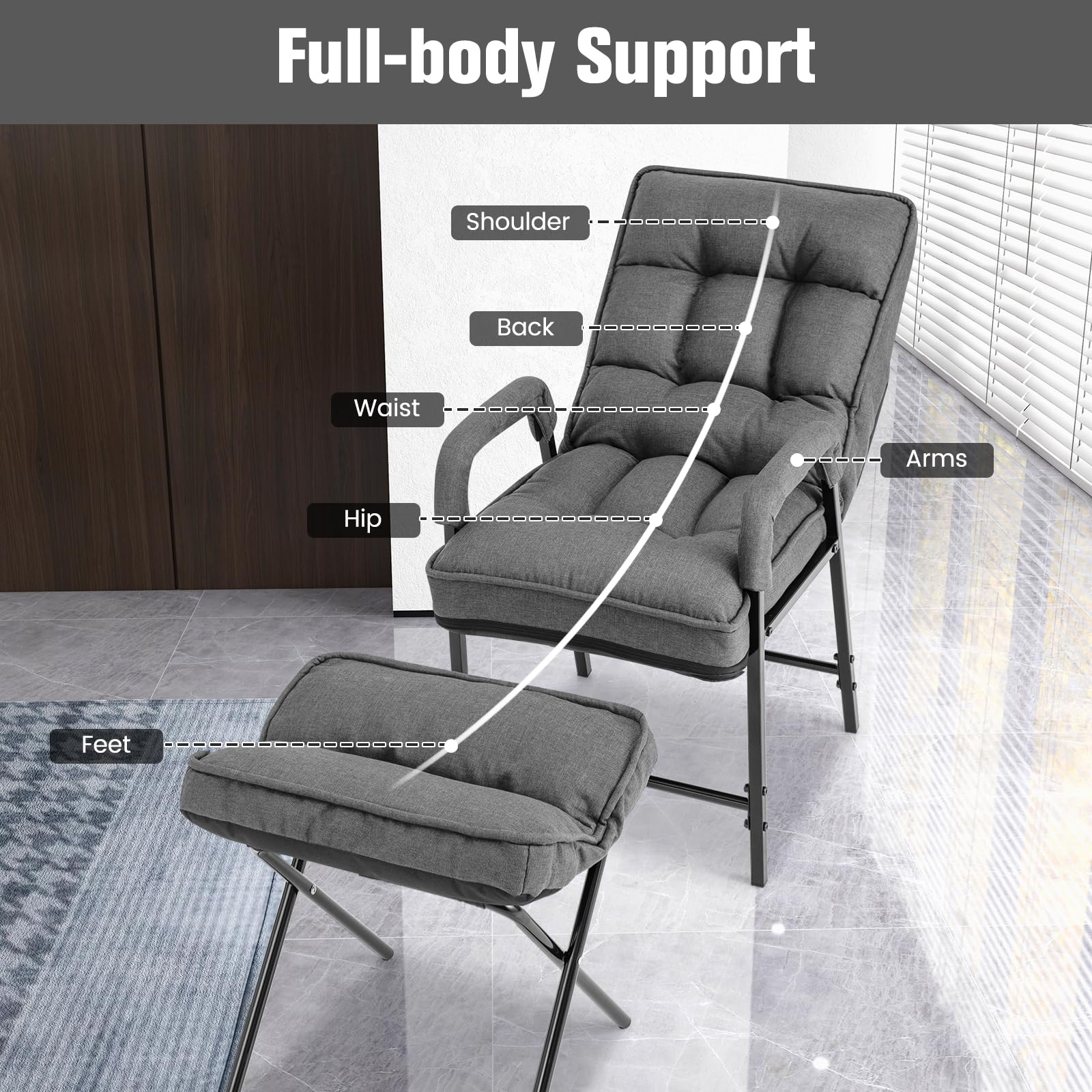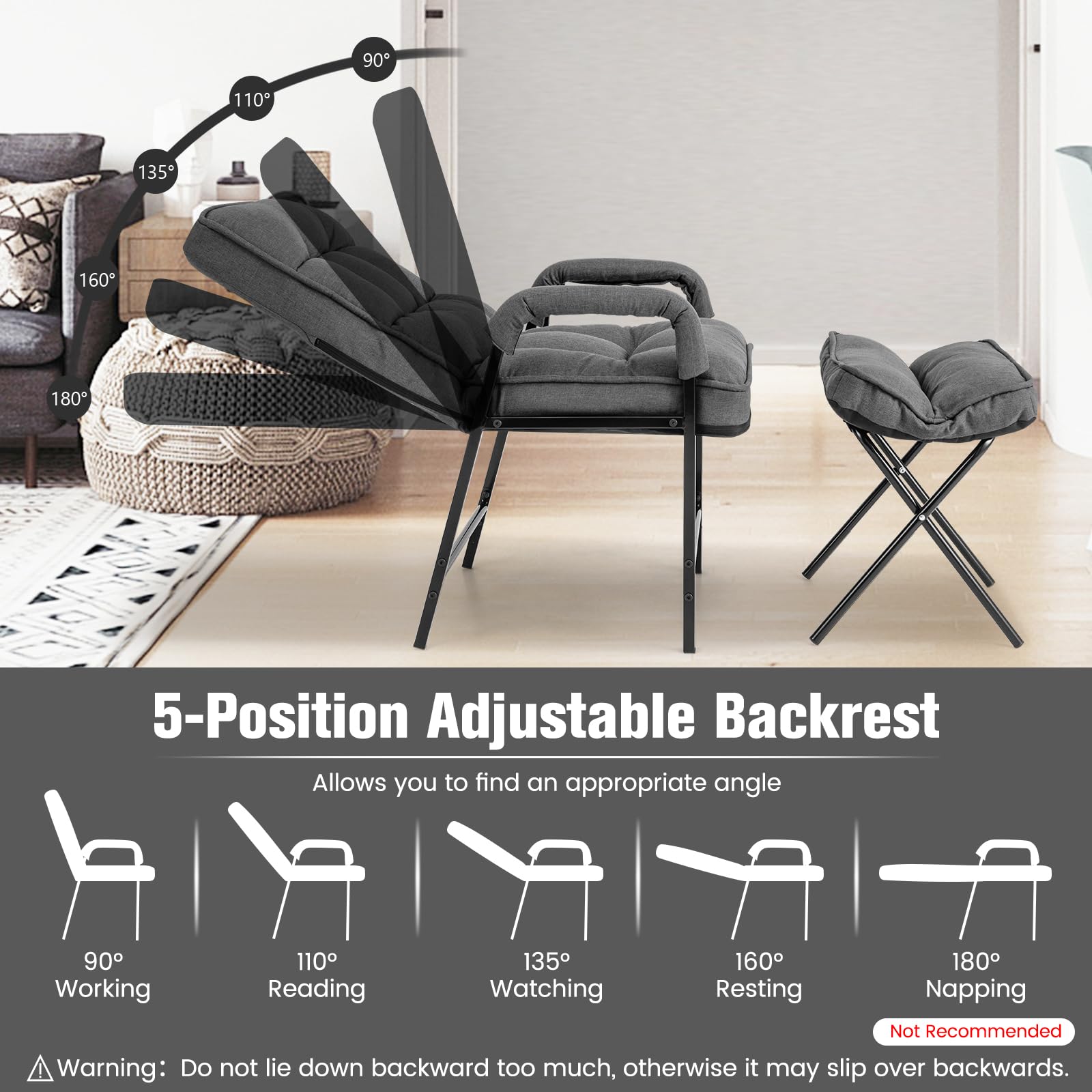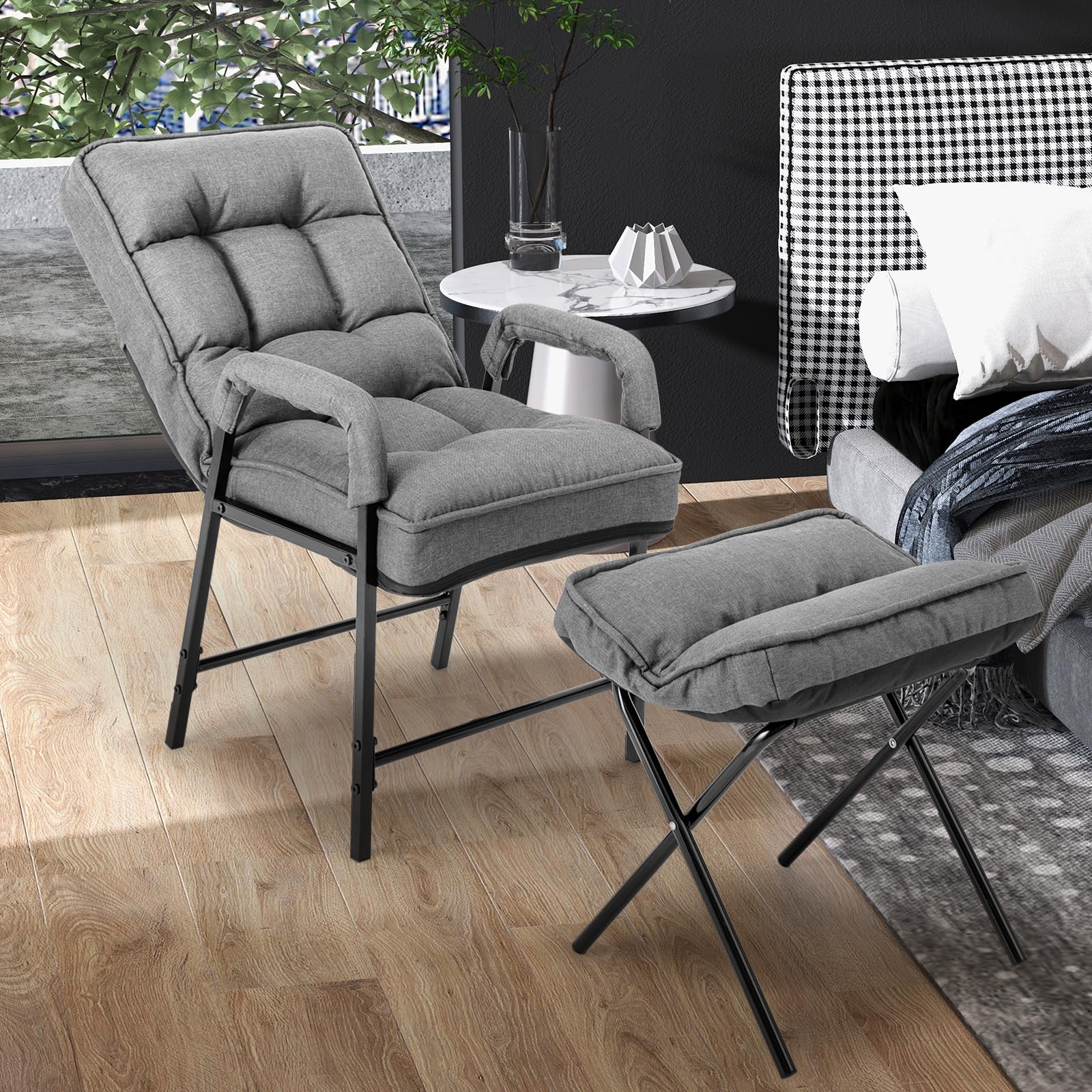 Covered with skin-friendly linen cloth and filled with soft sponge, the single chair and ottoman are comfortable. Besides, the backrest can be adjusted into 5 positions to meet your various needs, such as reading a book, watching TV, taking a nap and more. Additionally, the footstool offers an extra place for your legs for further relaxation. Supported by strong metal legs with non-slip foot pads, the armchair shows excellent steadiness. Furthermore, the simple style complements well in the living room, bedroom, study and other rooms.