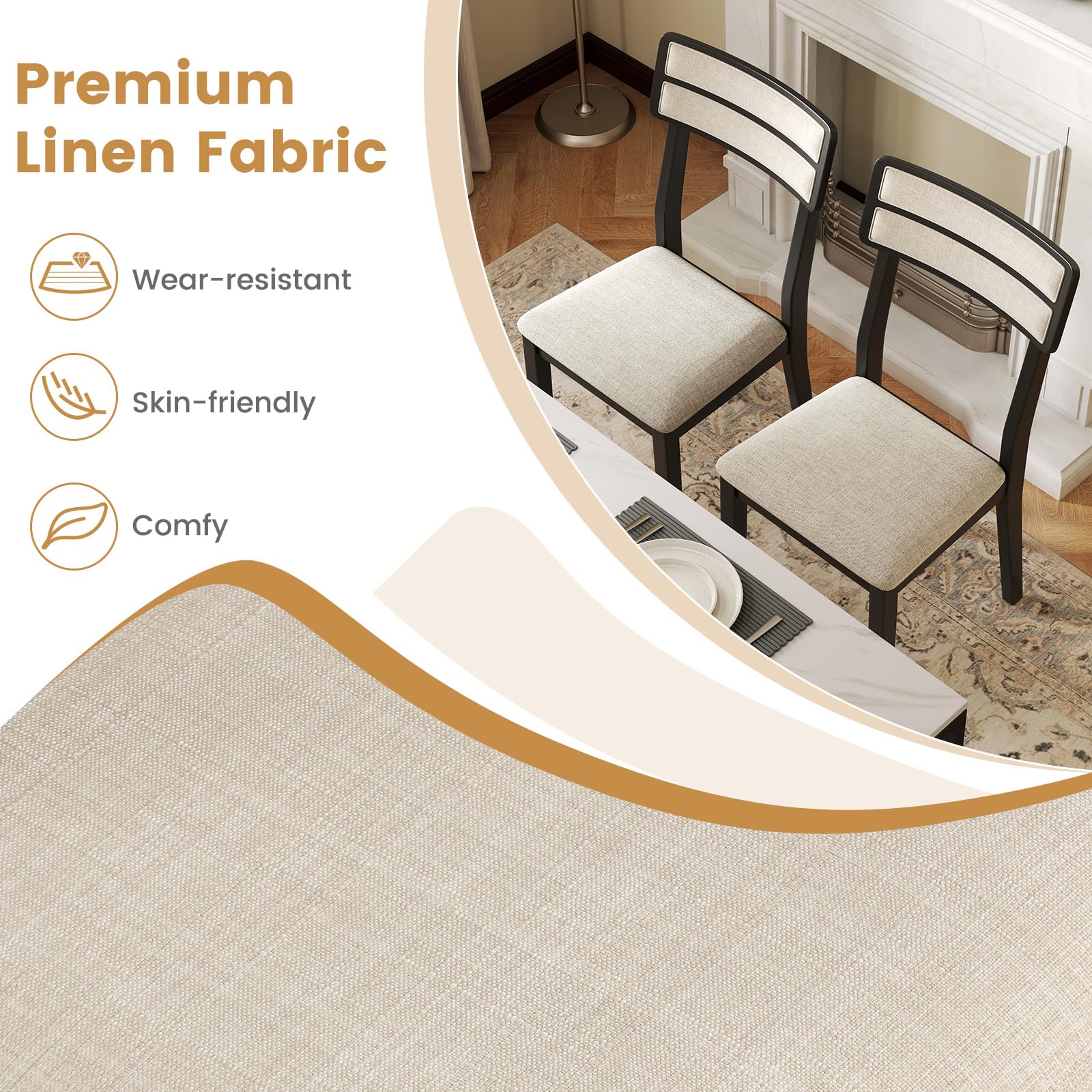 Are you looking for a dining chair that blends modern style with everyday comfort? This premium upholstered chair wraps a wear-resistant, skin-friendly linen-feel fabric for a comfy touch. It comes with more thoughtful details such as thick seat cushioning and an ergonomically tilted backrest, letting you linger over meals or conversations without fatigue. Additionally, the sturdy rubber-wood legs quietly support up to 400 lbs, while non-slip foot pads keep every seat stable on any surface. Hence, whether you pull one up to the kitchen counter, place a set around the dining table, or add a statement piece to the study, its elegant back pattern instantly elevates your decoration.