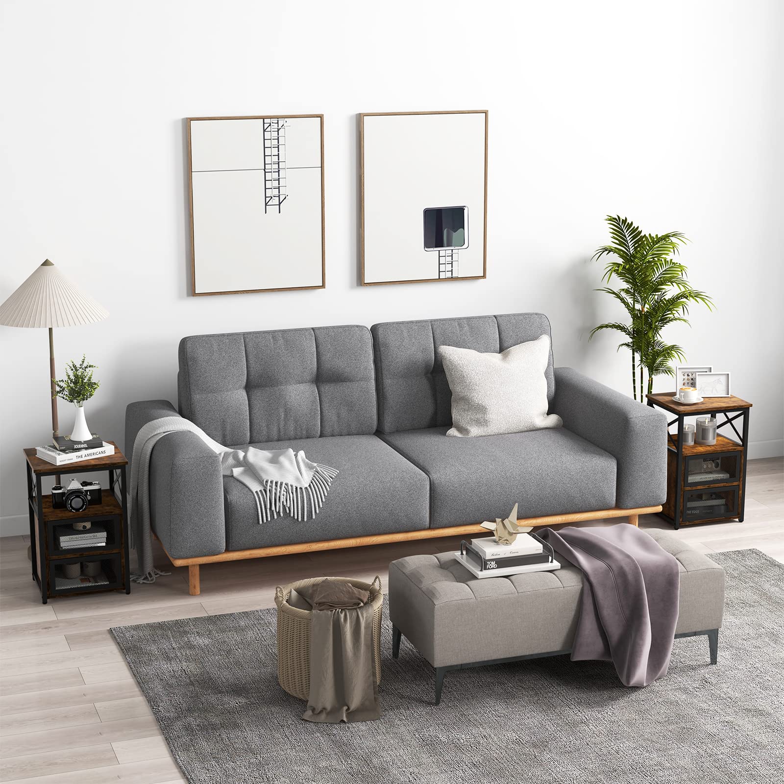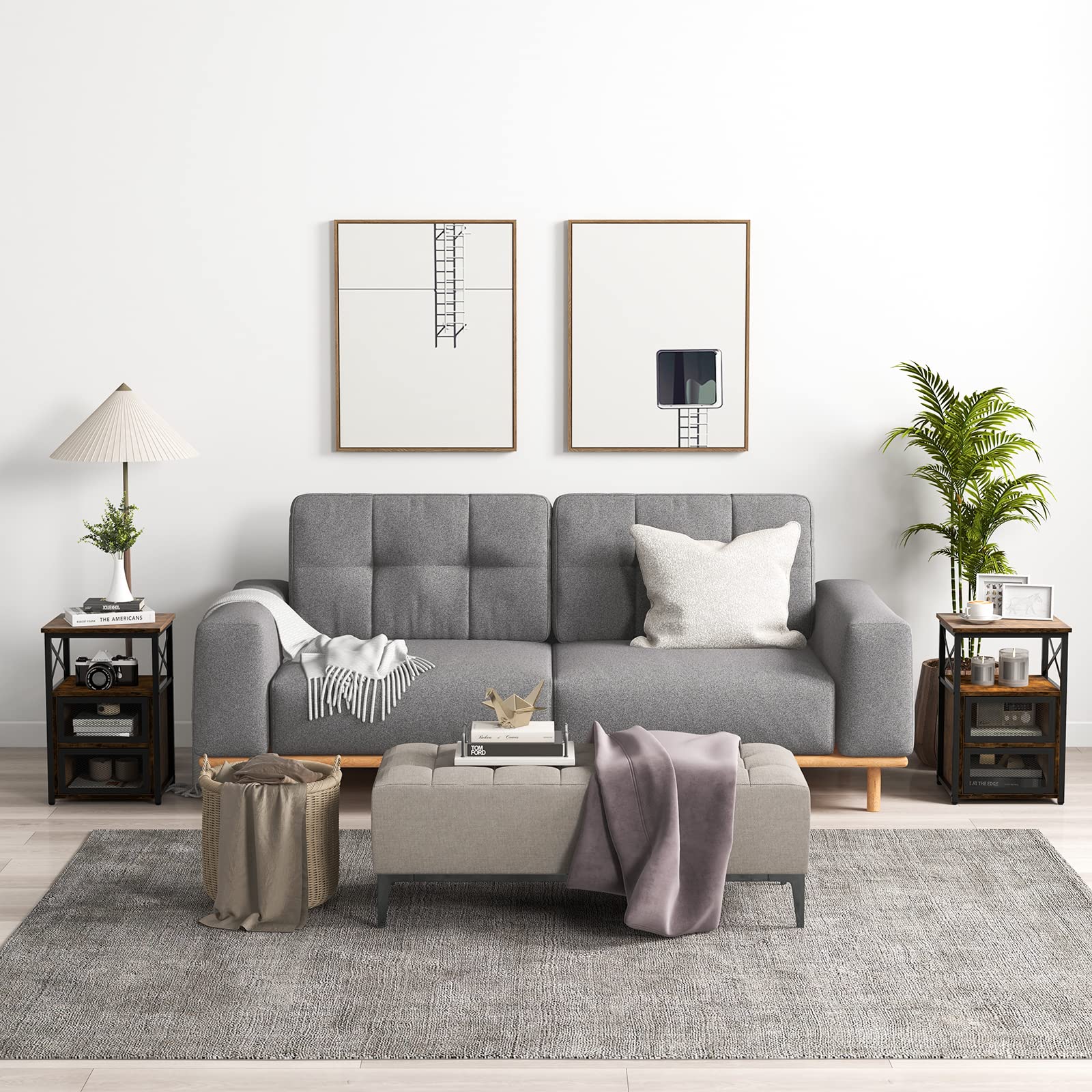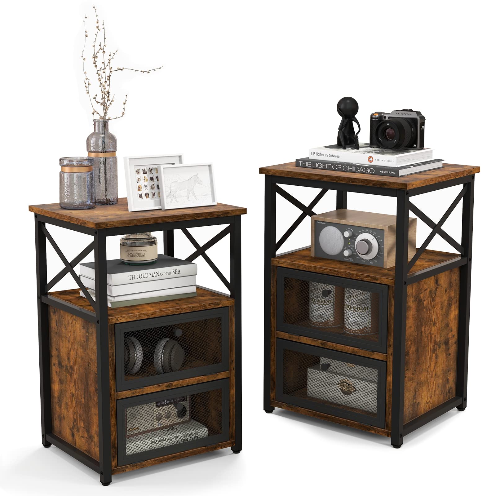 - [Superior Details & Free Collocation]: Adjustable foot pads keep balance to protect your floor from scratches. X-shaped protective fences show a unique industrial look and avoid item falling. The magnetic catch design is durable for a long lifespan and ensures a mute switch. The 2PCS end tables can be put on either side of the bed or used separately as side tables.