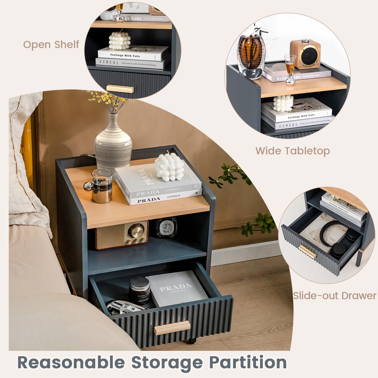 - Varied Storage Space: The nightstand features a wide tabletop and open shelf to facilitate the placement of frequent-used items, which are easily accessible as well. Besides, the slide-out drawer provides concealed storage space for your daily essentials.