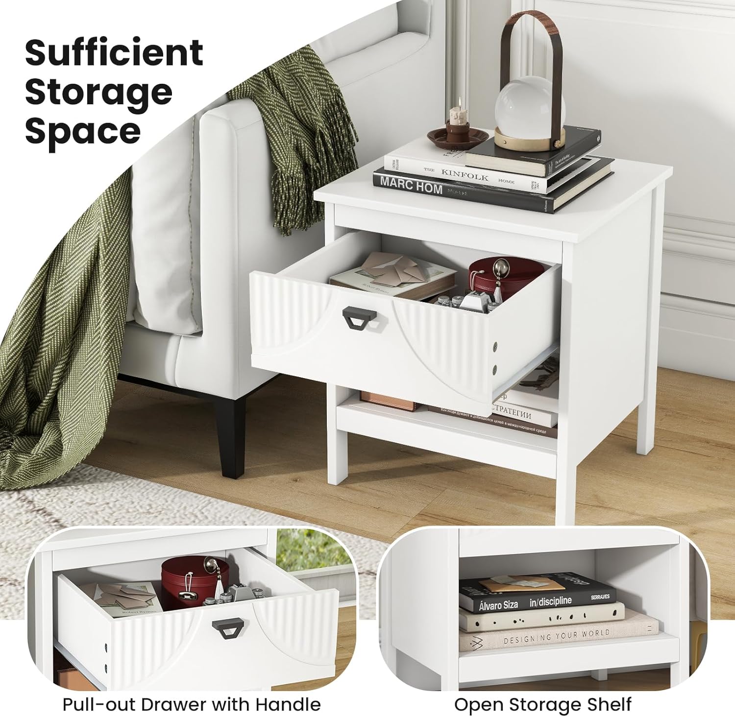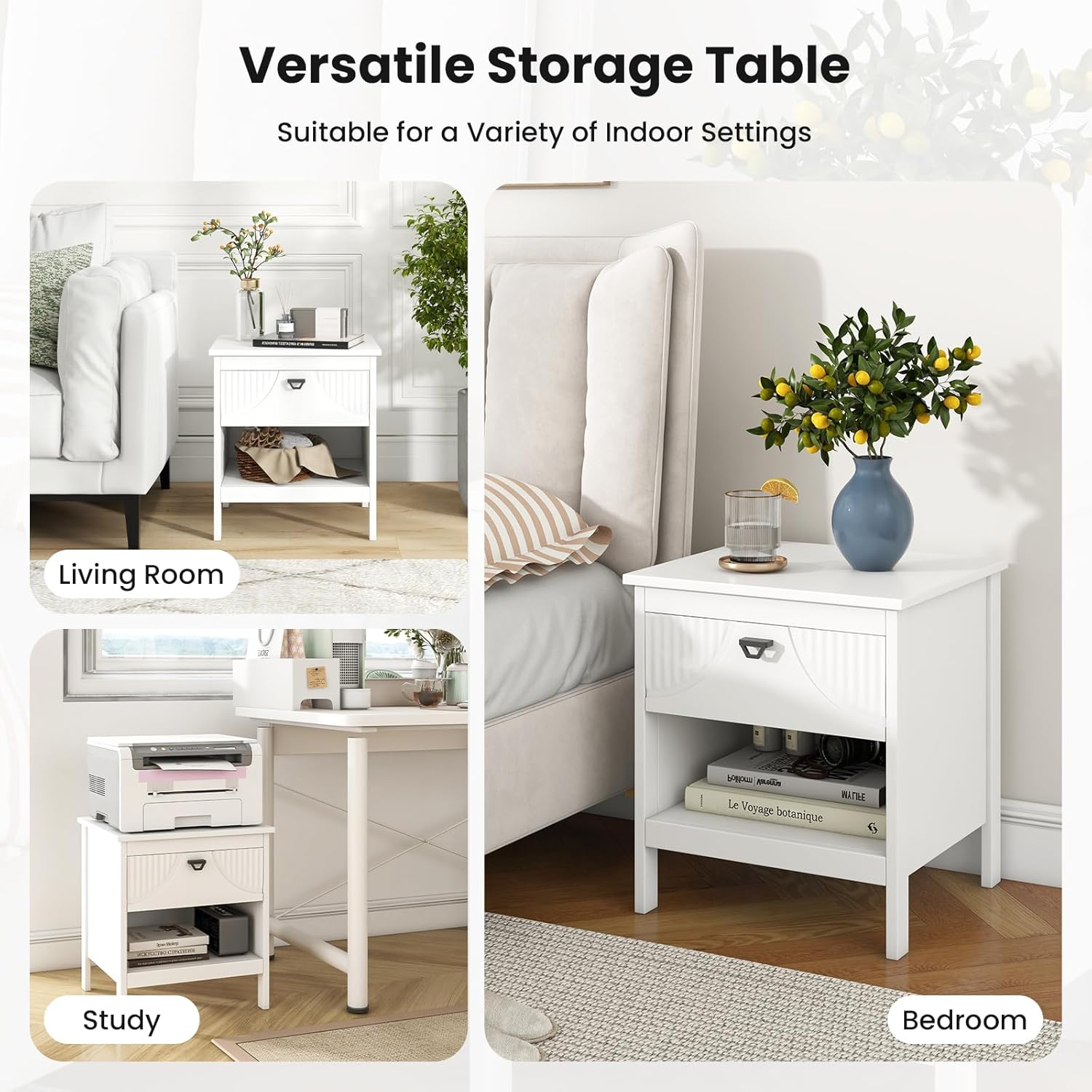 Enhance your living space with this side table boasting an elegant design that effortlessly complements various decoration styles. The faux cutout design on the drawer fronts adds a touch of class to the overall aesthetic. Enjoy the convenience of private drawers and open shelves, providing ample storage space for personal items, books, plants, and decorative pieces. Details of the nightstand showcase sophisticated workmanship: the stable structure features non-slip foot pads to prevent scratches and sliding, along with an anti-toppling device for added safety. Perfect for compact spaces, this end table can easily fit between sofas or beside your office desk. The smooth surface offers excellent water resistance, making cleanup a simple task. Seamlessly transition this multifunctional table from the living room to the bedroom as a nightstand, showcasing its versatility.