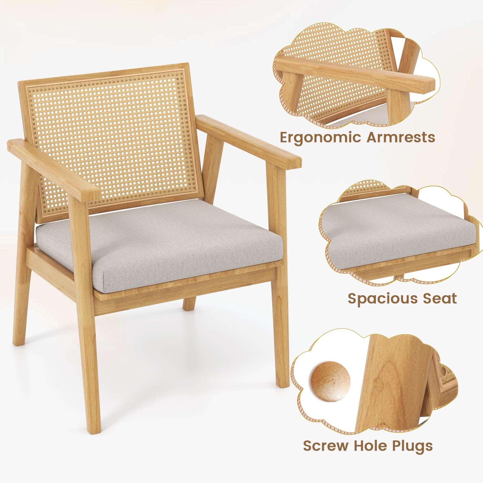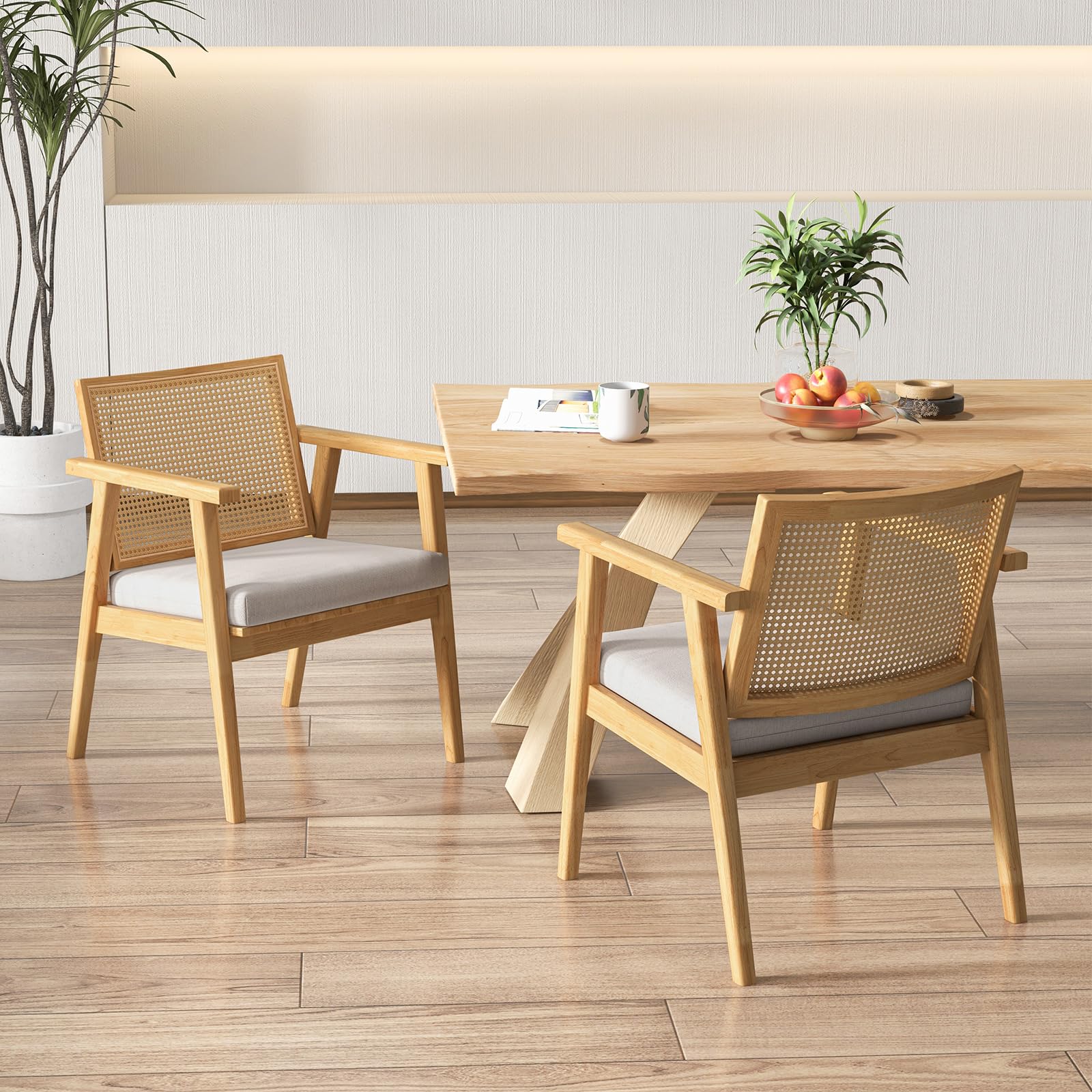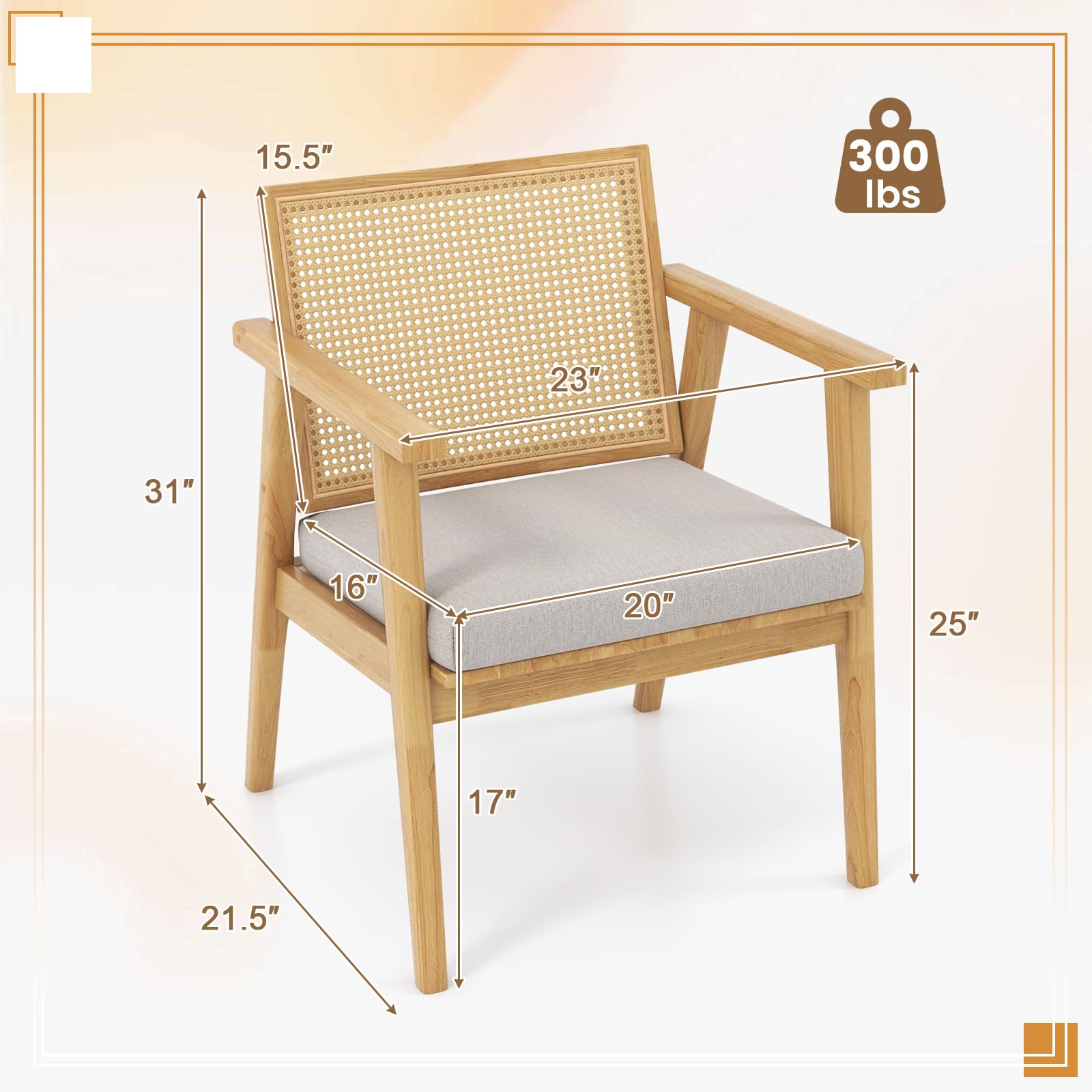 Whether you're gathering for a family meal or enjoying a cozy coffee in the morning, these rattan chairs will provide you with a delightful seating option. These chairs have breathable rattan backrests and smooth armrests to perfectly contour your body. The seat, measuring at 20" x 16" (W x D), will also bring you ultimate relaxation. More importantly, our chairs come with soft sponge padded seat cushions for even more comfort. Not only that, but the natural rubber wood frame makes our armchairs sturdy, wear resistant, and built to last.