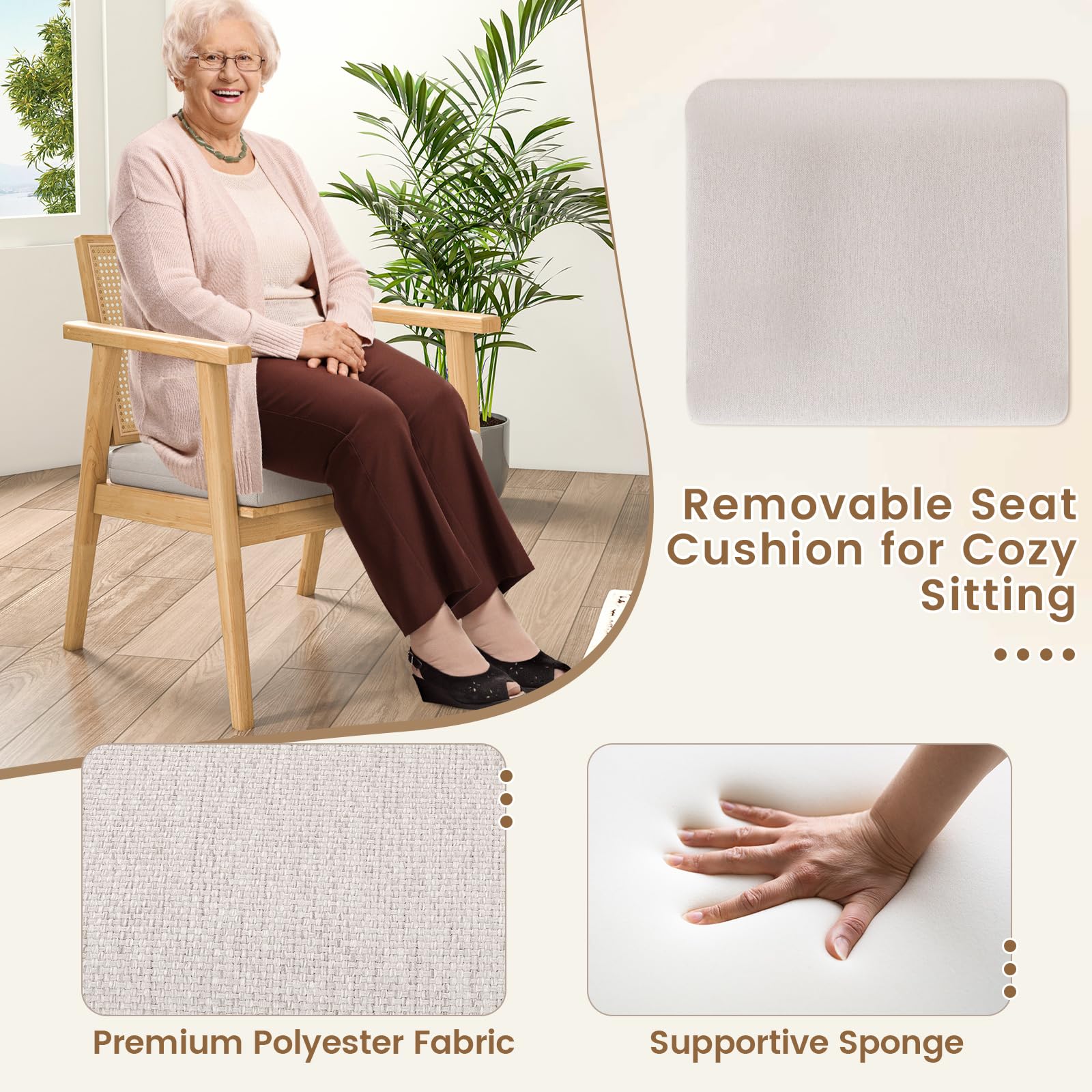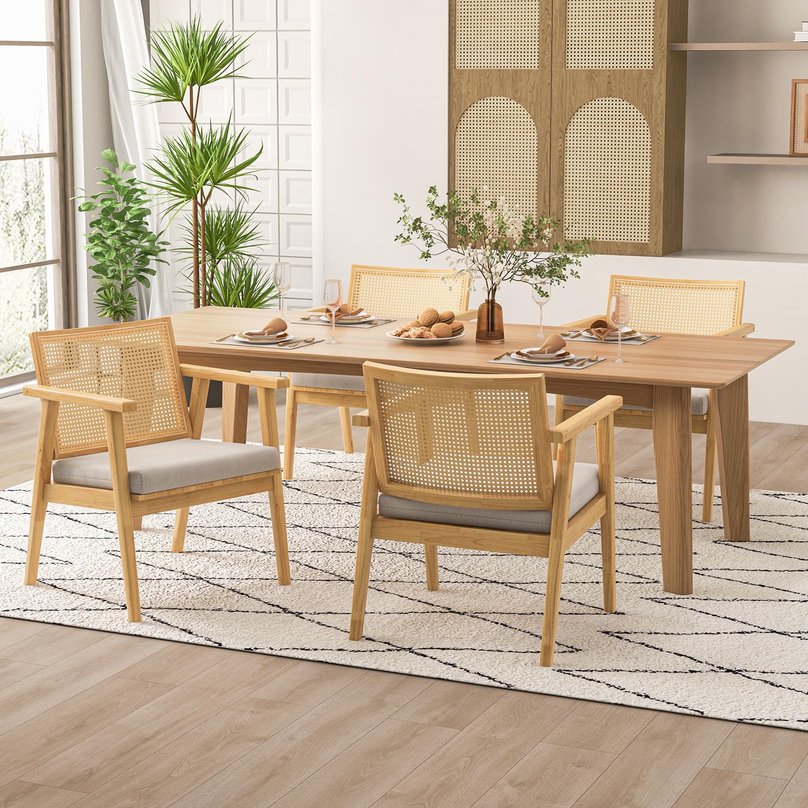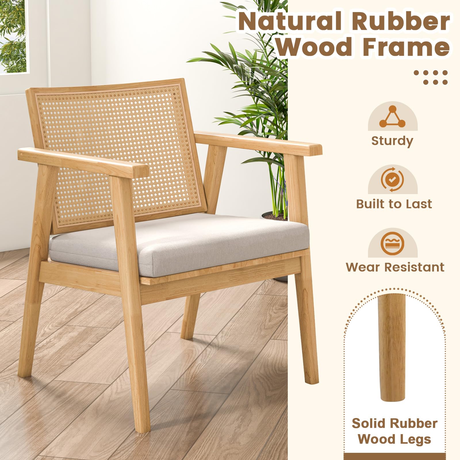 Whether you're gathering for a family meal or enjoying a cozy coffee in the morning, these rattan chairs will provide you with a delightful seating option. These chairs have breathable rattan backrests and smooth armrests to perfectly contour your body. The seat, measuring at 20" x 16" (W x D), will also bring you ultimate relaxation. More importantly, our chairs come with soft sponge padded seat cushions for even more comfort. Not only that, but the natural rubber wood frame makes our armchairs sturdy, wear resistant, and built to last.