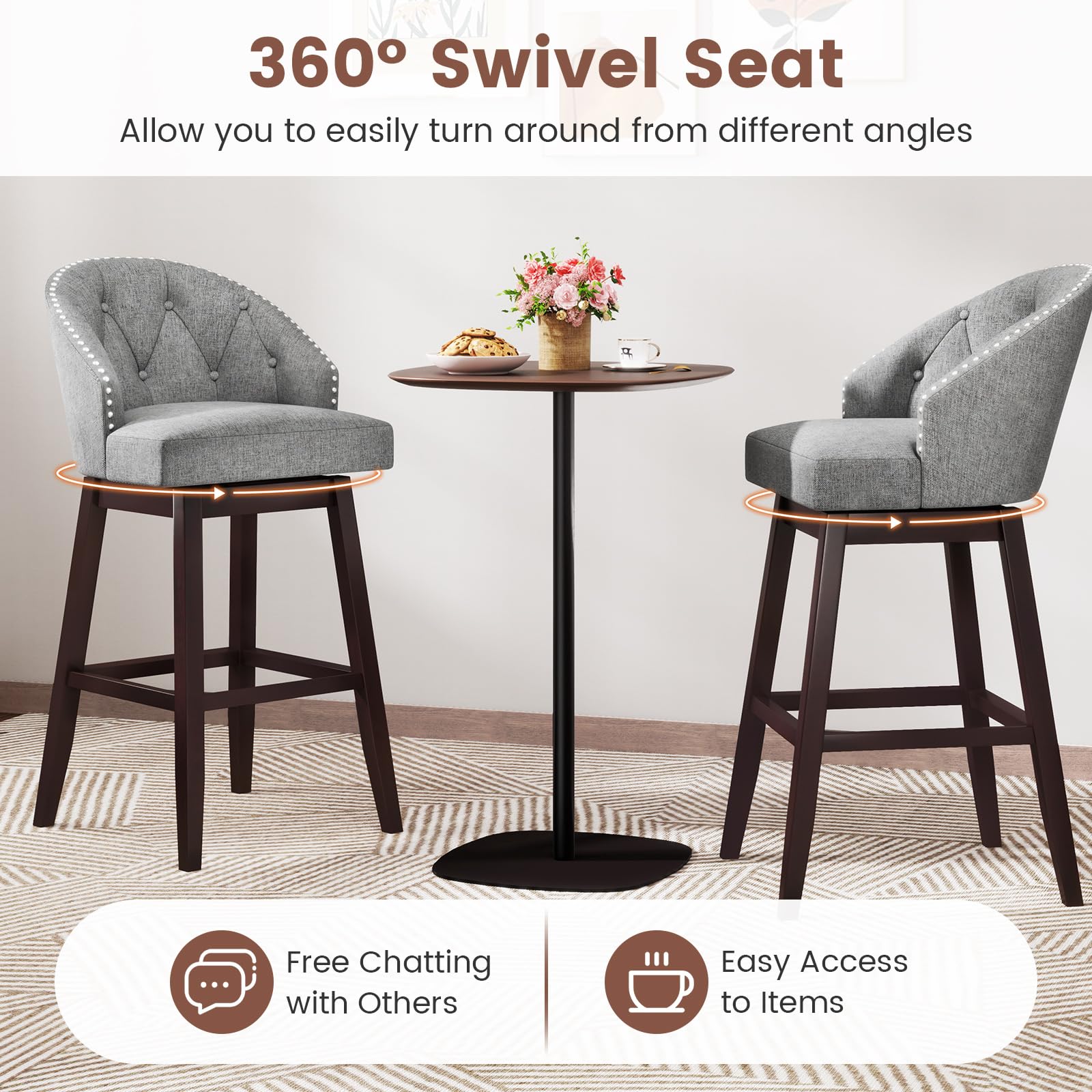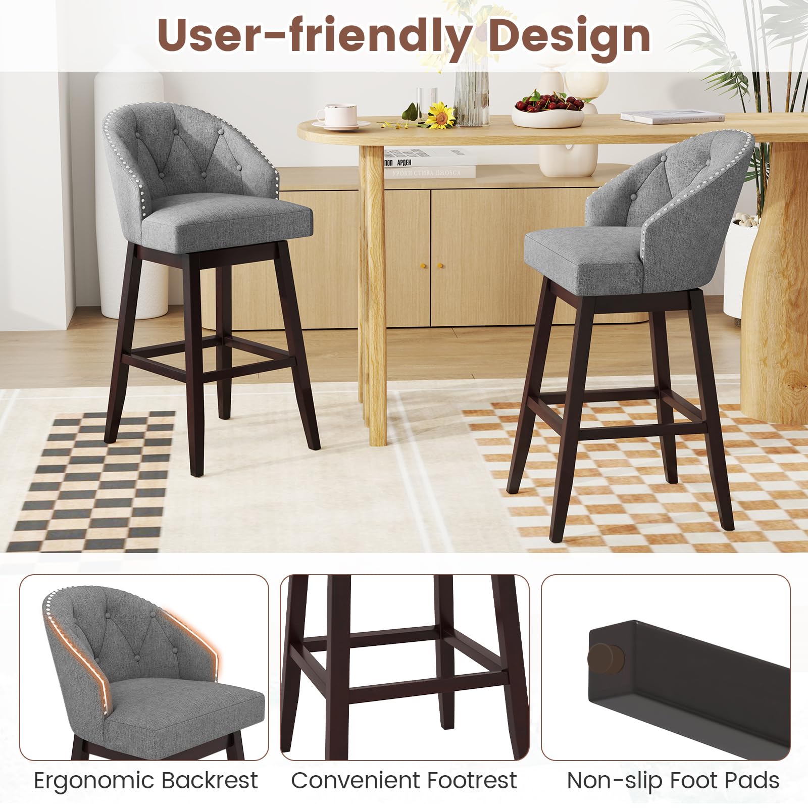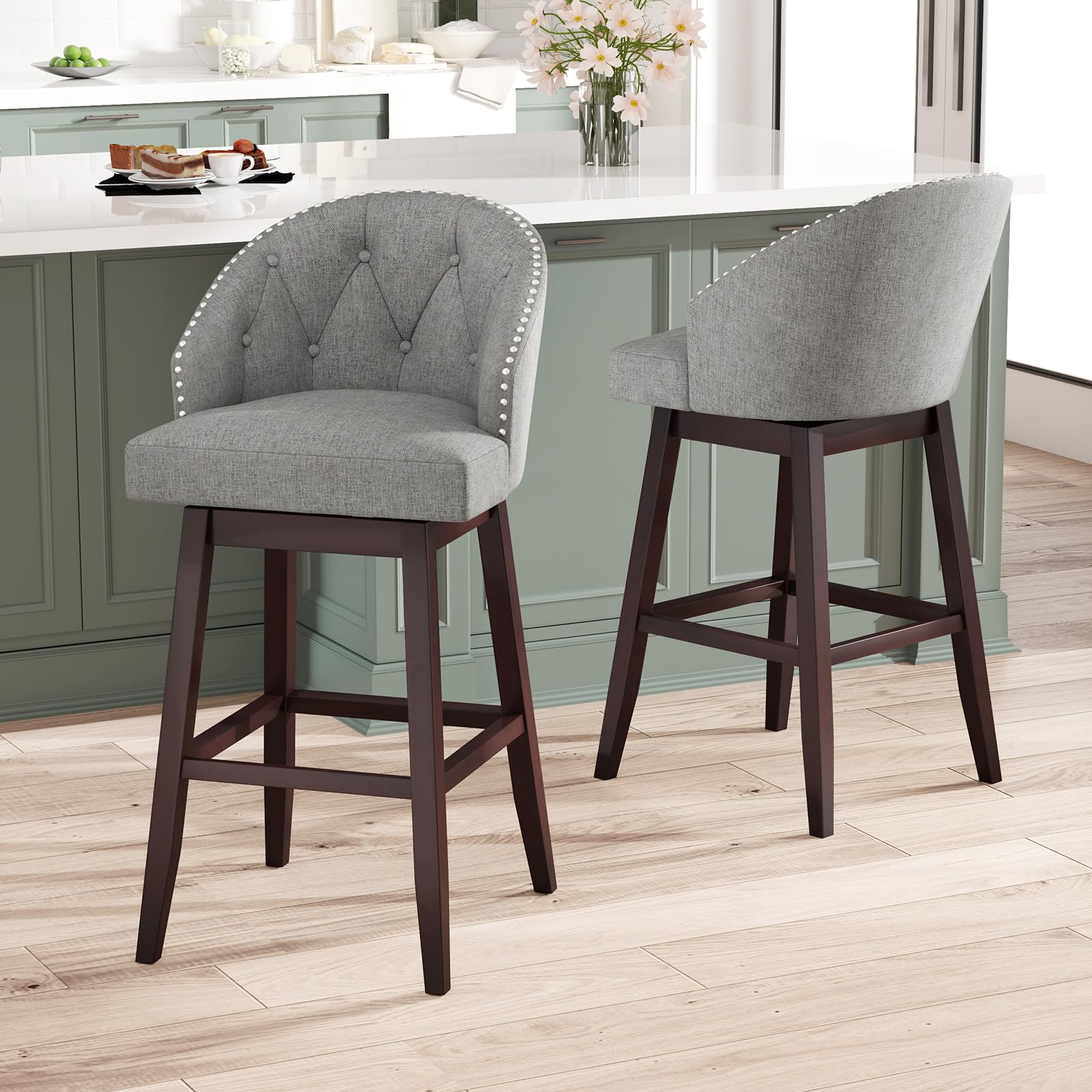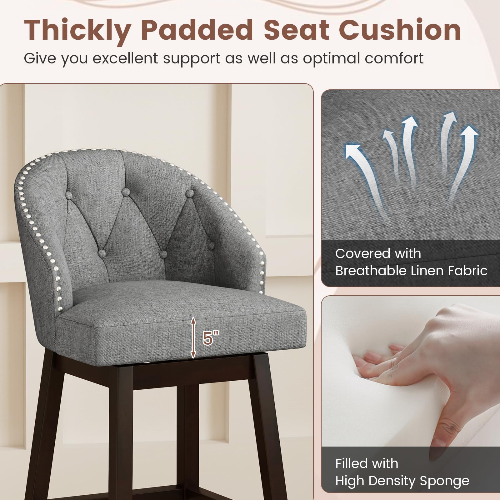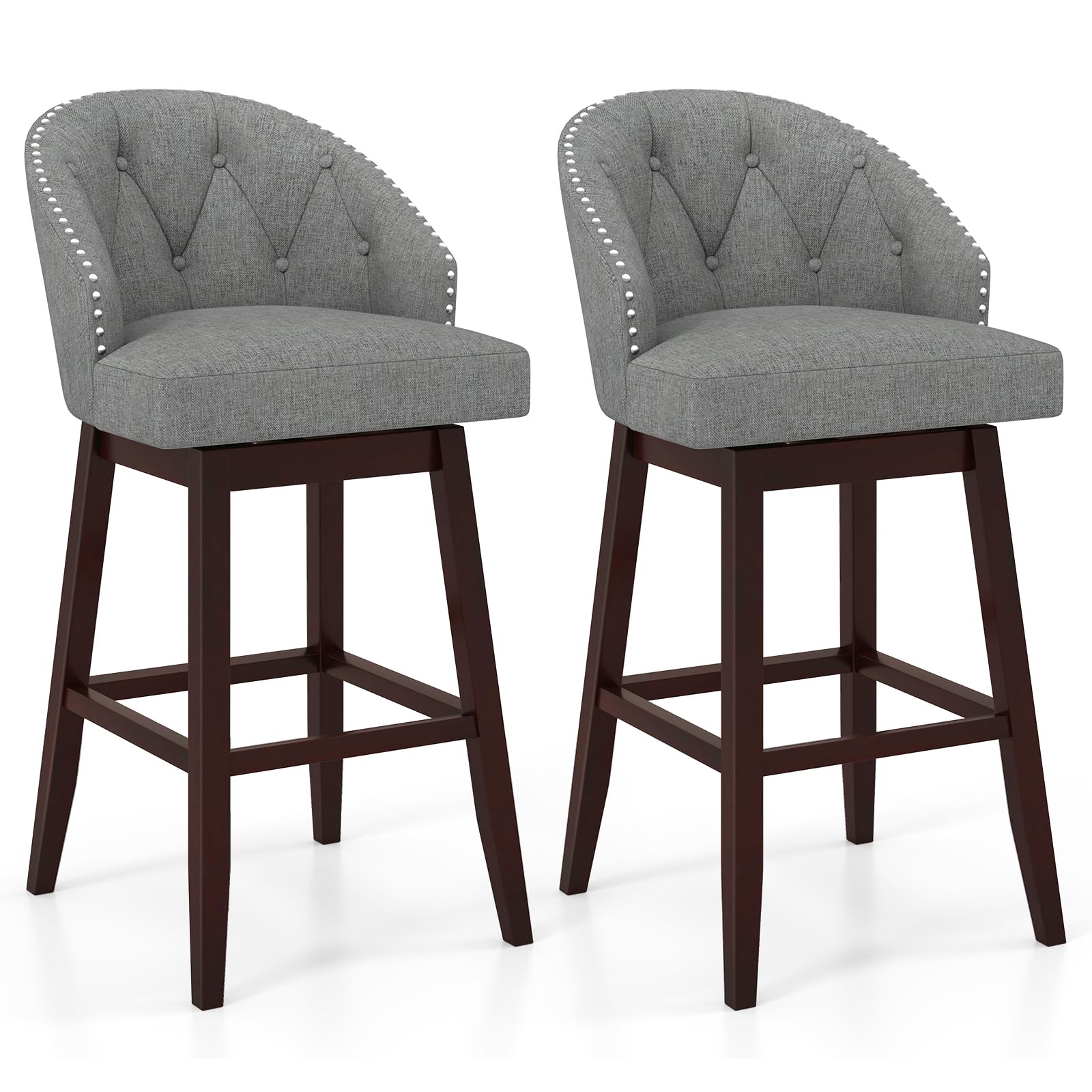 Enjoy luxurious leisure time with our bar stools! These upholstered swivel bar stools will completely exceed your expectations! 360° swivel design enables you to turn around freely. Softly padded seat and back bring you the optimal comfort. Besides that, the sturdy footrest can stably rest your feet. Fitted with solid rubber wood frame and non-slip foot pads, each bar stool can withstand up to 330 lbs without scratching your floor. With stylish button-tufted back and decorative rivets, the mid-century bar stools will bring a touch of elegance to any living space.