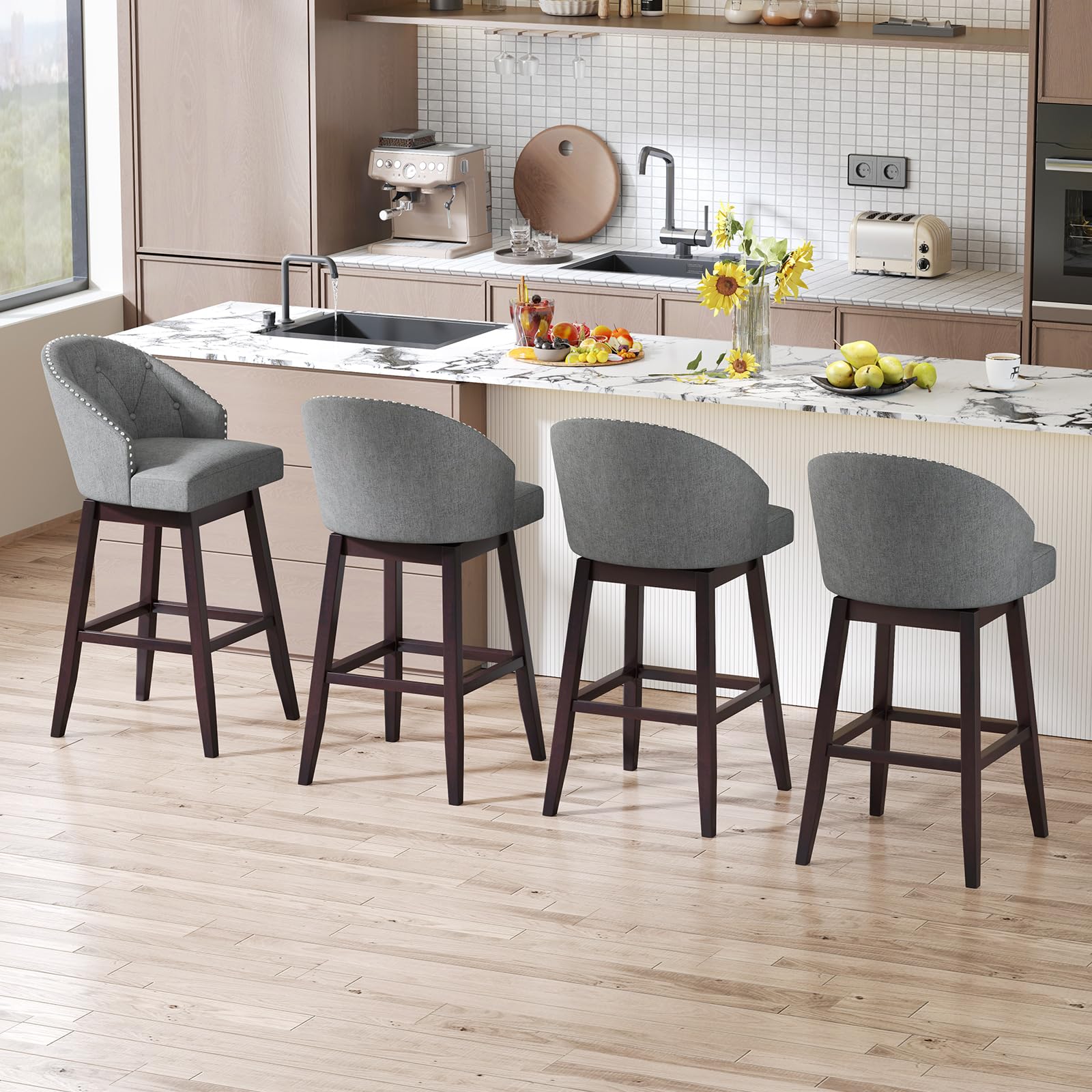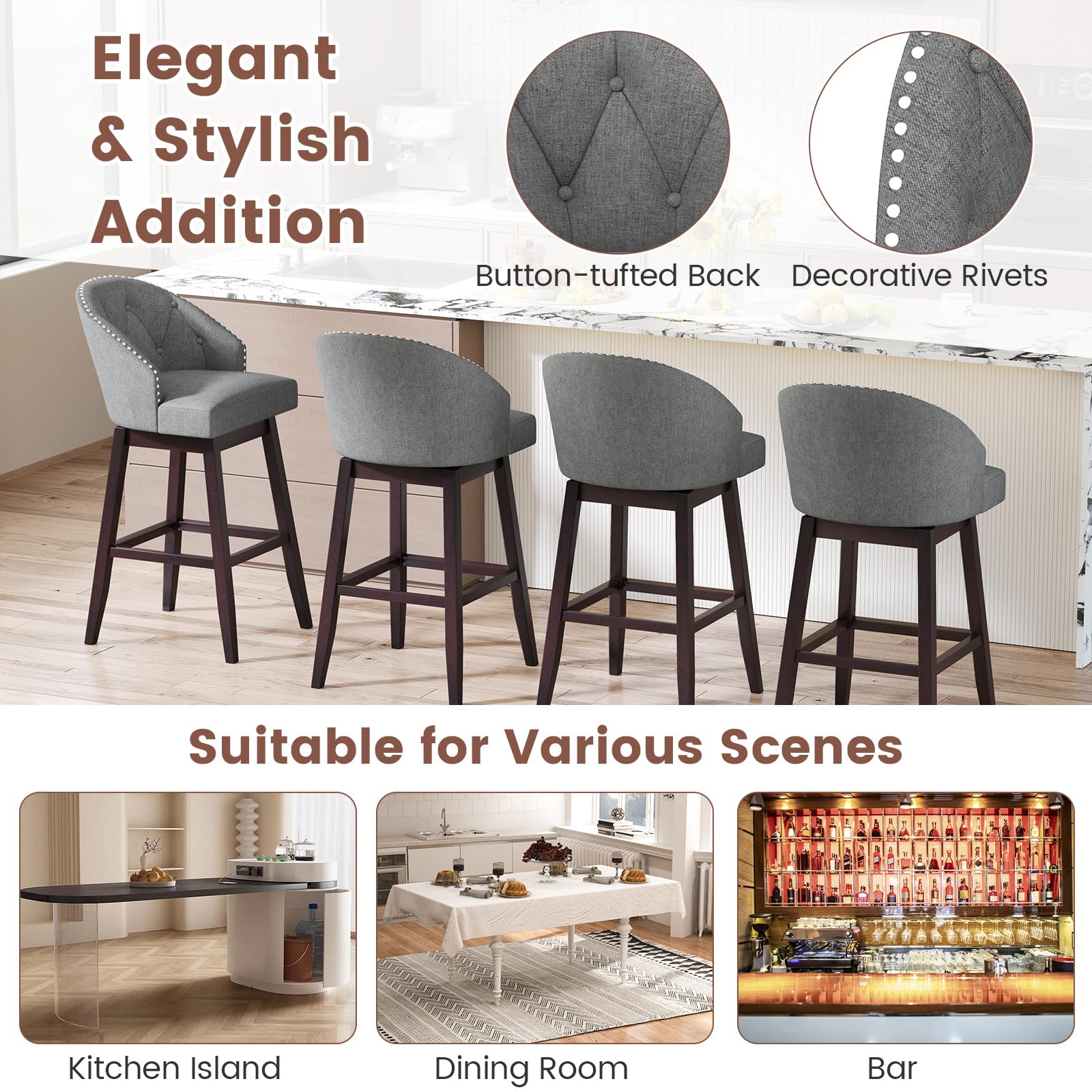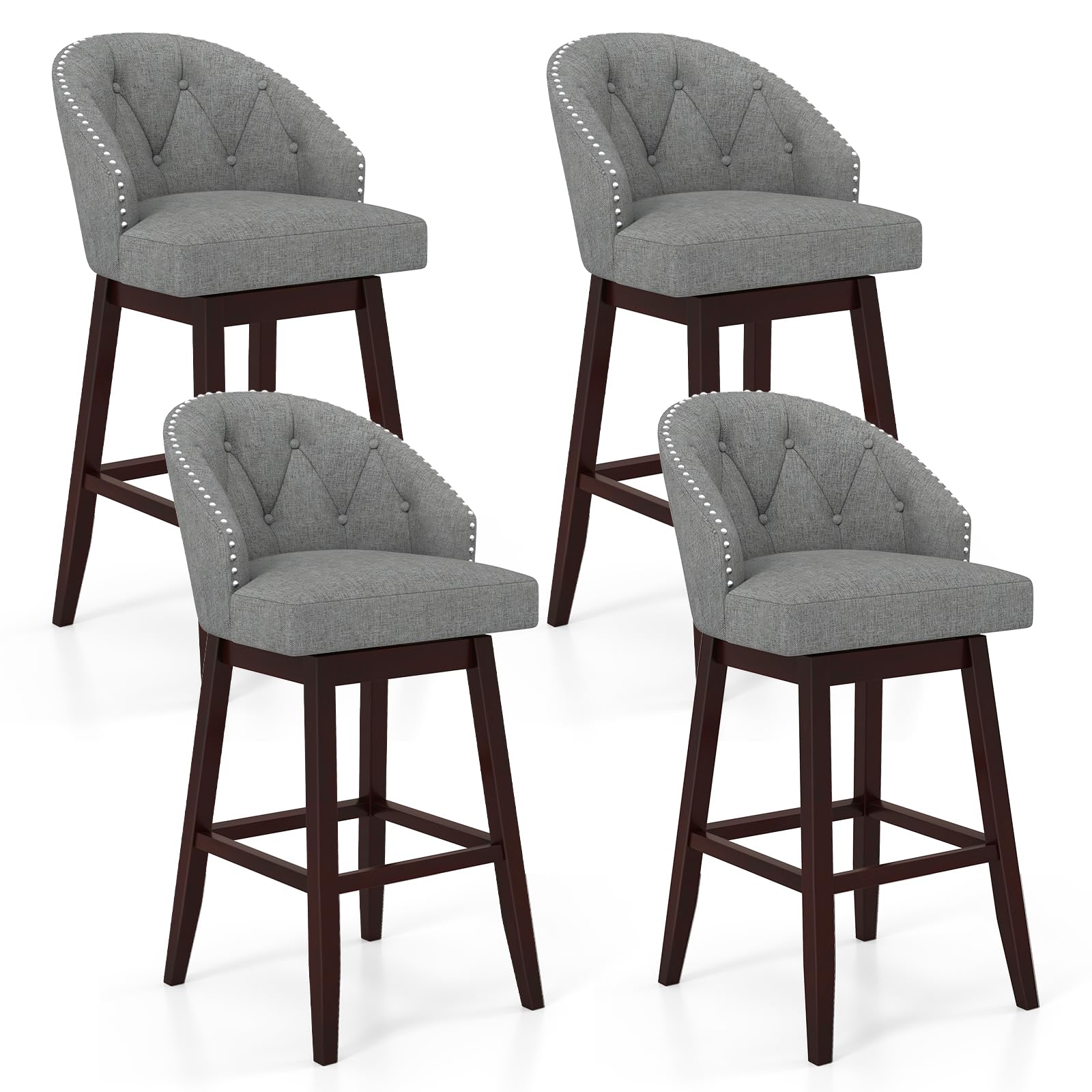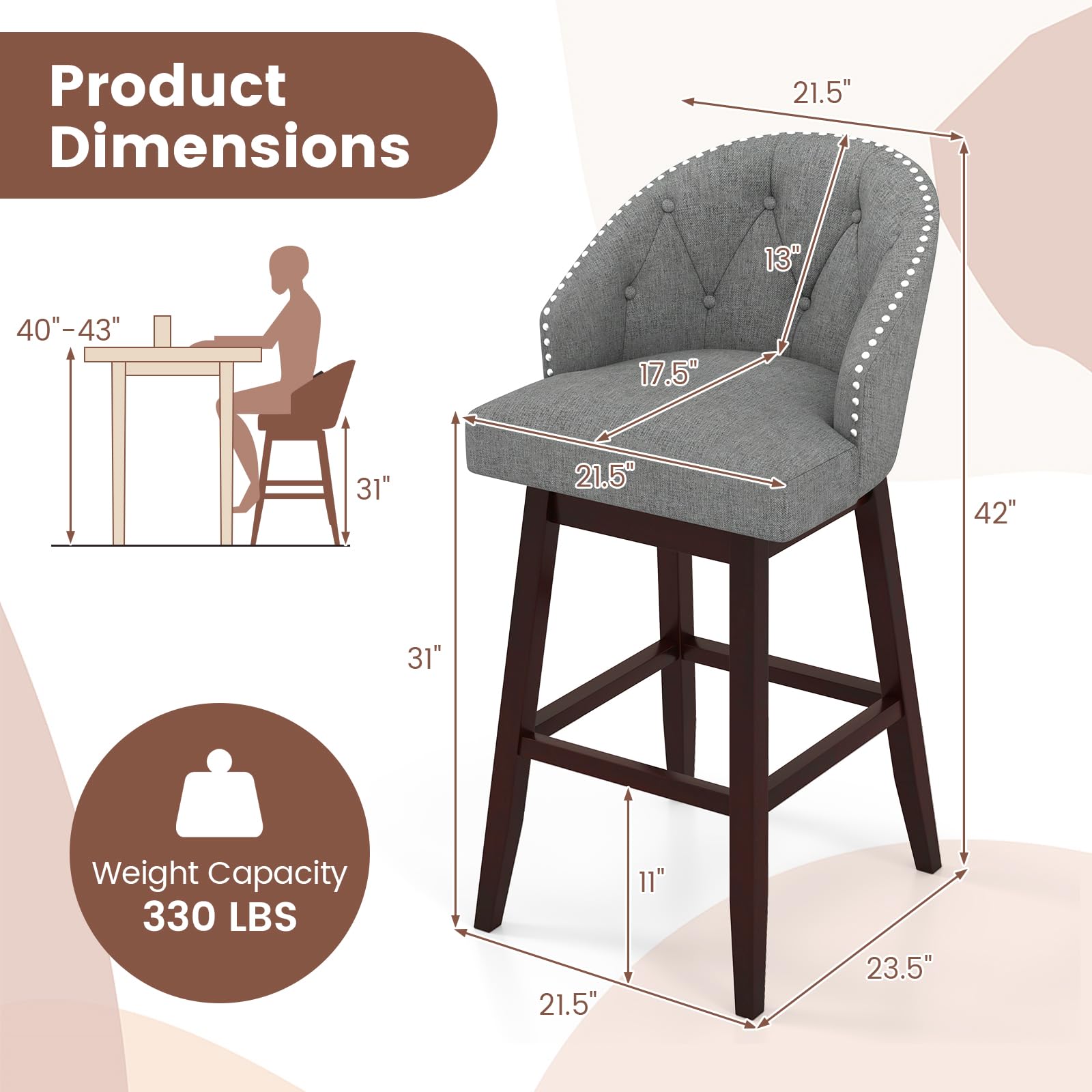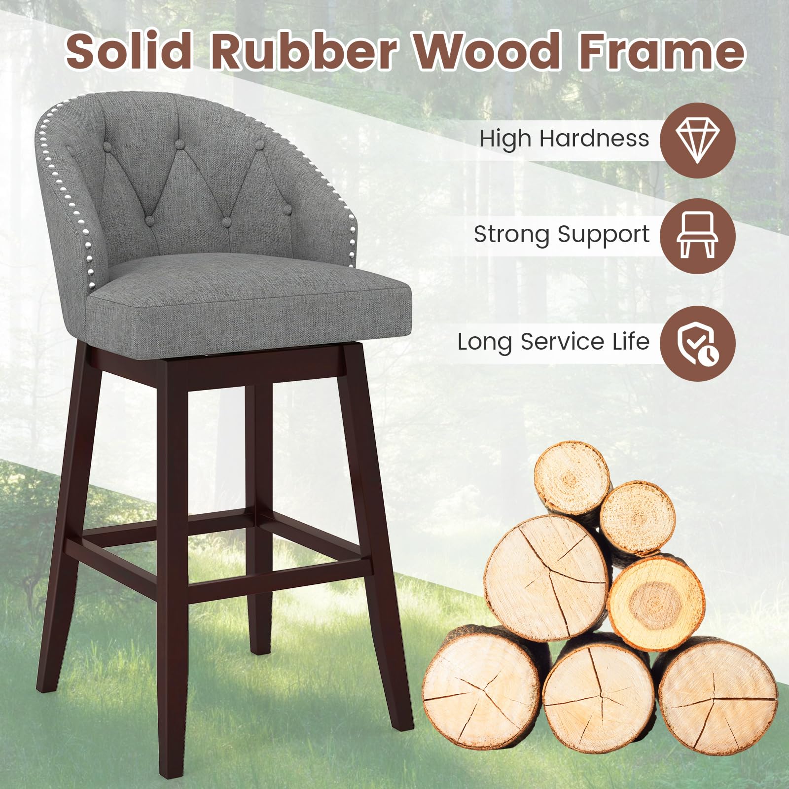 Enjoy luxurious leisure time with our bar stools! These upholstered swivel bar stools will completely exceed your expectations! 360° swivel design enables you to turn around freely. Softly padded seat and back bring you the optimal comfort. Besides that, the sturdy footrest can stably rest your feet. Fitted with solid rubber wood frame and non-slip foot pads, each bar stool can withstand up to 330 lbs without scratching your floor. With stylish button-tufted back and decorative rivets, the mid-century bar stools will bring a touch of elegance to any living space.