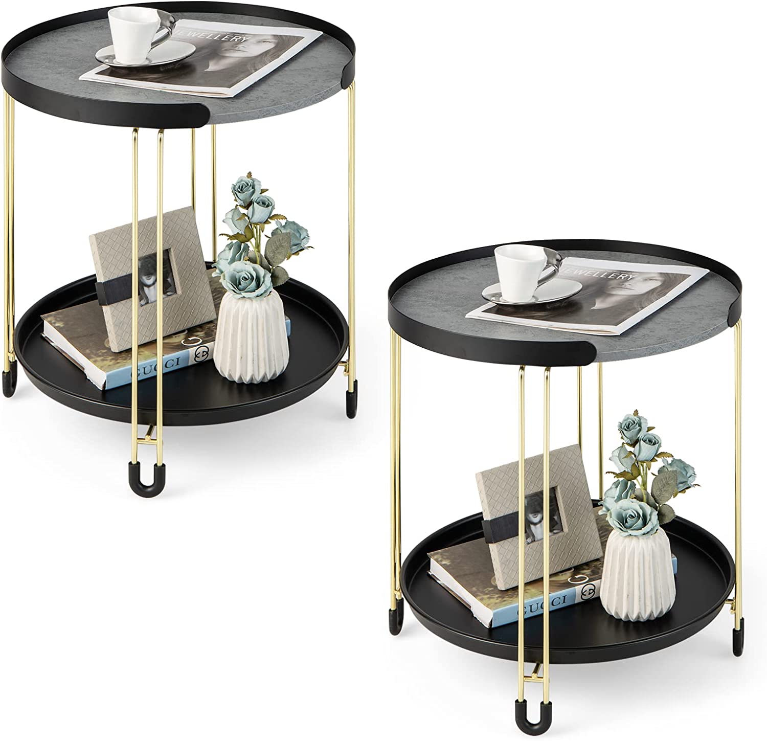 Add the side table to your home as a storage helper and a decoration! 2-tier frame, made of reinforced metal, features excellent sturdiness to hold various items, such as snacks, books, decorations, etc. Especially its top shelf has a 1.5" high edge to keep items in place and a 8" wide gap for easy access. More, it is feasible to directly remove the bottom shelf and use it as a separate food tray. Since the 18" x 18" x 20" (L x W x H) accent end table is fitted with round protective pads, it is safe for multi-scene uses without scratching the floor. When dolomite panel meets gold metal frame, a modern style is highlighted.