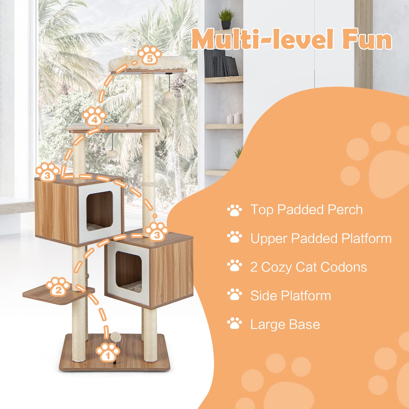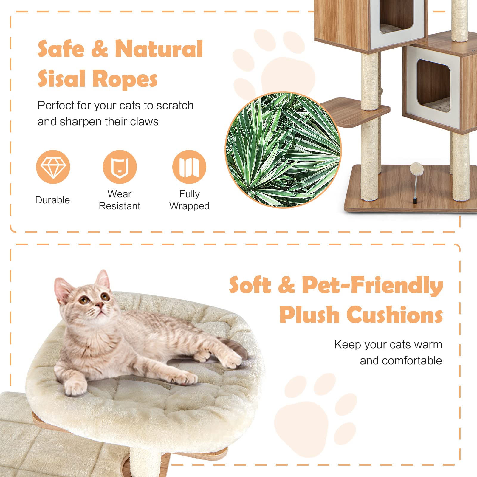 This multi-level cat activity center features 1 perch, 2 condos, 2 platforms, and multiple scratching posts. The high perch is padded with a removable cushion that is soft and plush to the touch, providing a comfortable surface for the cat to play and rest on. And 3 toy balls will add extra fun for cats. This wooden cat tree is made of comfortable plush fabric, thick board, and natural sisal rope, safe and durable for pet use. This stylish cat condo and the tower will blend in nicely with your room decor as a modern piece of cat furniture. Your cats won't have to wait long as you can assemble it quickly and easily with tools and step-by-step instructions.