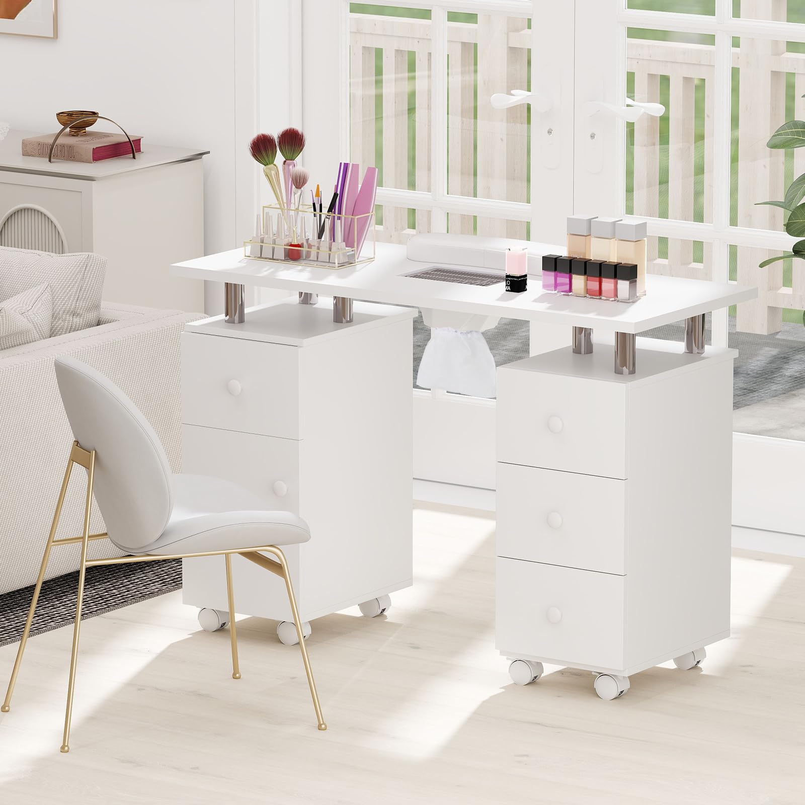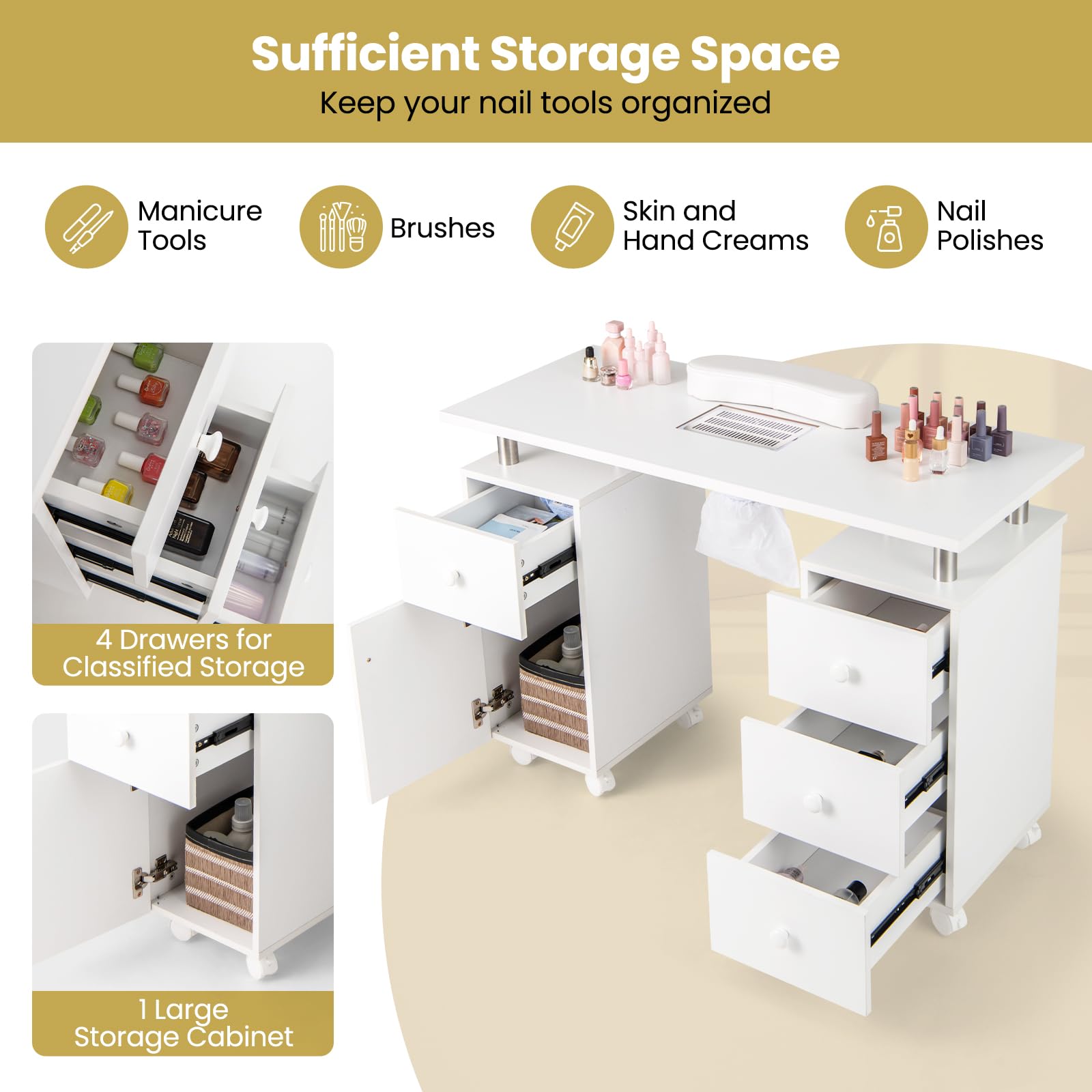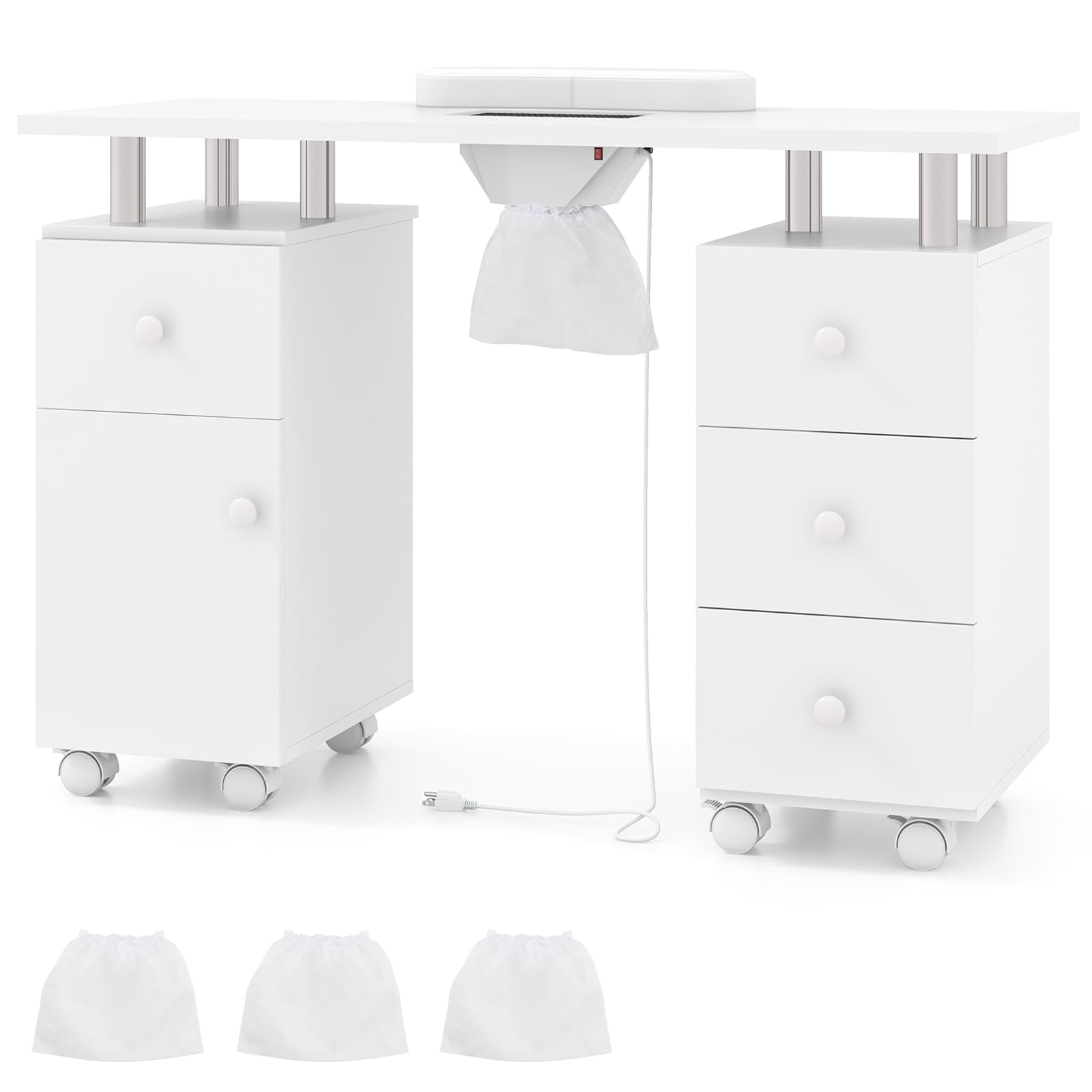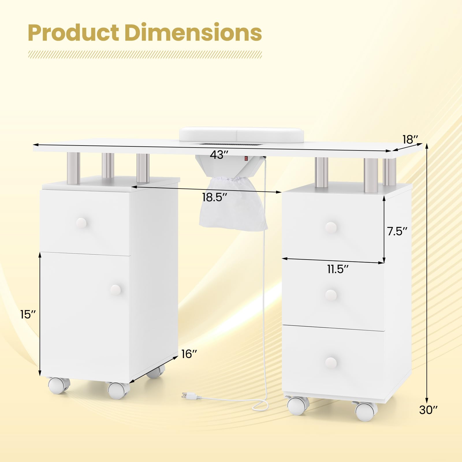 Our premium manicure table is meticulously designed to meet the needs of nail technicians and beauty enthusiasts. Say goodbye to nail dust with the powerful dust collector and 3 reusable dust bags, ensuring a clean and professional workspace. Crafted from a premium acetone-resistant tabletop and a sturdy stainless steel frame, our nail desk is a reliable and practical choice for professional salons and home use. Furthermore, the inclusion of 8 rolling wheels with brakes allows for easy maneuverability within your salon space, while the detachable wrist rest cushion provides comfort for your clients during nail treatments. Additionally, the nail art workstation features 1 large storage cabinet and 4 drawers for classified storage, keeping your nail tools organized and easily accessible.