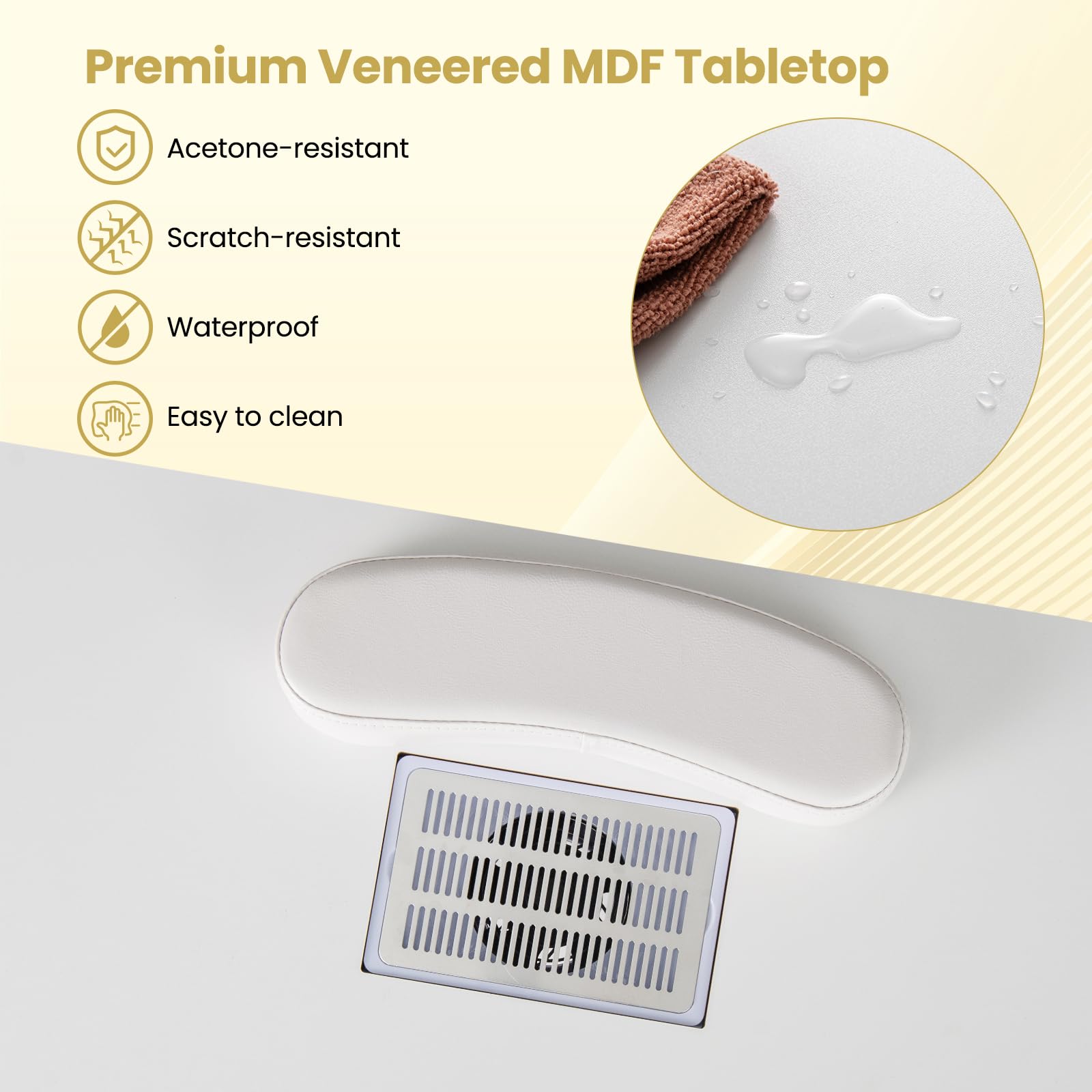 Durable MDF tabletop resists acetone, scratches, and water damage