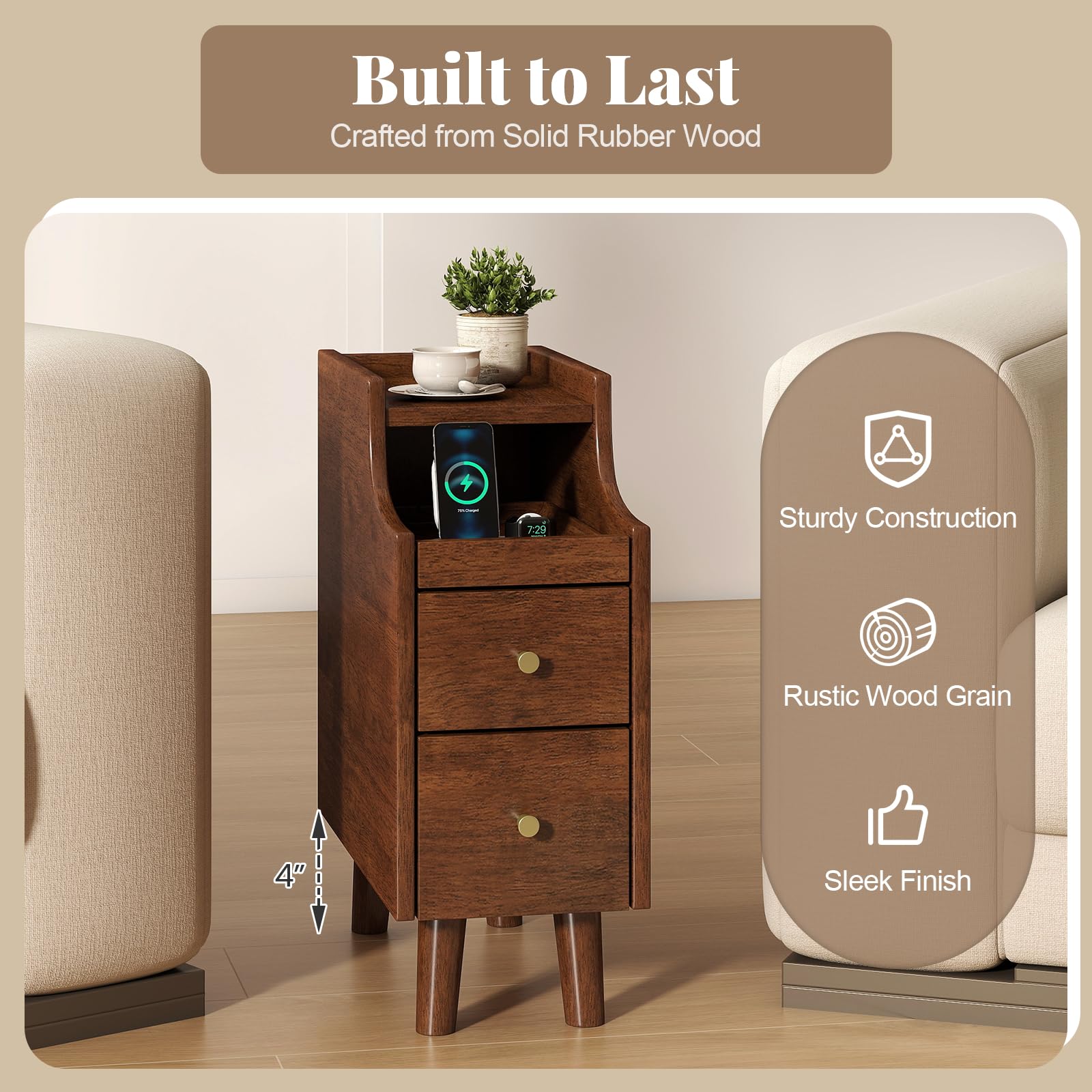 Transform your cramped space into a stylish sanctuary with our ultra-slim, elegantly designed nightstand! Just 8” wide, this skinny nightstand fits effortlessly in small spaces beside your bed or couch, blending functionality with flair. Crafted from robust rubber wood and sturdy plywood, it boasts high strength and a chic presence for years to come. It’s not just about looks; this narrow bedside organizer offers smart storage solutions—a handy pull-out tray for your essentials and 2 spacious drawers to stash away the clutter. Featuring a breeze-easy cable management system and safety-enhancing raised edges, it’s the pinnacle of user-friendly design. Enhanced with natural wood grain and trendy golden knobs, this small nightstand brings a slice of sophistication to any space. Perfect for enhancing tiny spaces with both charm and order!