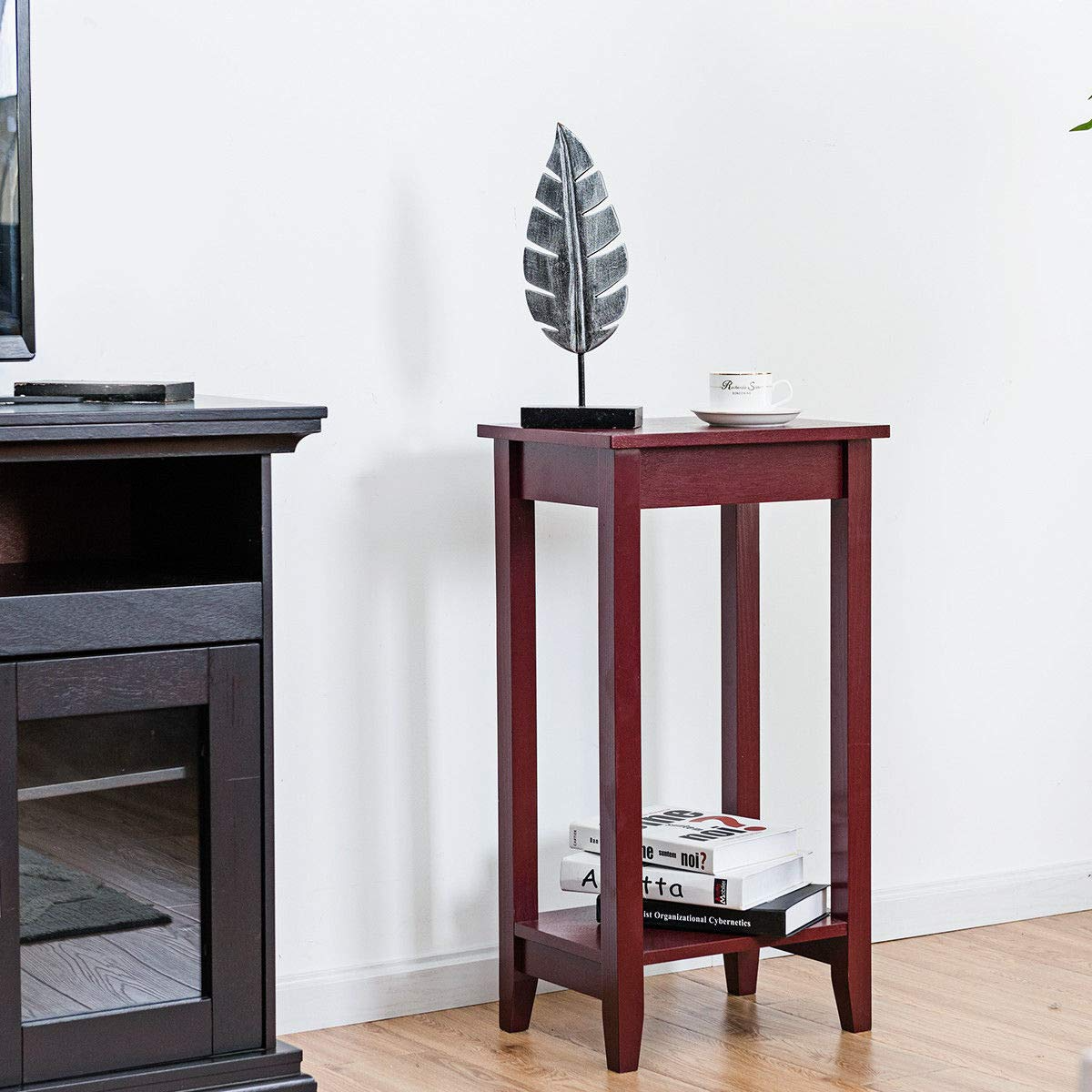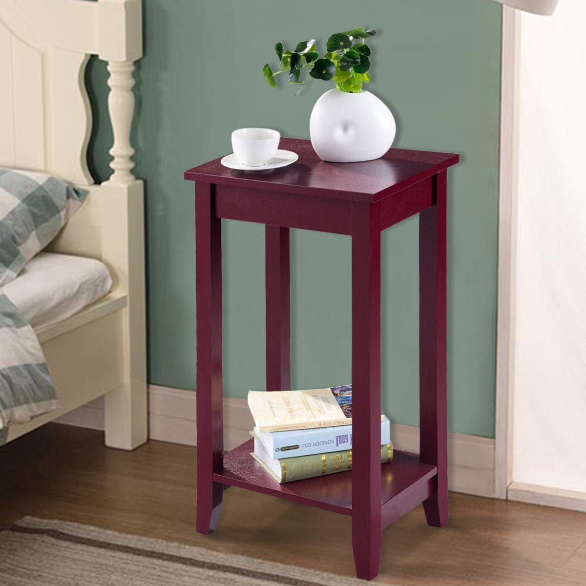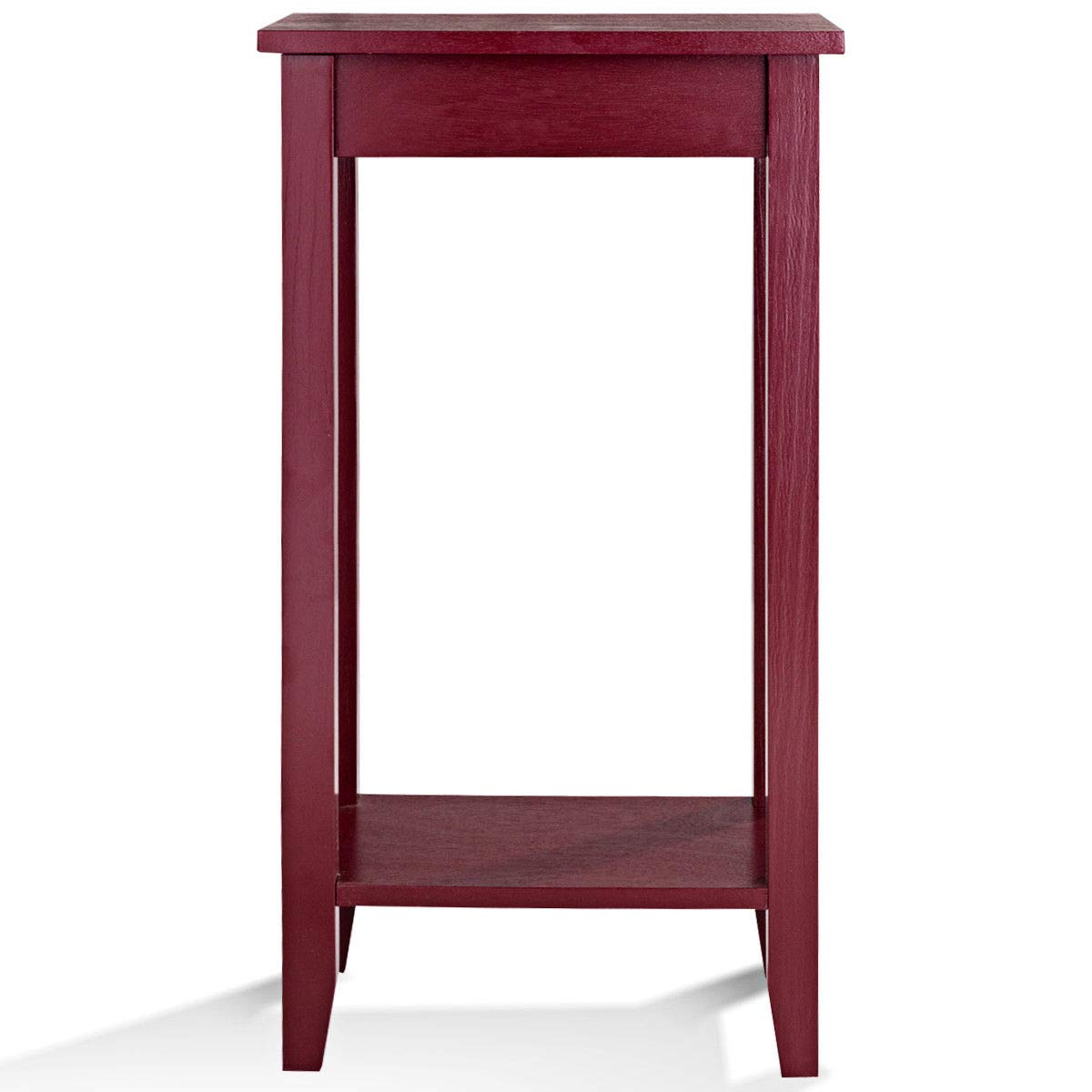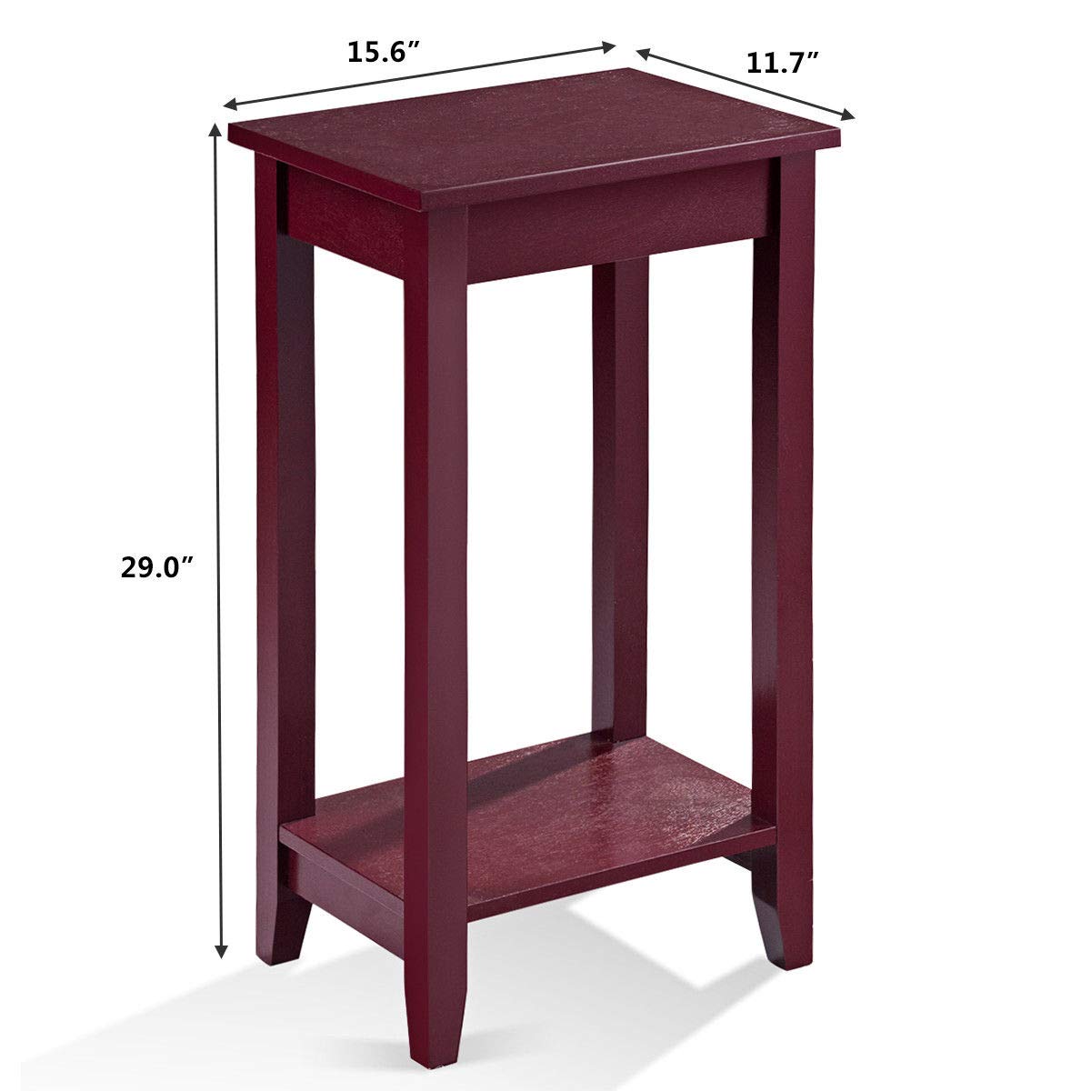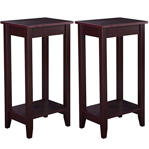 Tall, lean, and lovely! Wood tall end table brings a unique and charming design element to any room. The size of the tabletop is the perfect balance between functional and space-saving and the lower shelf provides additional space for accent pieces or other small items. Made from a combination of solid wood and wood veneer, the end table will not wobble, warp, or split. Its above-average height and narrow legs make the solid wood tall end table above all others.