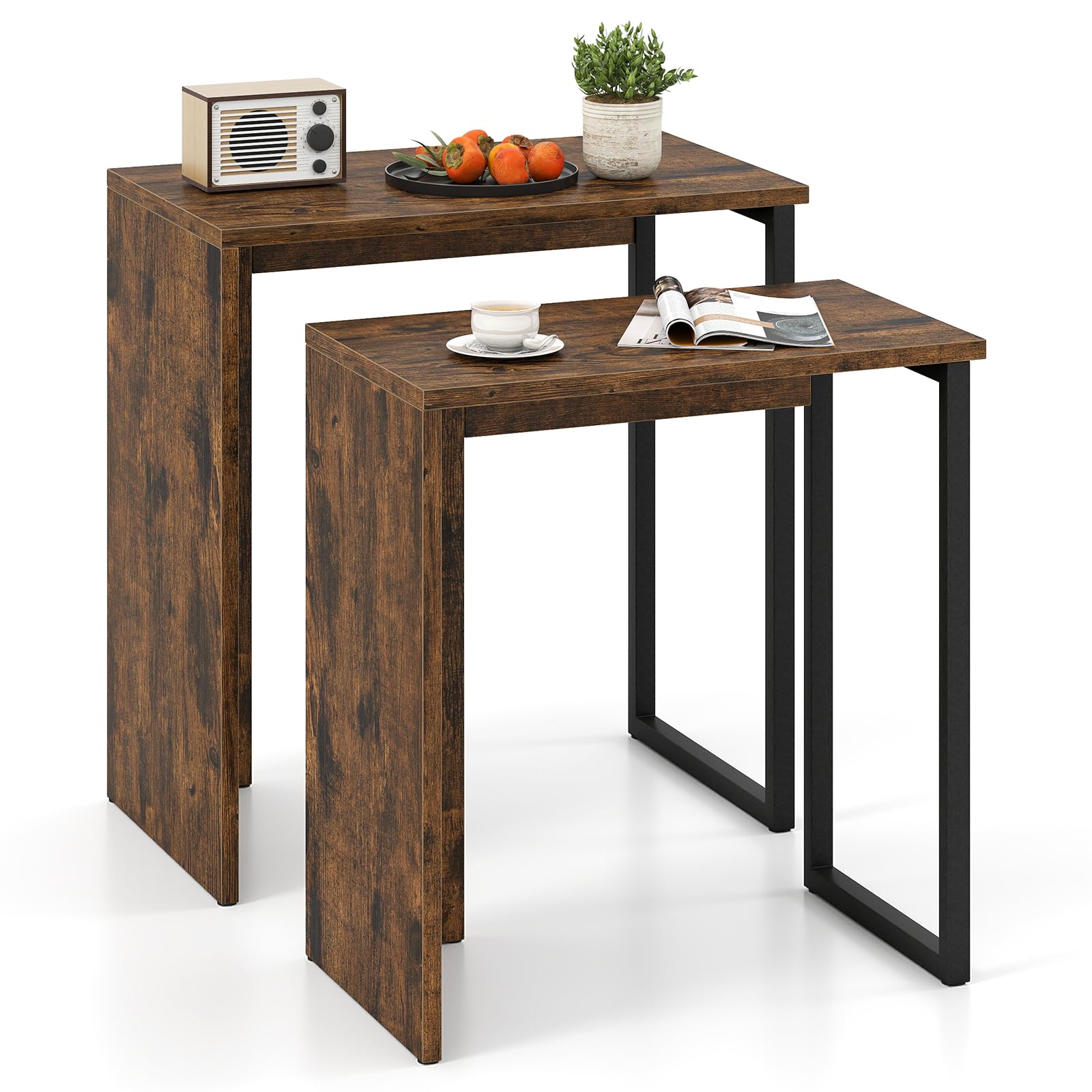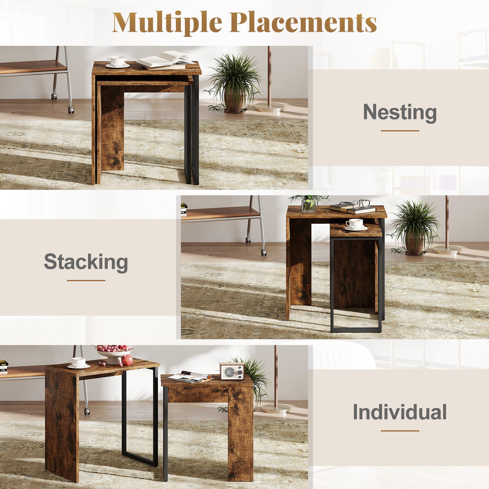 The larger and smaller rectangle tables can be artistically arranged together in various shapes or used separately, adapting effortlessly to your changing decoration needs and spatial arrangements. Besides, each side table boasts a robust metal frame with firm connections and anti-slip foot pads, ensuring stability and longevity while protecting your floors from damage. Moreover, they are ideal for use as coffee tables, nightstands, or end tables in your living room, bedroom, or entryway. Plus, the industrial look enhances your interior with an air of sophisticated elegance.