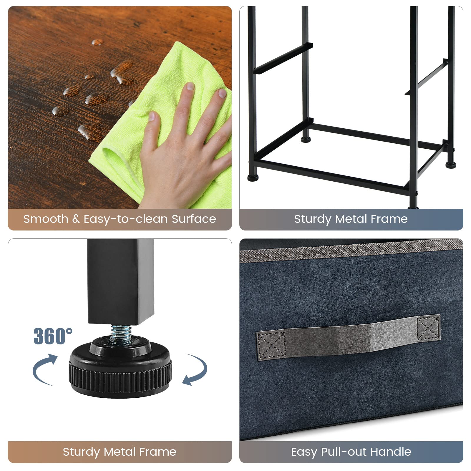 With durable board and a sturdy metal frame, this clothes organizer is suitable for long-time service. What's more, it offers 2 deep drawers to keep daily items. Plus, the non-woven fabric drawers are removable and foldable, bringing you a lot of conveniences. You can place the simple style storage tower in the bedroom, closet, or other places, and take it as a nightstand, end table, etc., to meet different demands.