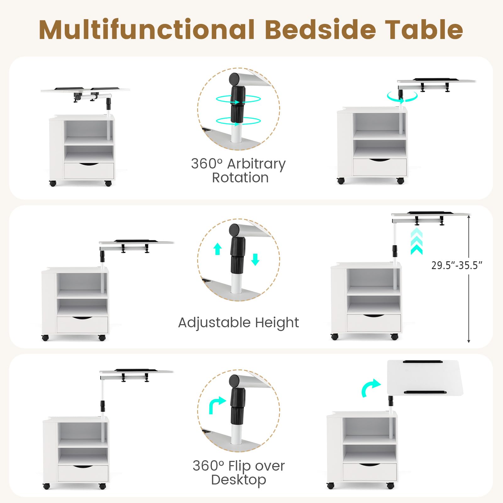 - [Multifunctional Bedside Table]: The laptop tray with 360 arbitrary rotation can also go up and down with a height range of 29"-35.5" capable of catering to different people. Besides, a 360-degree flip-over desktop offers a more comfortable working experience whether on the sofa or the bed.