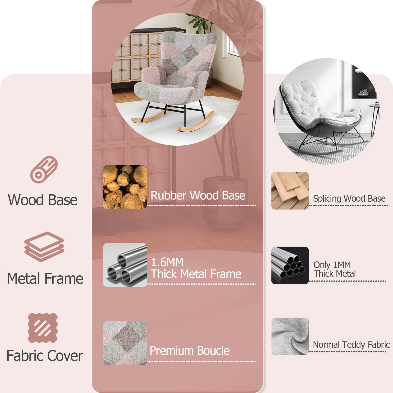 Indulge in ultimate relaxation with our rocking chair. Engineered for soothing calm with a gentle rocking motion, this armchair boasts cloud-like comfort with high-density sponge filling and plush boucle fabric. Its ergonomic design supports correct posture, while the heavy-duty metal frame provides rock-solid stability. Perfect for nurseries, living rooms, study rooms or offices, this versatile rocking chair seamlessly blends into any decoration. Complete with a side pocket for convenient storage, this accent chair is the perfect combination of comfort, style, and functionality. Treat yourself to a luxurious seating experience with our premium rocking chair.