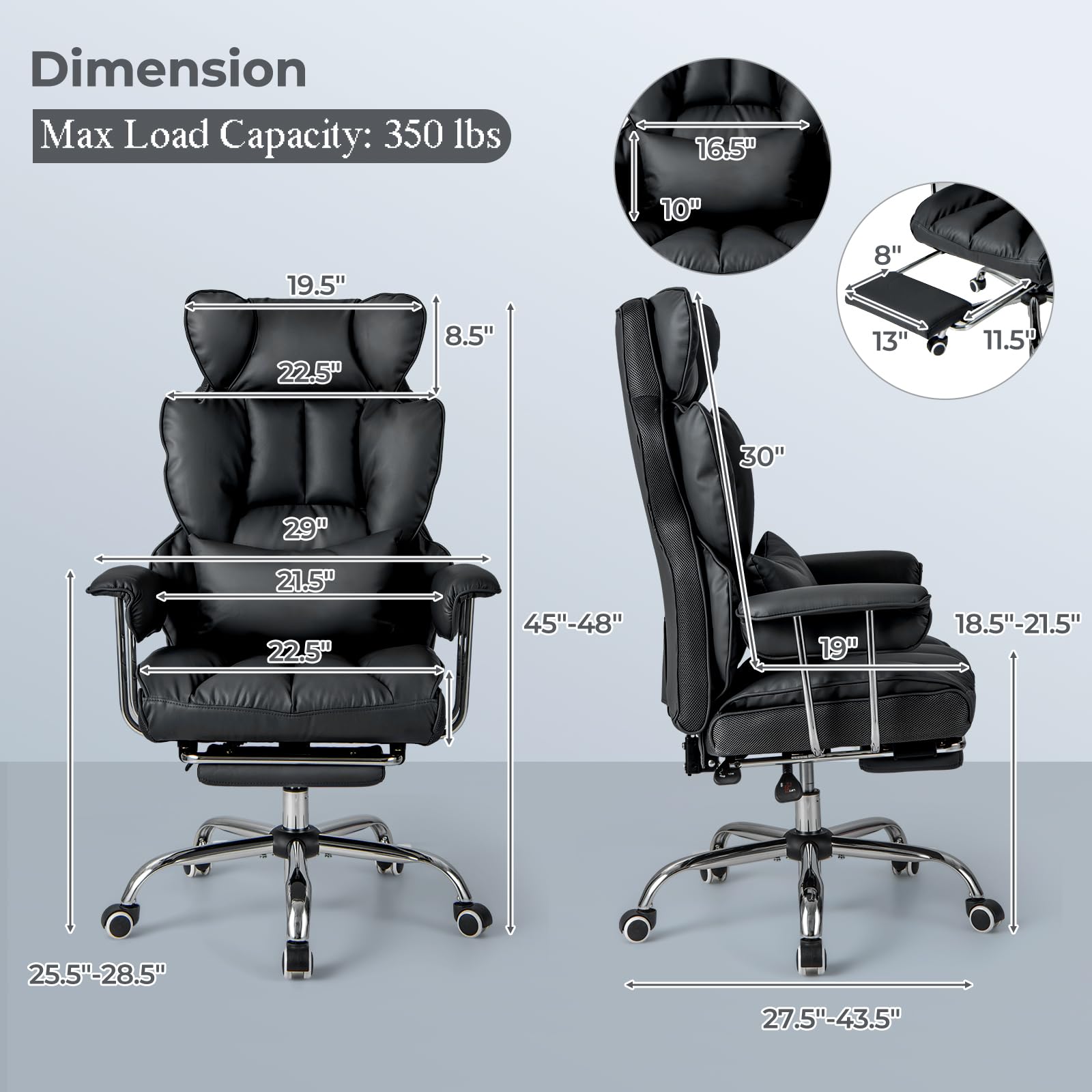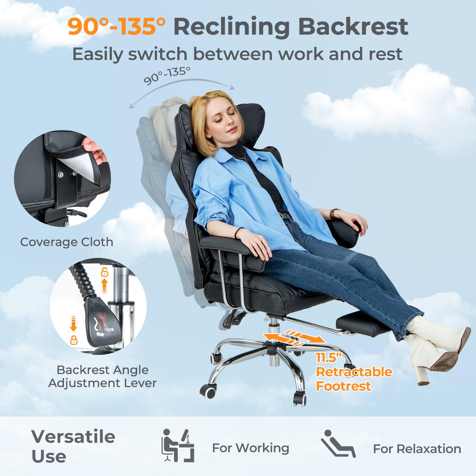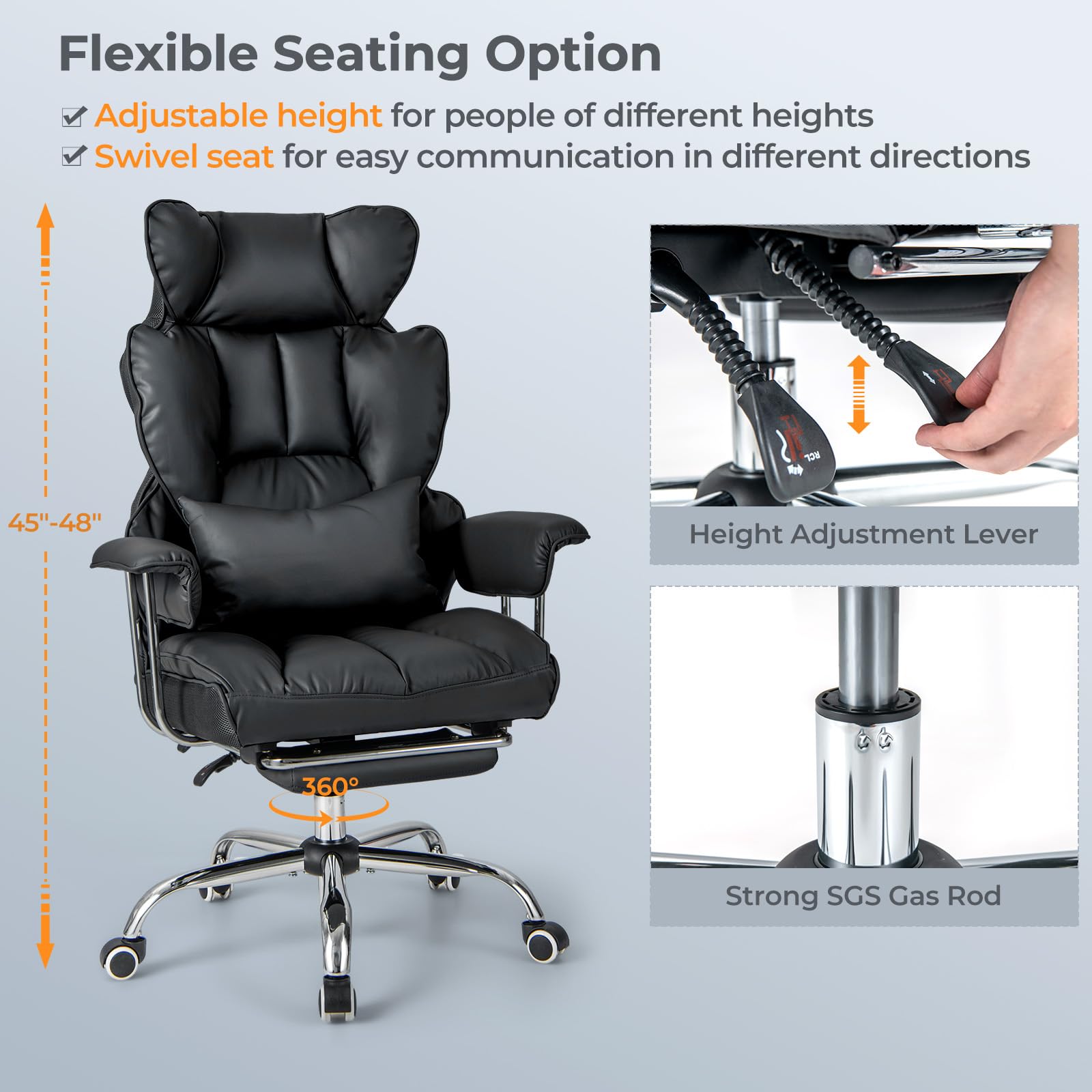 Its 90°-135° reclining backrest and adjustable seat height allow you to find the perfect position for working. Sink into the thick sponge padding PU leather, complete with headrest and backrest wings for unparalleled comfort. The ergonomic design includes padded armrests and a retractable footrest, taking your comfort to the next level. Easily engage in conversations from different angles with the swivel seat, while the 5 universal wheels make it easy to move to different rooms. With its heavy-duty SGS gas rod and 5-claw metal base, stability and a substantial 350 lbs load capacity are ensured. The executive chair is the ideal companion for both productive work sessions and refreshing breaks.