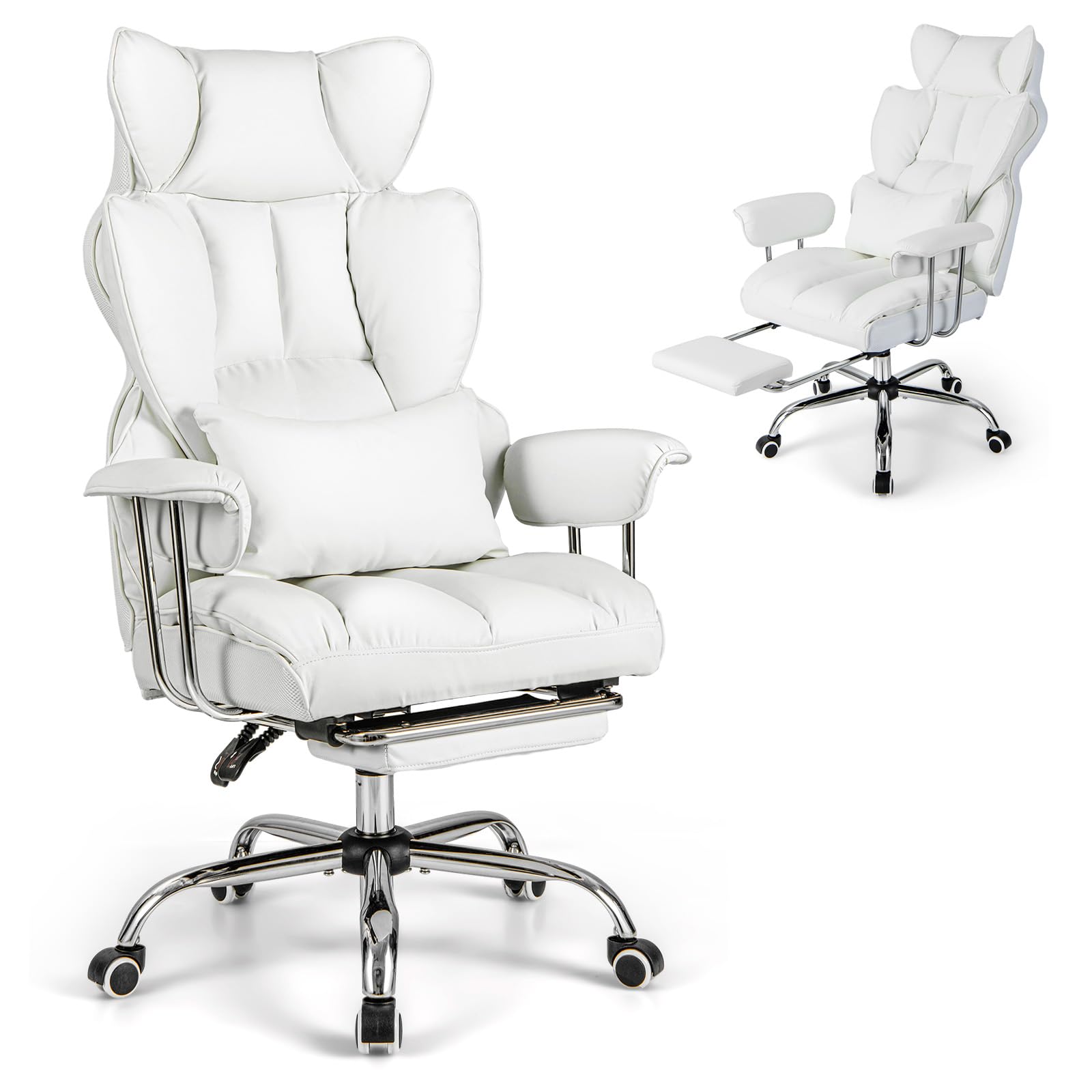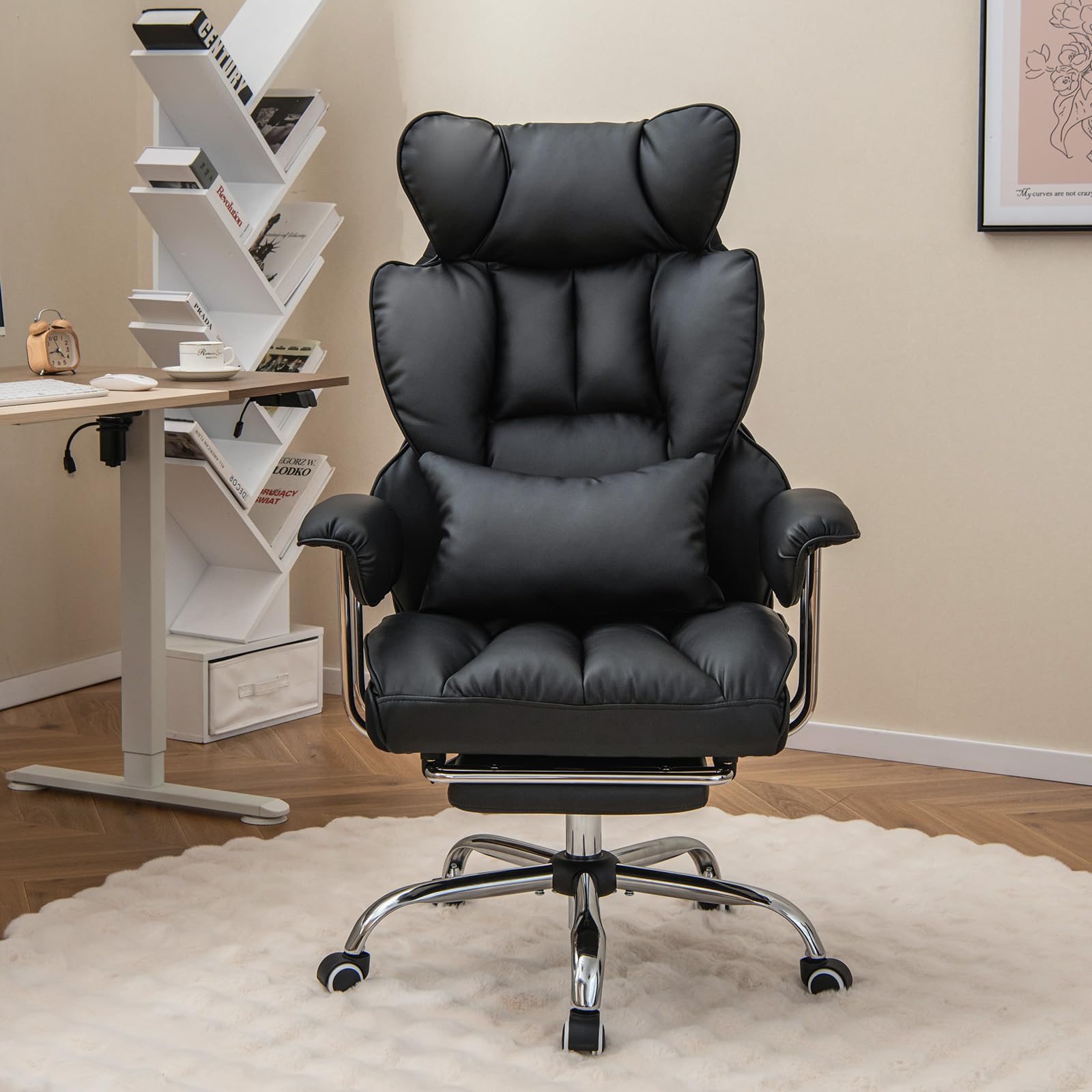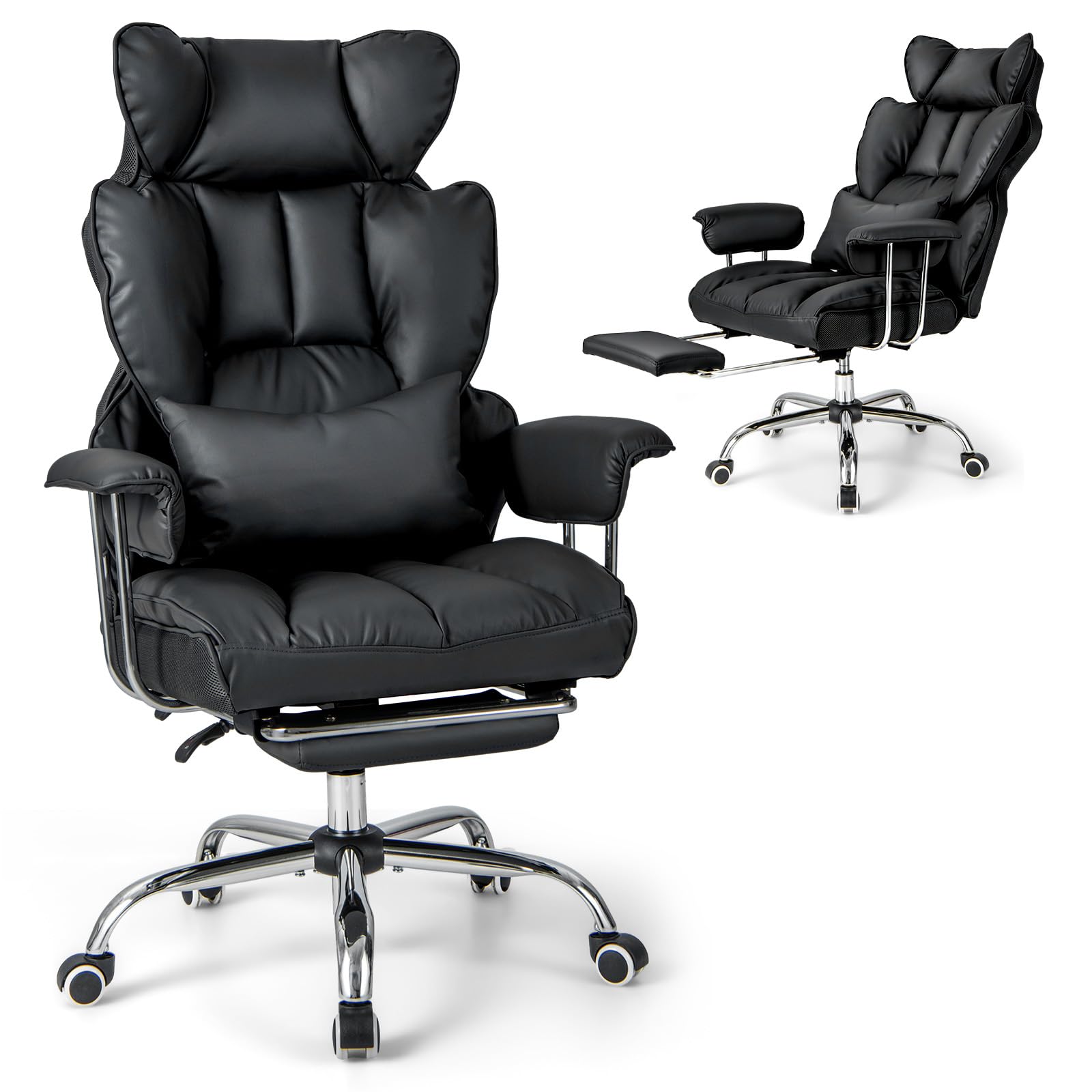Its 90°-135° reclining backrest and adjustable seat height allow you to find the perfect position for working. Sink into the thick sponge padding PU leather, complete with headrest and backrest wings for unparalleled comfort. The ergonomic design includes padded armrests and a retractable footrest, taking your comfort to the next level. Easily engage in conversations from different angles with the swivel seat, while the 5 universal wheels make it easy to move to different rooms. With its heavy-duty SGS gas rod and 5-claw metal base, stability and a substantial 350 lbs load capacity are ensured. The executive chair is the ideal companion for both productive work sessions and refreshing breaks.