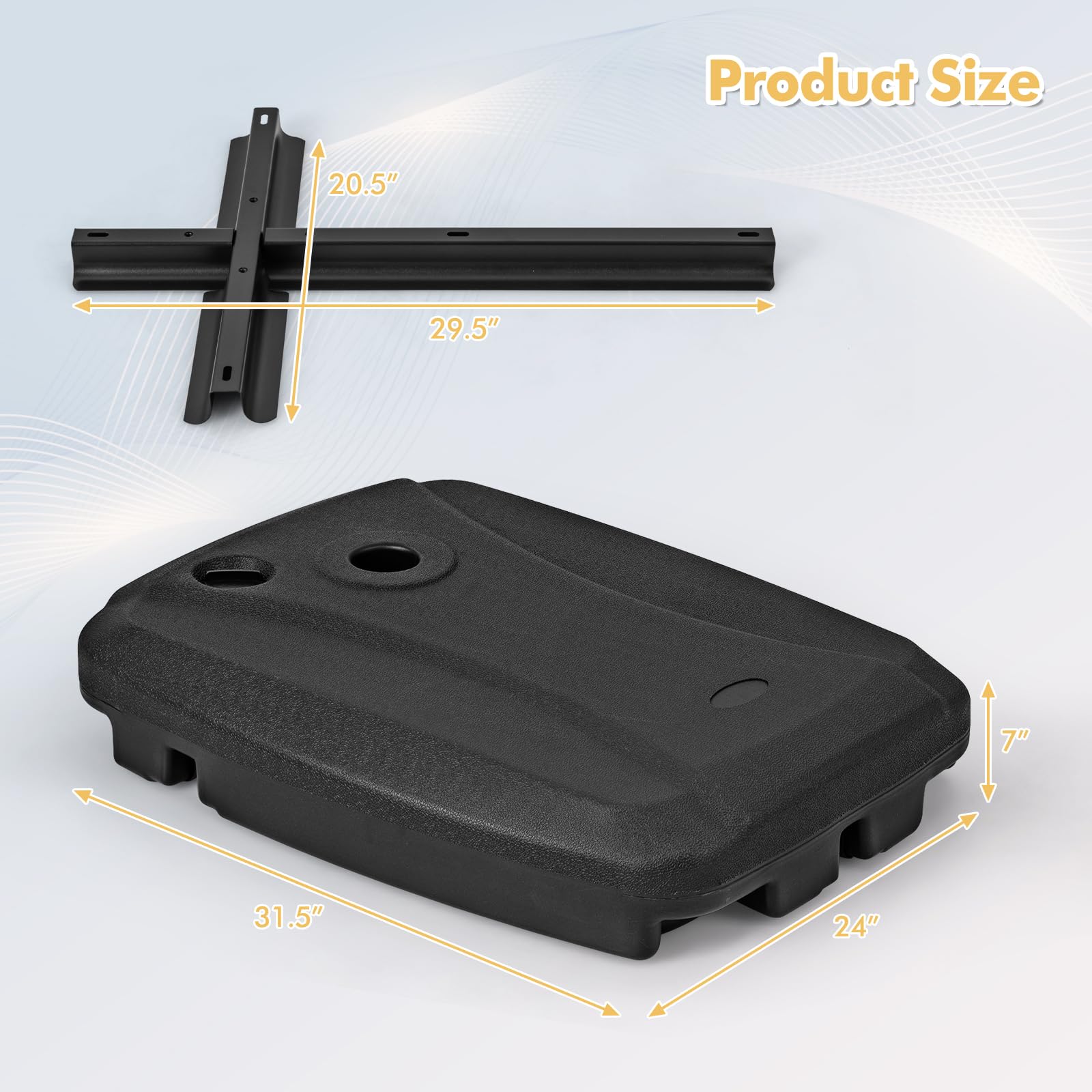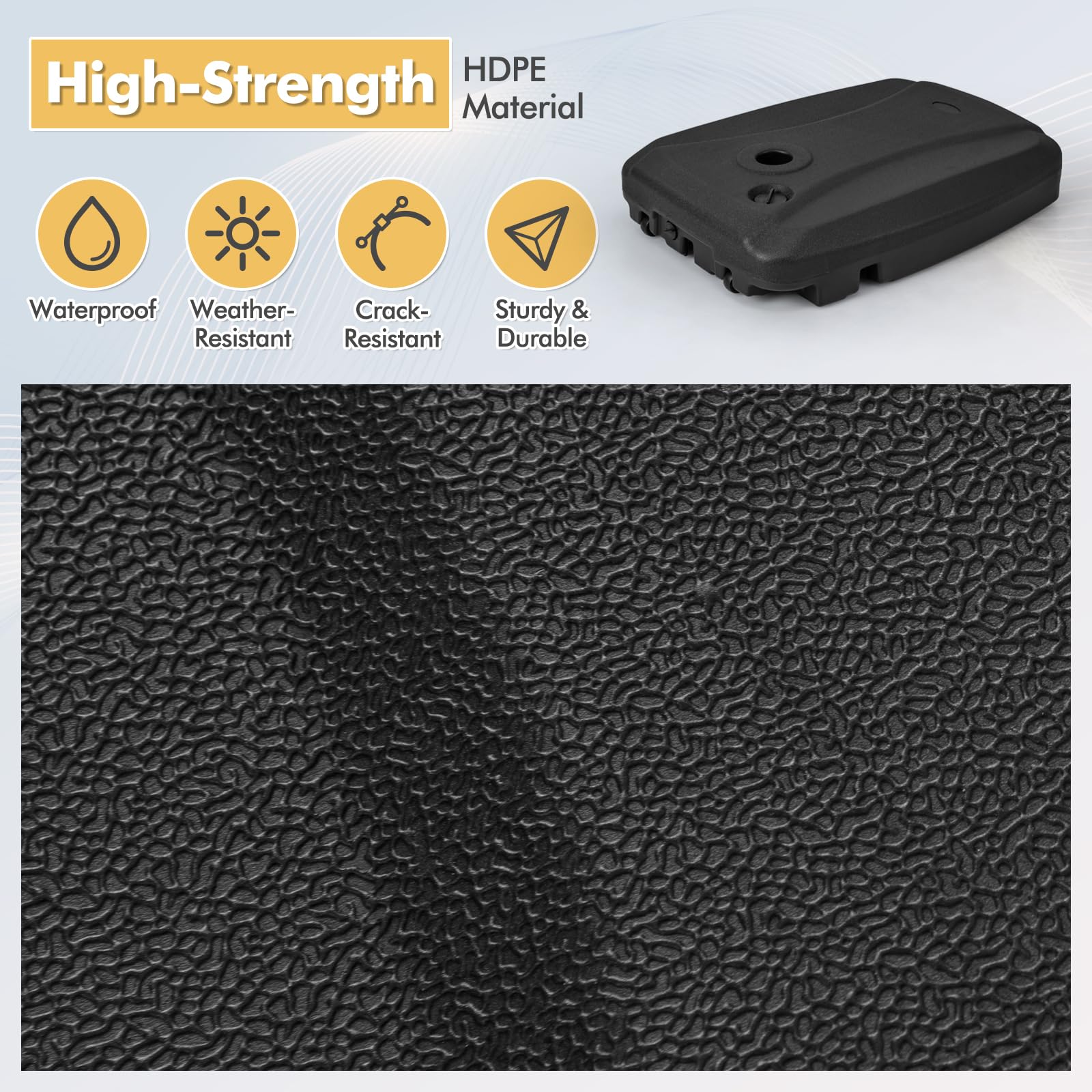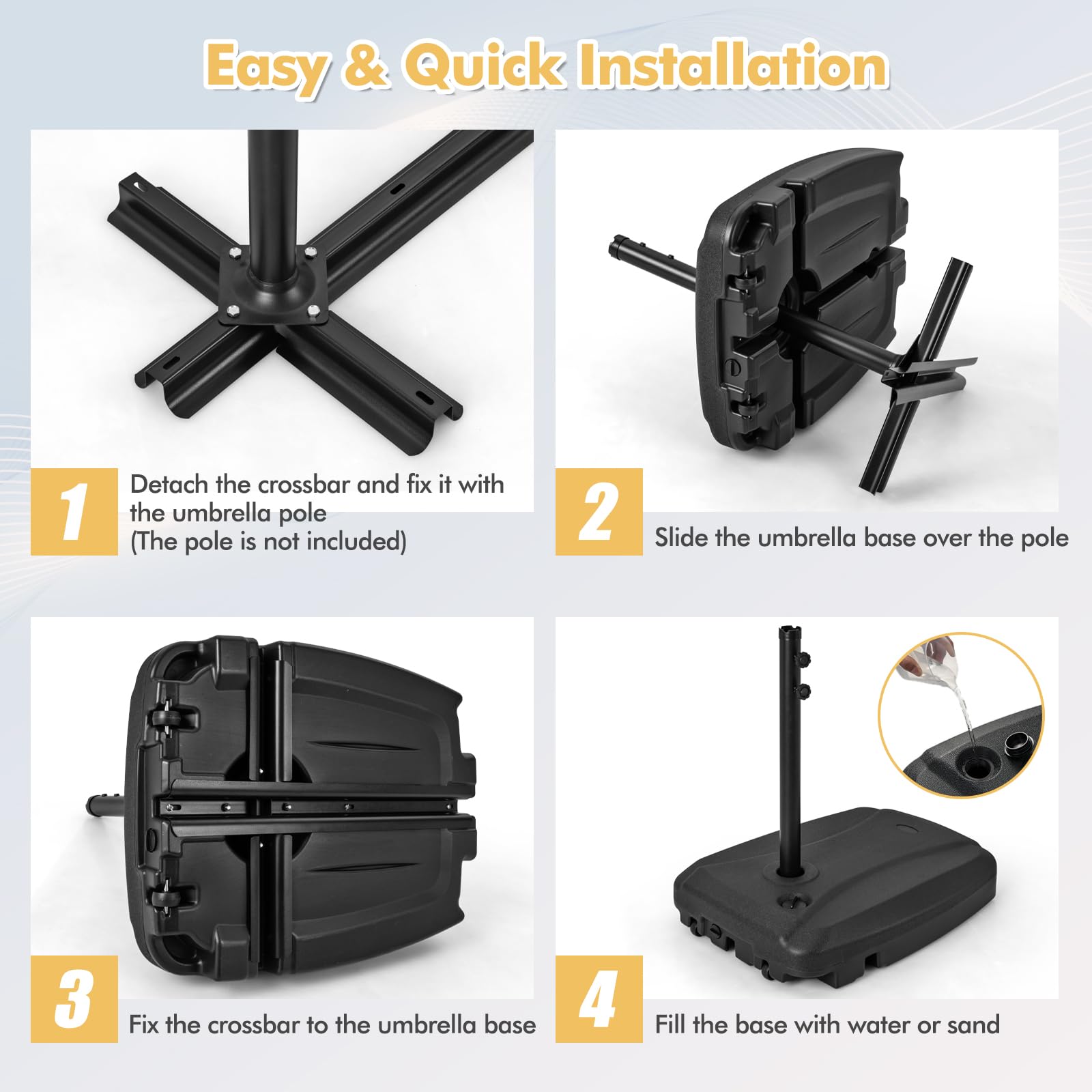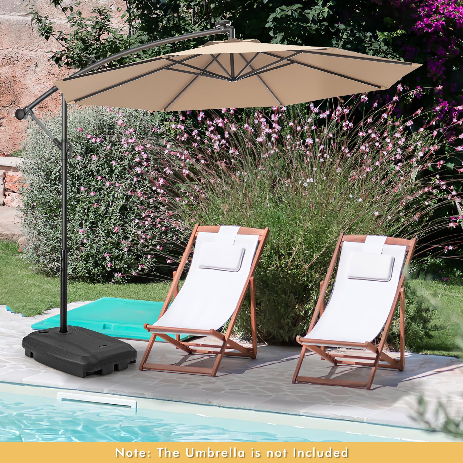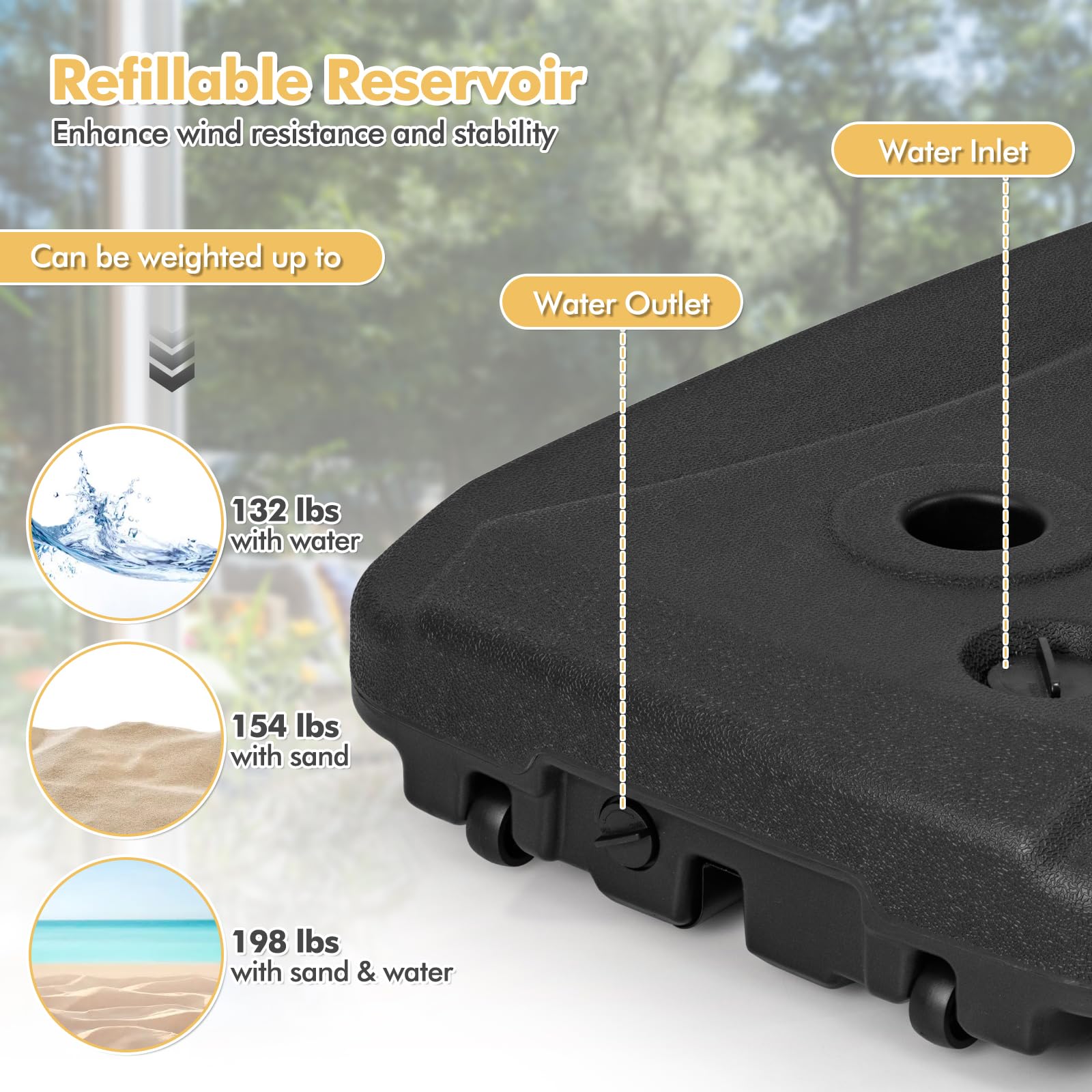This umbrella base stand is designed for offset umbrella poles up to 1.9" in diameter, featuring a crossed stand to securely hold the umbrella pole (pole not included). For added stability in windy conditions, the base can be filled with up to 132 lbs of water, 154 lbs of sand, or 198 lbs of water and sand. Crafted from durable HDPE material, it is weather-resistant, waterproof, and crack-resistant, providing a dependable support for your umbrella year after year. With built-in wheels and carrying handles, you can effortlessly transport your umbrella wherever you go. Perfect for poolside relaxation, backyard gatherings, or any outdoor occasion.