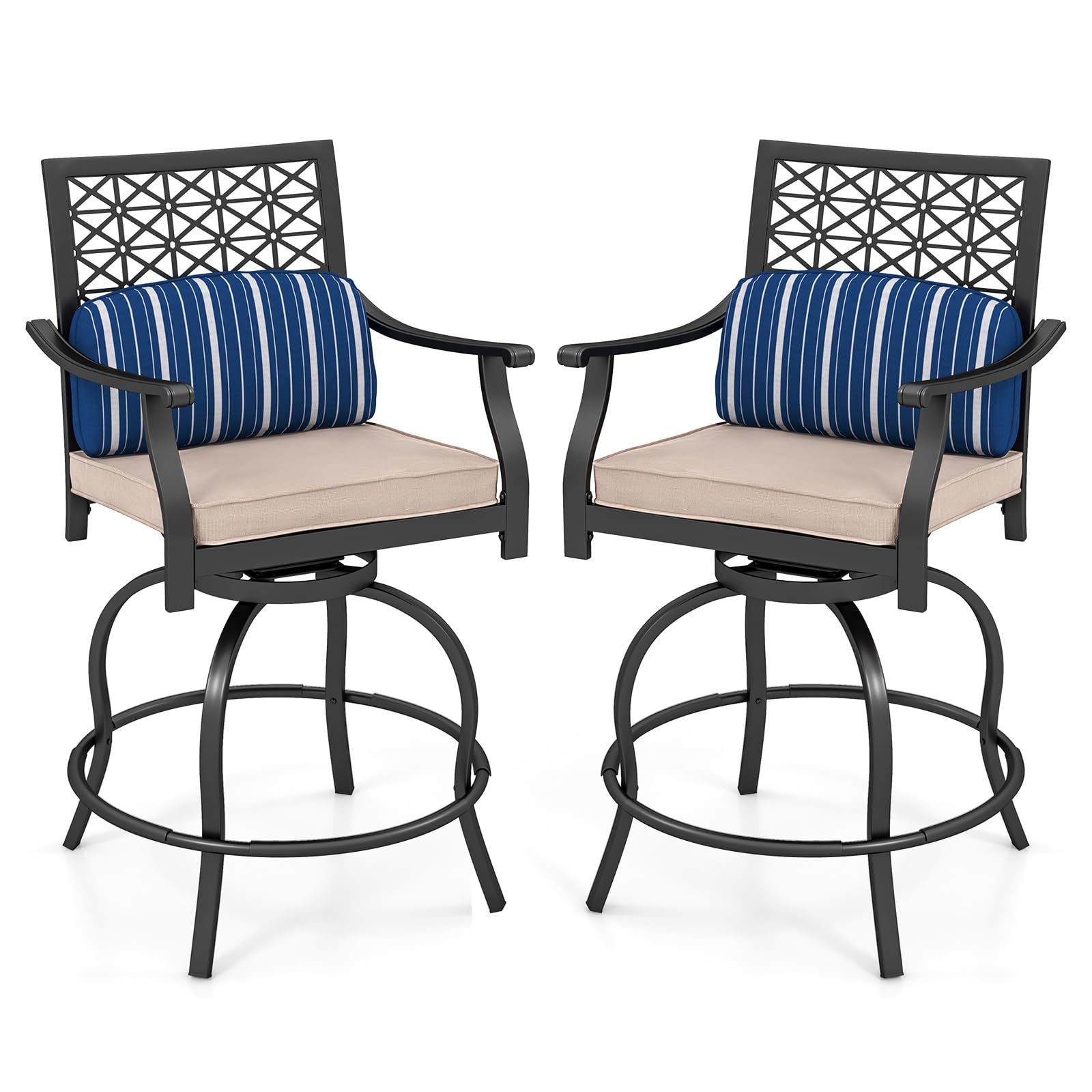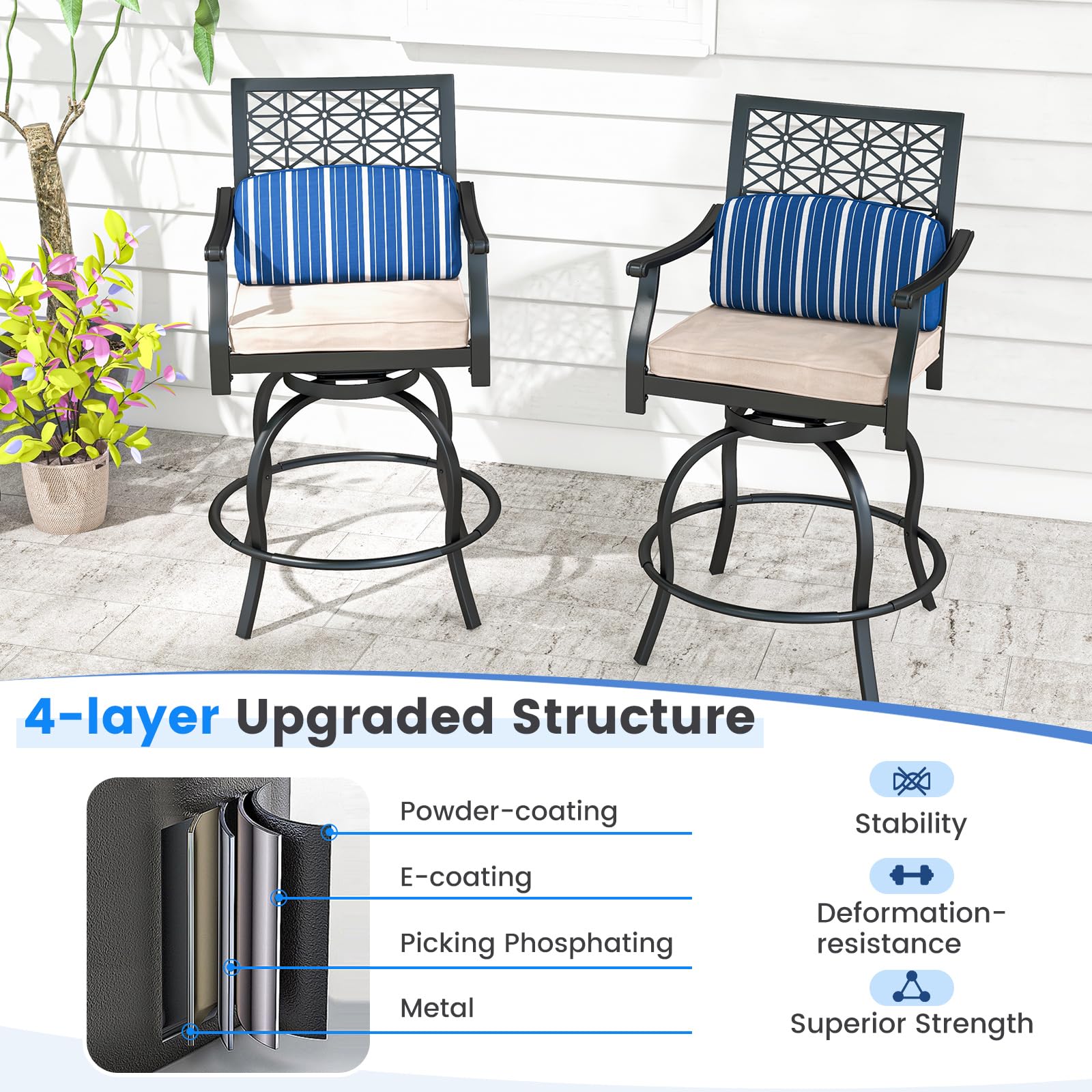 The outdoor metal swivel bar chairs are finished with powder-coating, E-coating and treated with picking phosphating. The 4-layer upgraded structure ensures superior strength and deformation-resistance for durability. With 360° swivel seat & rocking design, the patio bar height chairs allow you to rotate to any direction and enjoy smooth rocking. Coming with padded lumbar pillows and cushions, you can enjoy extended dining sessions without discomfort. And the cushions are removable for cool experience. Moreover, the built-in slanted high backrests, armrests and footrests will bring you ultimate comfort. As the pillow cover features stylish striped design and the backrest features elegant diamond-shaped pattern, the high top bistro chairs is an attractive addition for your outdoor spaces.