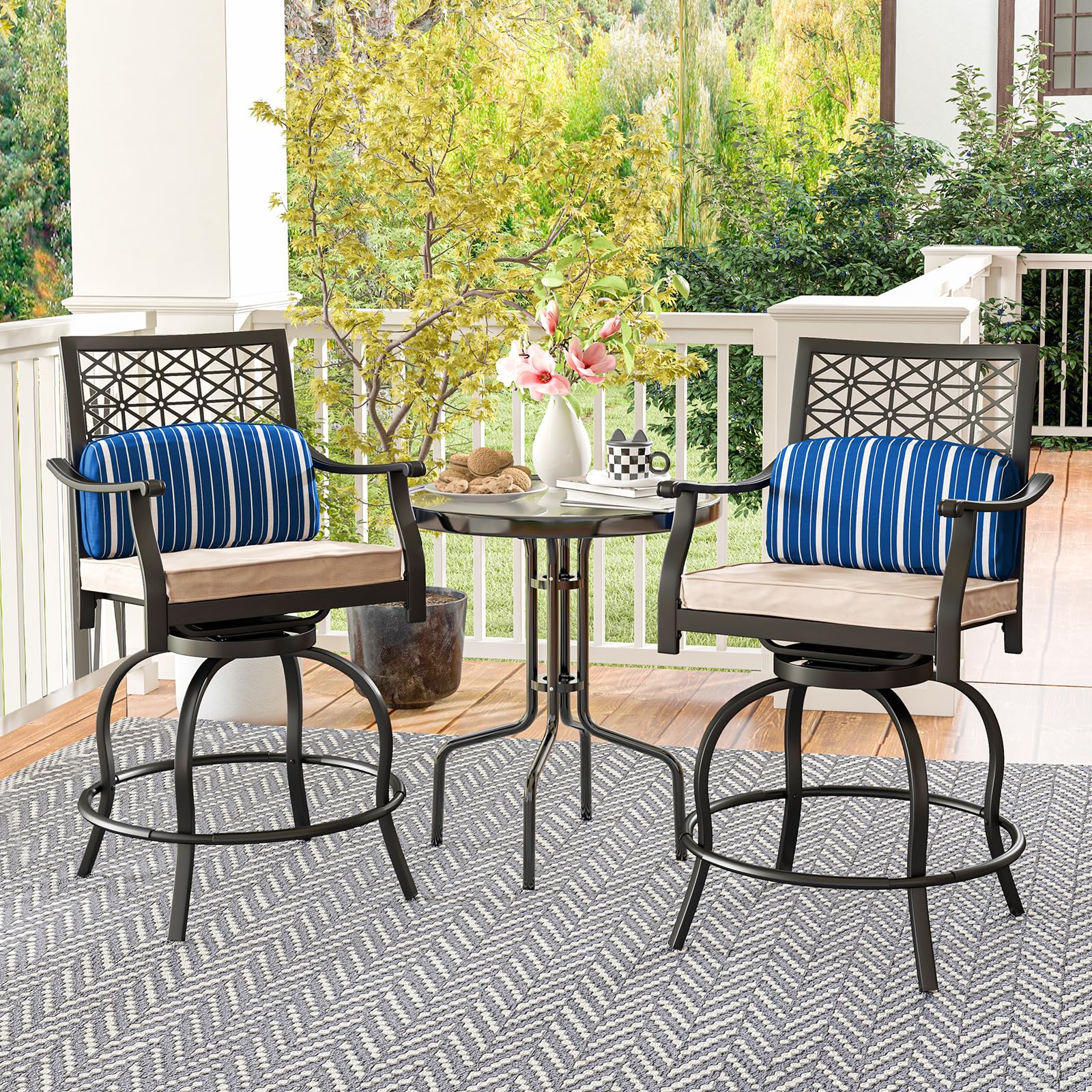 - Multi-scenario Application: With a classic cutout pattern that exudes sophistication, the patio bar stool set complements a variety of outdoor spaces. And the lumbar pillow features stylish striped design, making the patio bar height chairs a perfect addition in your backyards, patios, gardens.