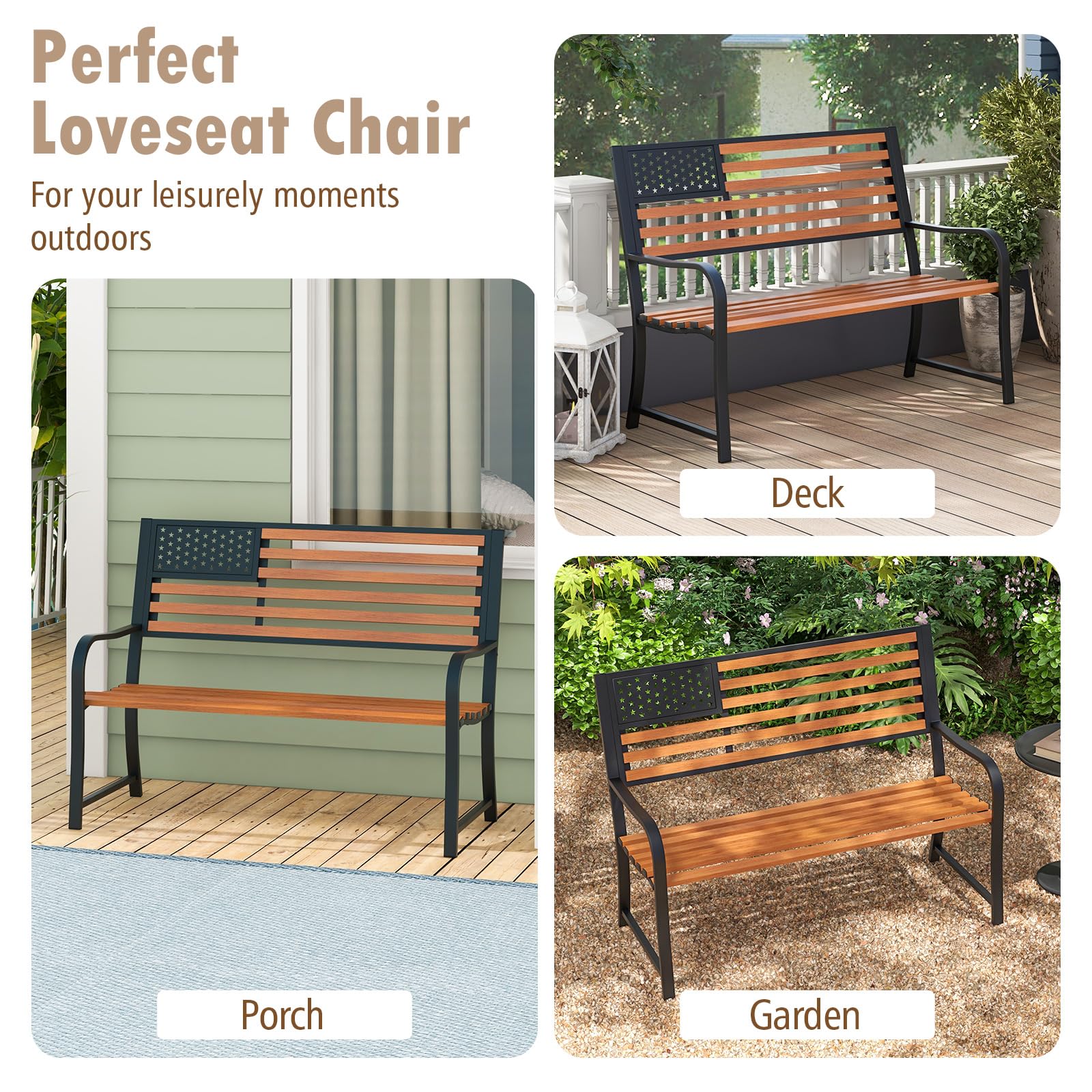 Embrace the spirit of America with our patriotic garden bench, showcasing an exquisite American flag motif. This enduring steel-framed bench supports up to 660 lbs, ensuring stability and comfort. All for comfort, its ergonomic design features an inclined backrest and cozy armrests, inviting you to relax or engage in leisurely chats. It also has a slatted seat that is spacious for comfortable sitting. The outdoor bench’s faux wood grain finish provides a sophisticated look, complementing any outdoor area. Measuring 50"L x 25.5"W x 37", it offers ample space for two, making it an ideal spot for bonding over books or conversations. For your preference, the porch bench will be a perfect addition for your deck, garden, backyard, and more.