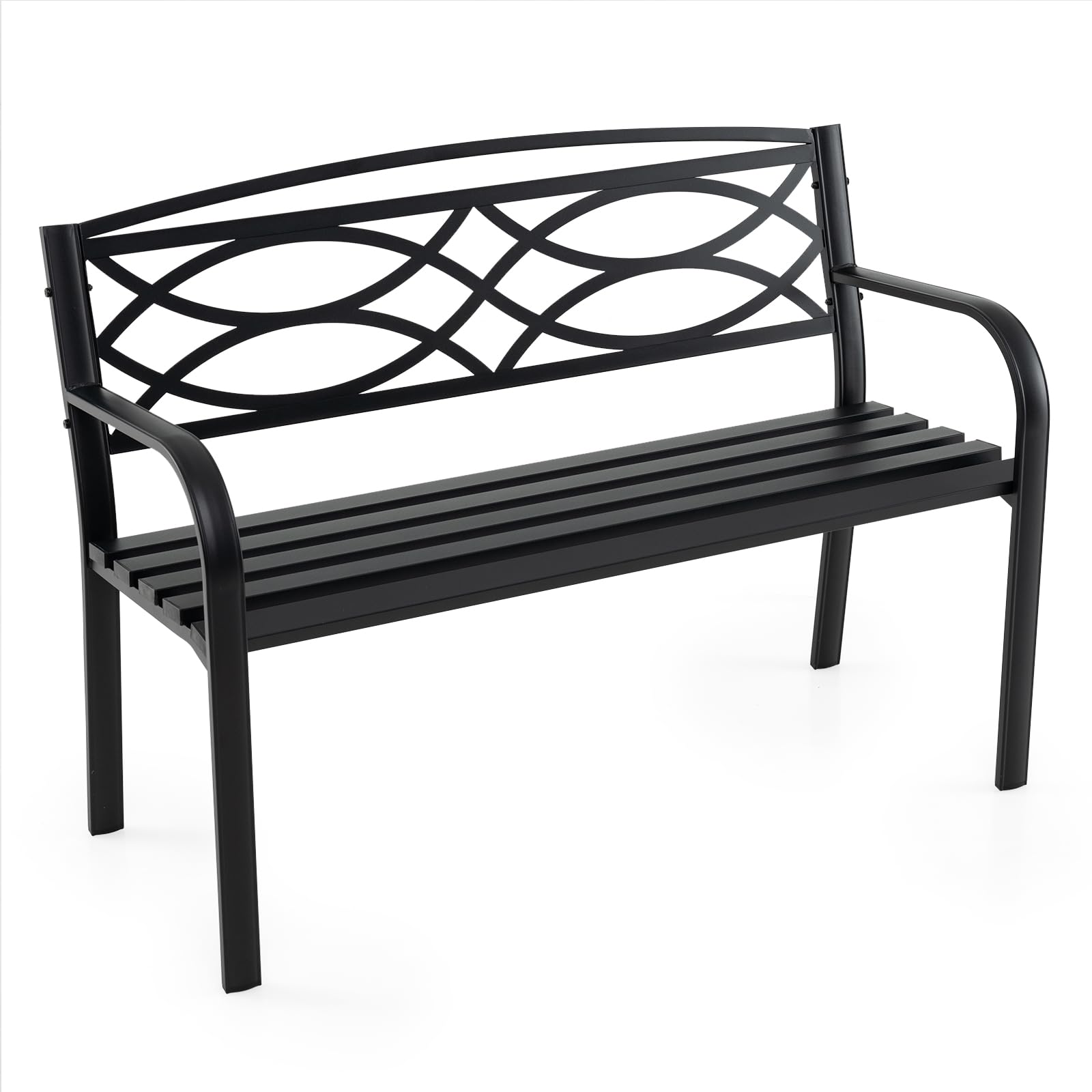 Crafted with a robust metal frame, this bench offers reliable support and stability for years of use in various outdoor settings. The ergonomically designed backrest, slatted seat, and smooth armrests ensure a comfortable sitting experience, ideal for relaxing with friends or enjoying some peaceful solitude. This bench provides spacious and cozy seating for up to 2 people, while the beautiful ironwork detailing adds a touch of charm to any outdoor area. Whether placed on a porch, in a backyard, garden, or park, this metal bench seamlessly integrates into different outdoor settings, making it a versatile and essential furnishing choice.