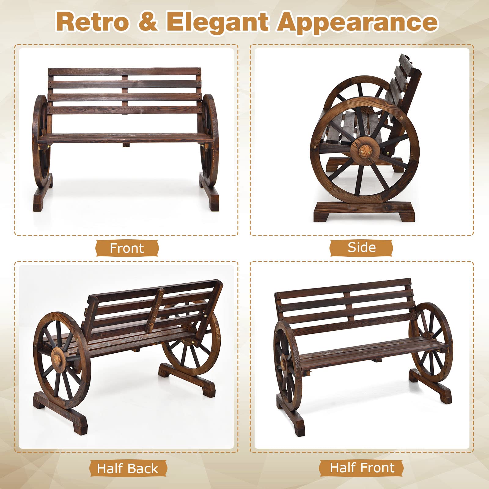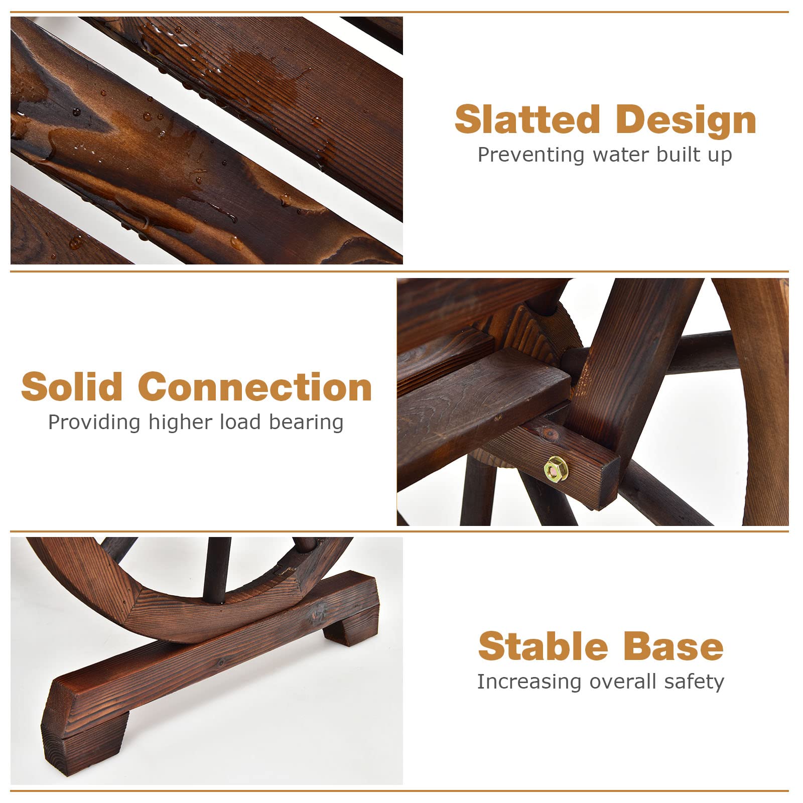 Our outdoor wooden wagon wheel bench is a good choice for you to enjoy the outdoor leisure time.