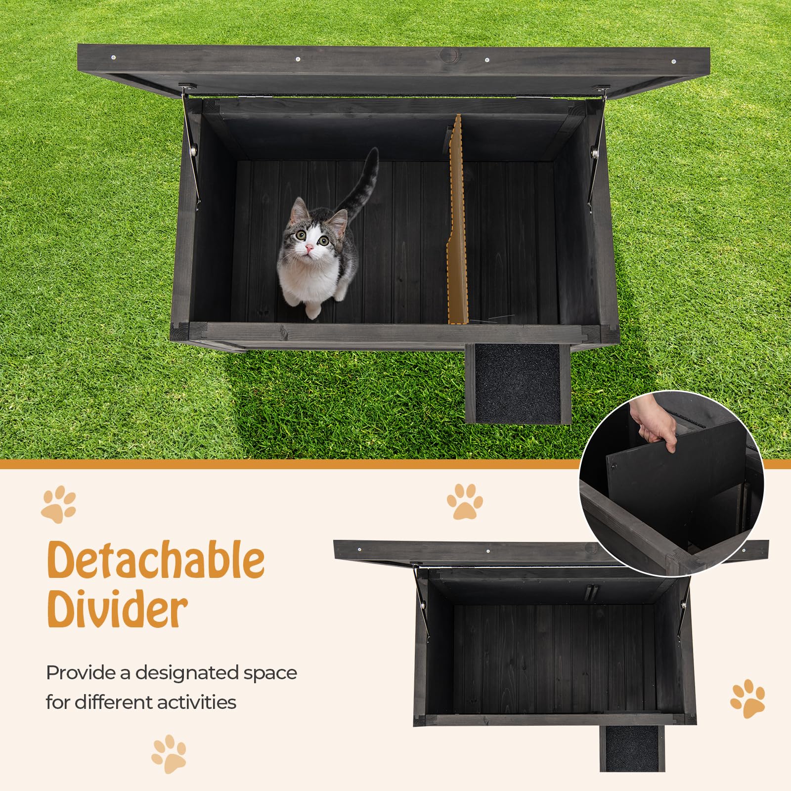 - Generous Size & Adjustable Interior: Our weatherproof cat house for feral cats measures 34.5'' x 22'' x 27'' (L x W x H), offering ample space for 1-2 cats (size dependent). Inside, a detachable divider with a door allows for customizable spaces, catering to various activities.