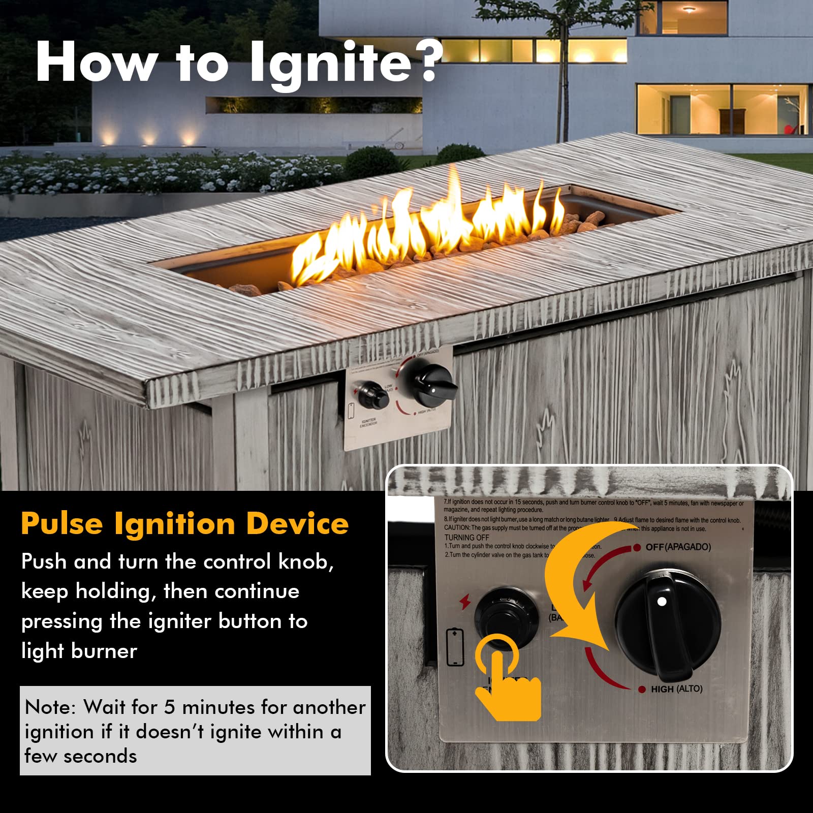 The 50,000 BTU effective heating output generates abundant warmth so that you are able to feel cozy on cold days. It is easy for you to ignite the propane gas fire table with the electronic pulse ignition system. In addition, the 43-inch gas firepit table works with a standard 20 lbs propane tank (not included) that can be stowed inside for convenience. By adding the lava rocks, you can appreciate flames that are more beautiful as well as enjoy the warmth for a longer time. Besides, when burning is not required, you can remove the metal lid and the outdoor fire table will turn into a coffee table. You can have a wonderful outdoor leisure time together with your family sitting around it, in the garden or courtyard. Most importantly, the selected materials with exquisite workmanship promise to withstand the test of time.