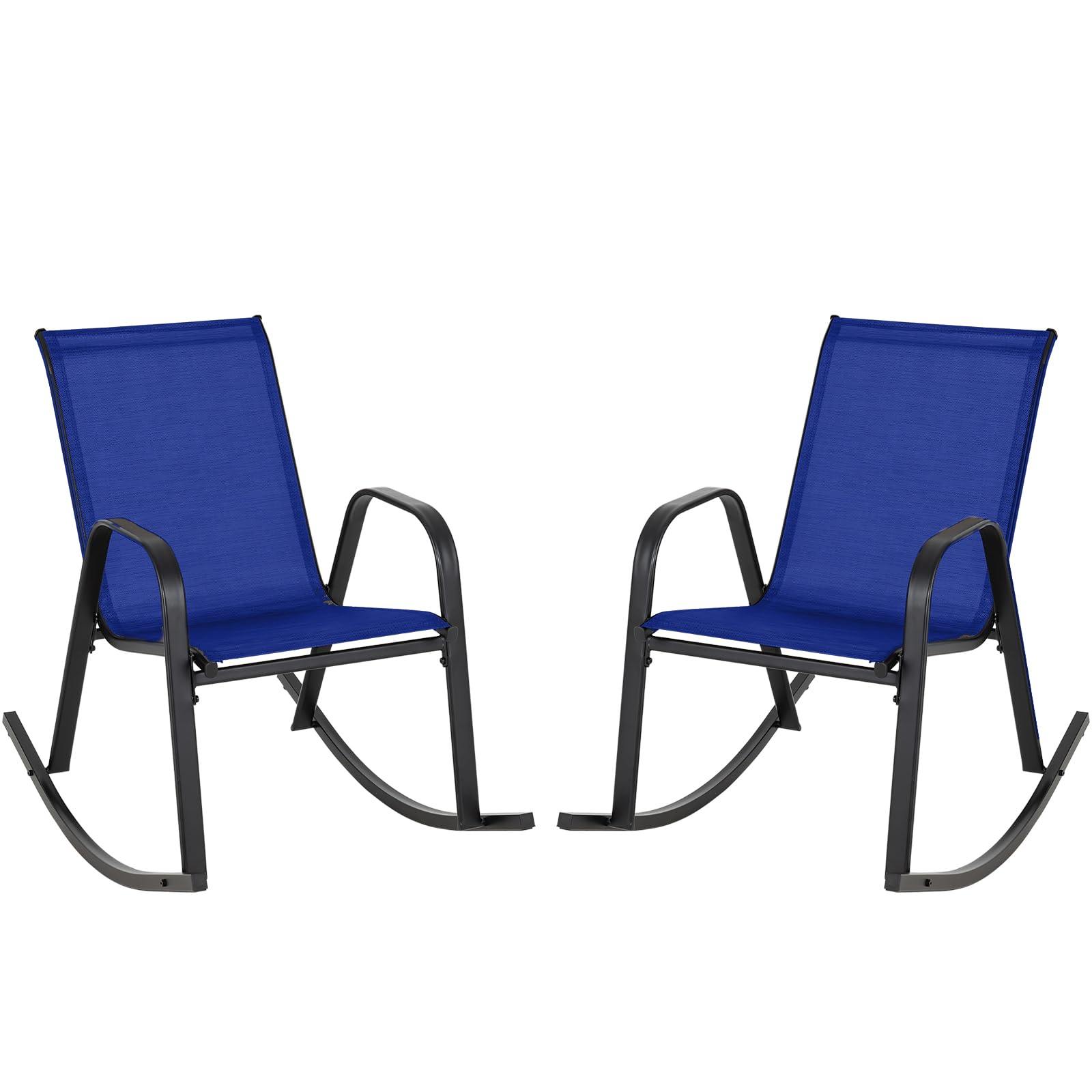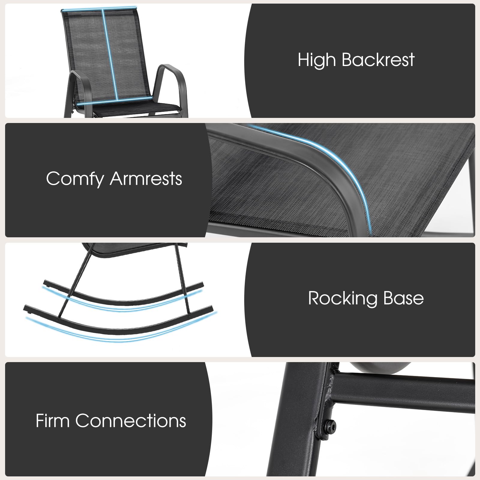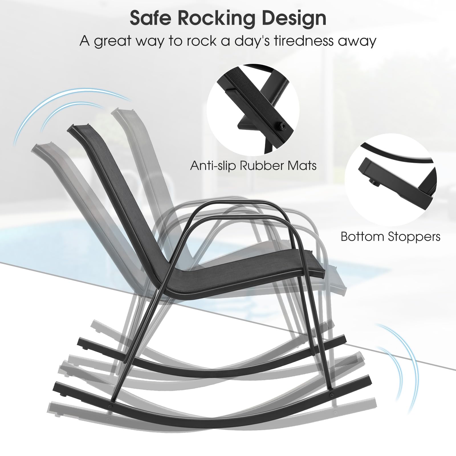 Each rocking chair features smooth rocking movement, equipped with anti-slip rubber mats and stoppers for superior balance and safety. The robust metal structure ensures stability, while the breathable, wear-resistant and anti-fading seat fabric offers comfort and quick drying capabilities. Ergonomically crafted with curved seats, backs, and armrests, these chairs conform to your body’s natural contours for extended comfort. Transform your outdoor space into a serene retreat with these stable and sturdy rocking chairs.