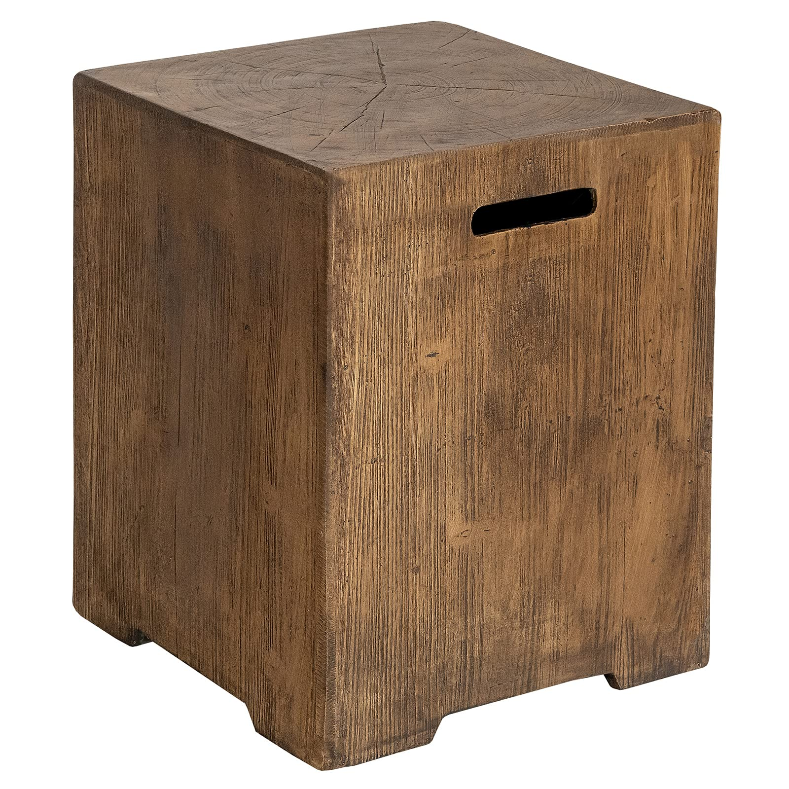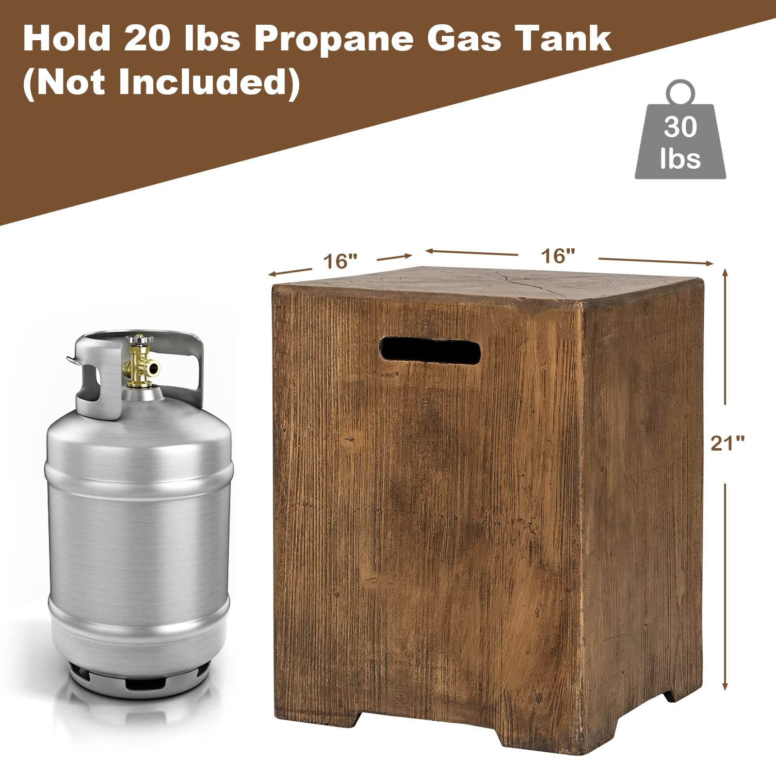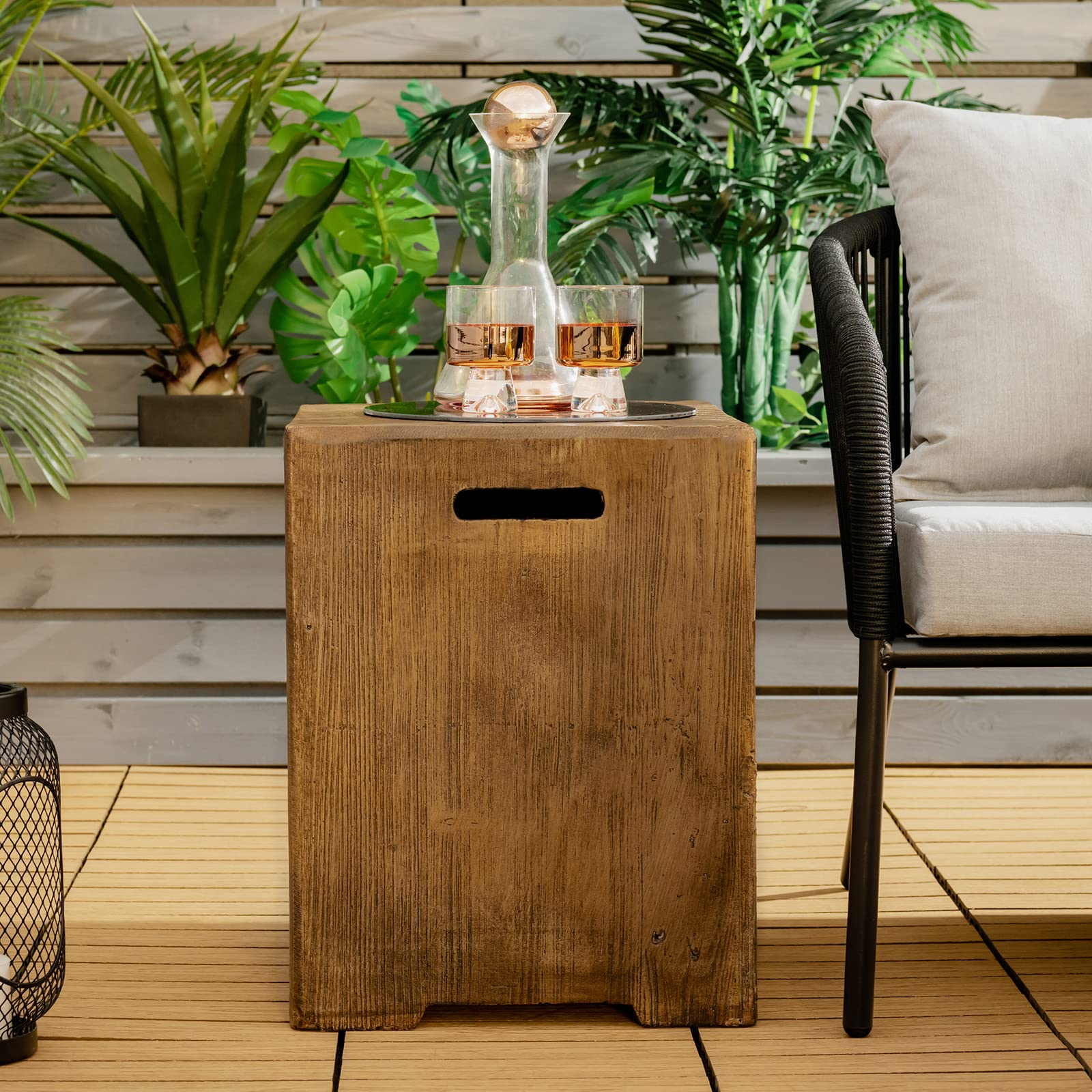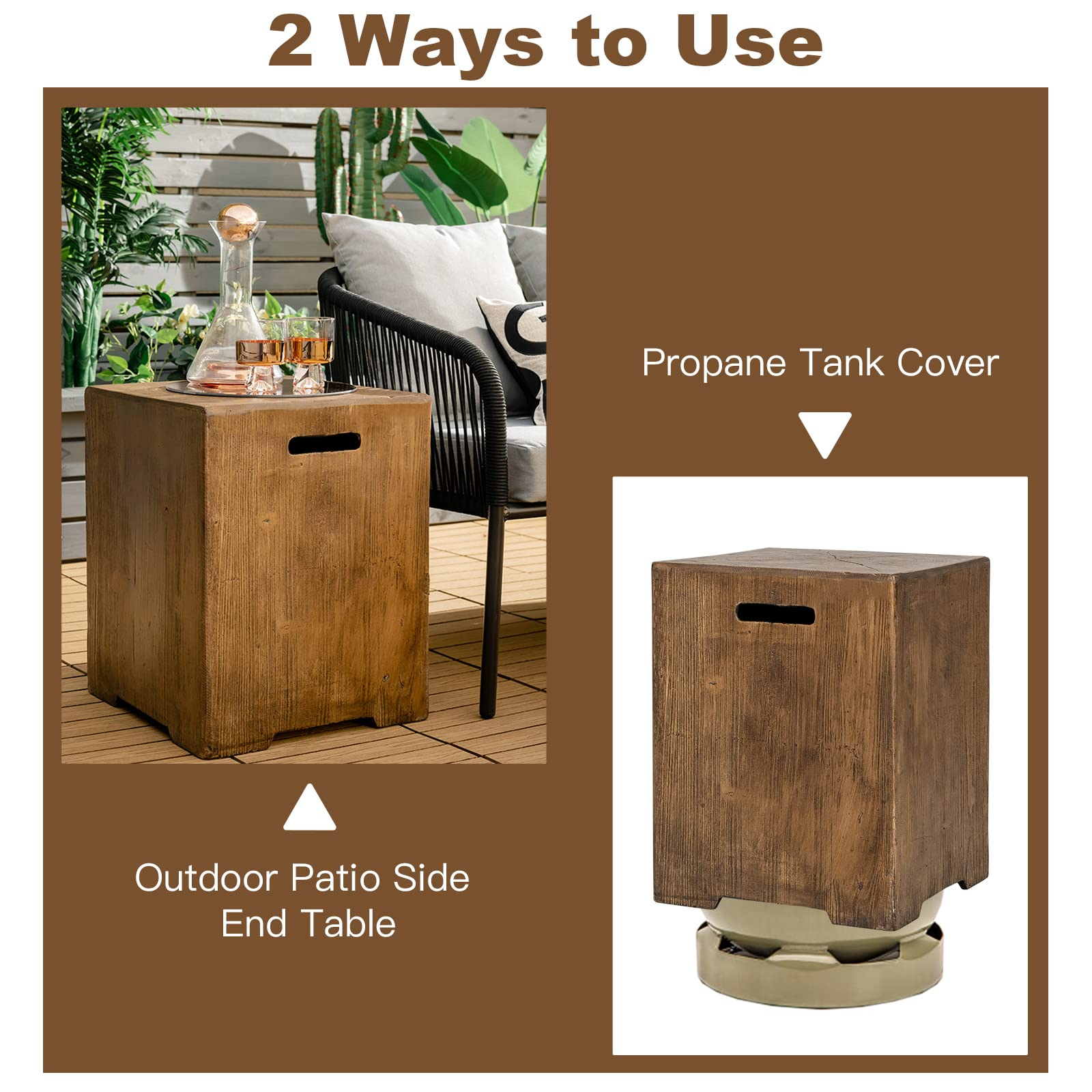 For practicability, this outdoor furniture with side handles not only serves as hideaway table to hold a standard 20 lbs propane tank (not included), but also can be used as a side table to access different belongings easily. As for aesthetics, the nature wood grain pattern adds a rustic touch to your outdoor places. Furthermore, the adjustable foot pads allow you to use this patio side end table on the uneven ground. What's more, the flame-retardant magnesium oxide ensures its safety and durability.
