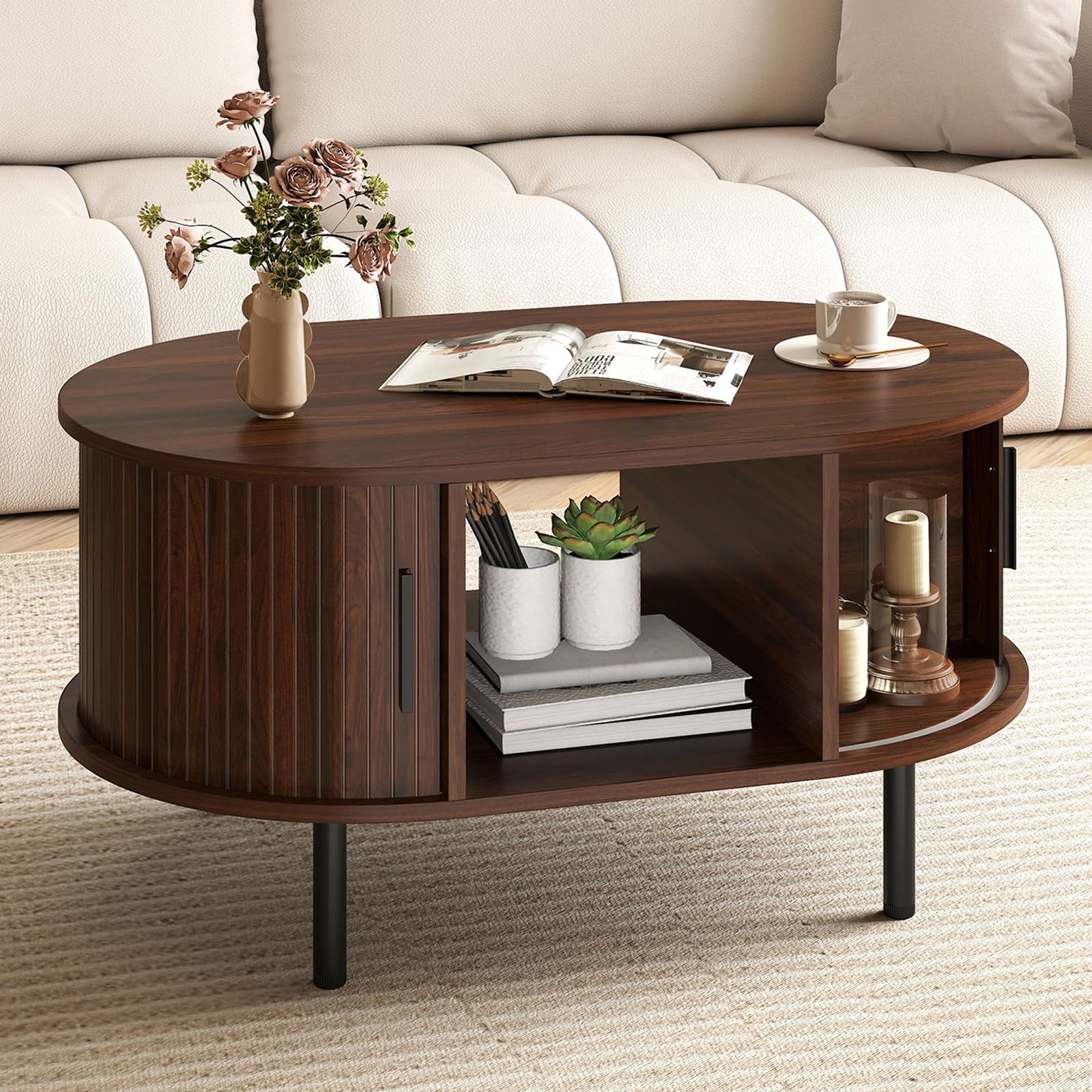 Transform your living room instantly! Discover the magic of clutter-free elegance with our chic coffee table. Perfectly balancing privacy with sophistication, its unique sliding tambour doors keep your essentials hidden, making your space sleek and organized. Admire the stunning wood grain finish and fluted detail that elevate your home’s aesthetic. Ideal for any activity, the center table’s oval top is ready for your teas, laptop sessions, or stylish displays. Built with endurance in mind, this coffee table stands on robust metal legs, promising years of reliable support. Plus, upkeep is a breeze thanks to its smooth surface—just a simple wipe! Don’t miss out on this blend of style, versatility, and convenience—add this must-have centerpiece to your home today!