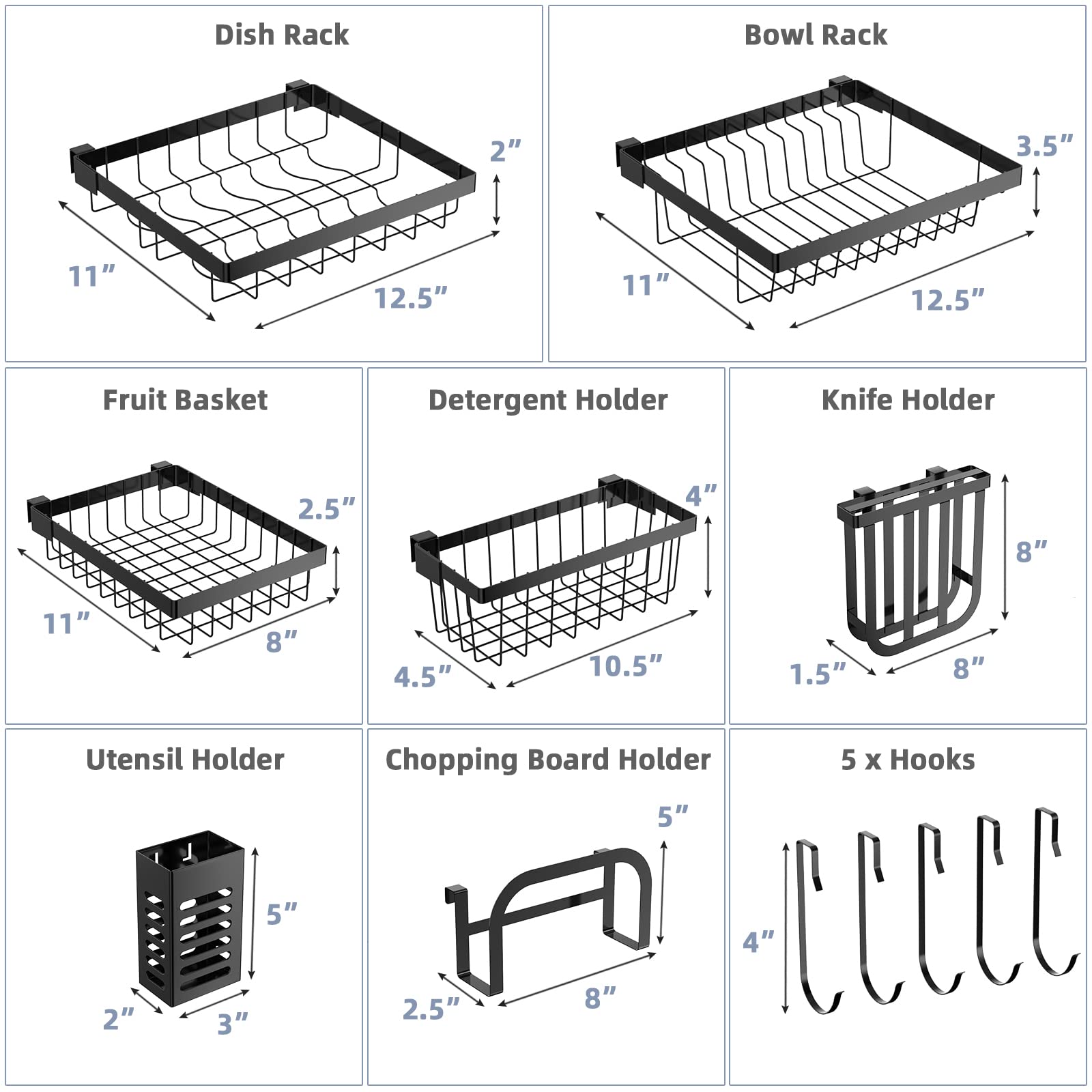 The over-sink dish rack creates additional storage space, but doesn't occupy the countertop at all. After cooking meals or washing dishes, you can neatly arrange the bowls, dishes, utensils, chopping board and other utensils in separate baskets and holders. Then water will drip into the sink automatically. The rustproof steel structure, L-shaped support and strong suction cups allow for long-lasting use and reliable stability. Moreover, the 2-tier dish drainer with a wide adjustable length range of 21"-39" is compatible with both single and double sinks. You can also DIY the dish rack set by resetting the baskets and holders.