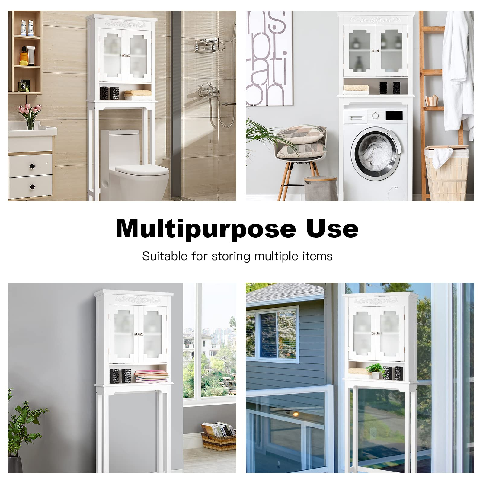 Our over the toilet bathroom cabinet provides you with plenty of vertical storage space tostore a wide variety of items. The transparent double door design not only increases the elegant style but also prevents items from falling and dust accumulating. Meanwhile, the inside adjustable shelf could meet your needs for storing items indifferent heights. This space-saving storage is ideal for putting on the toilet, washing machine and hamper. The elegant and modern appearance is perfect for blending with your bathroom, balcony and laundry. The sturdy MDF board and rugged construction ensure that your home is always clean and orderly. If you are person who pursue a clean and orderly life, you will love it.