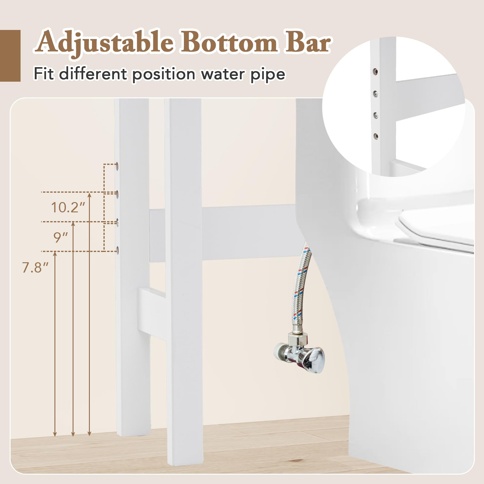 - [Customizable Fit]: This over-the-toilet storage rack includes a 3-position adjustable bottom bar to accommodate inlet pipes of different heights, providing a seamless fit over any standard toilet.