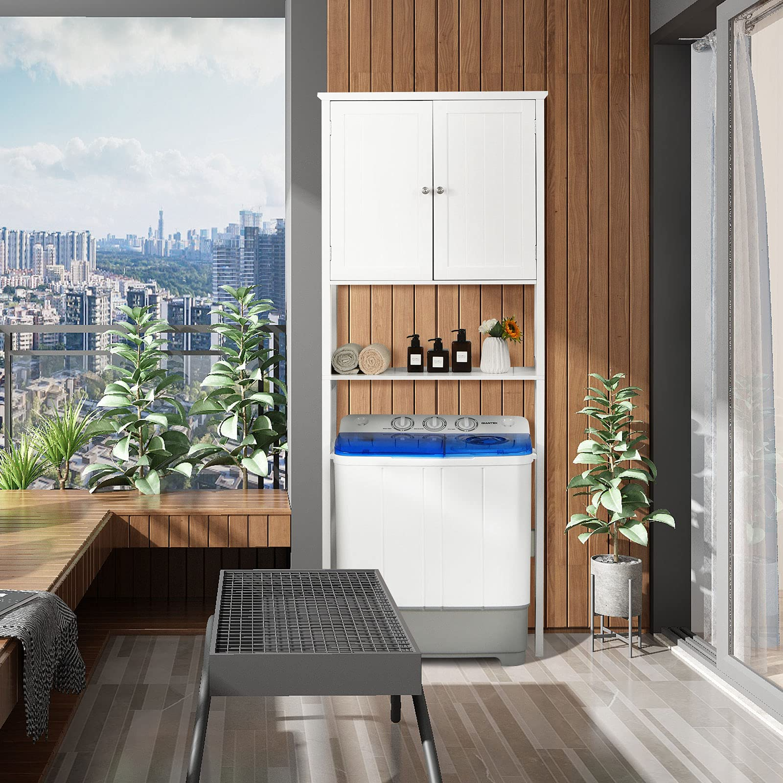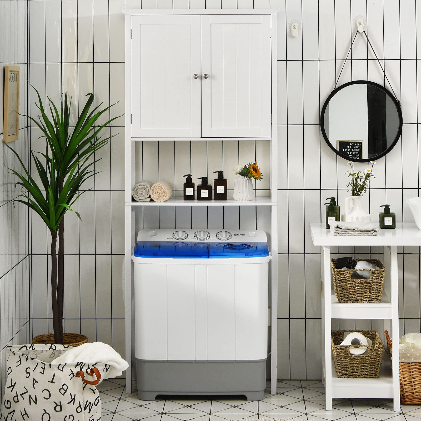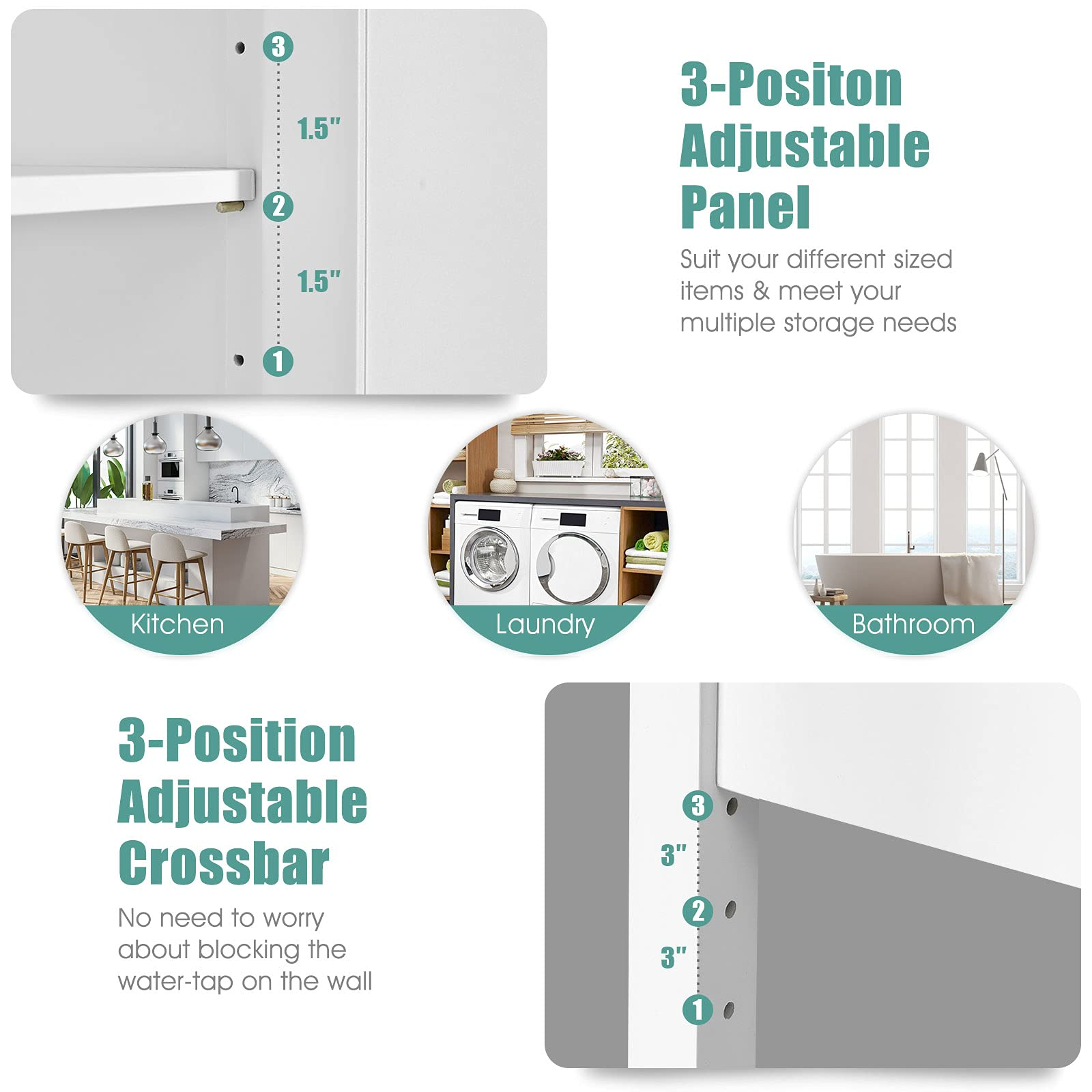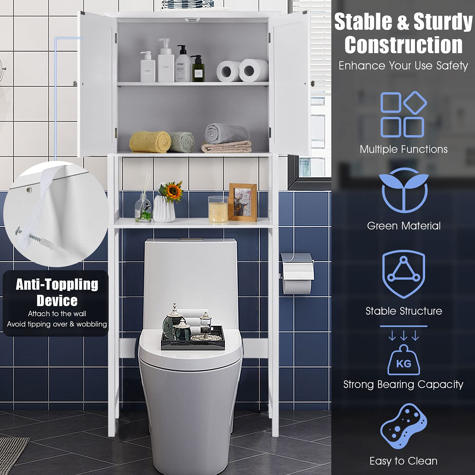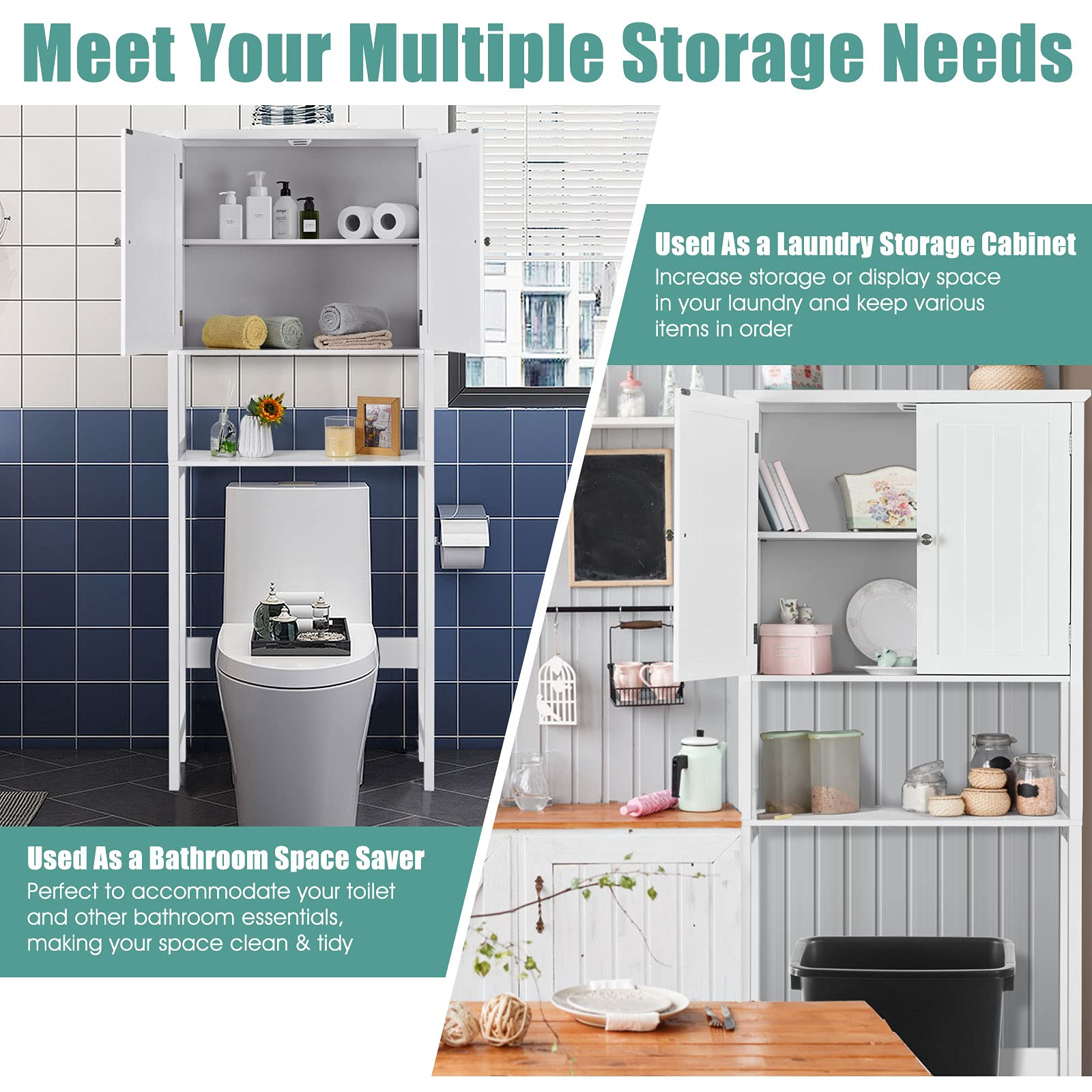 Our over-the-toilet storage cabinet is a great helper for organizing bathroom essentials and saving space. Adopted high-quality MDF board with reinforced screws ensures long-term stability and durability. And there is a strengthened crossbar at the bottom for reinforcement to add extra strong support. The bathroom cabinet includes a 2-door cabinet and a large open shelf which provides sufficient storage space to store sanitary supplies and sundries.