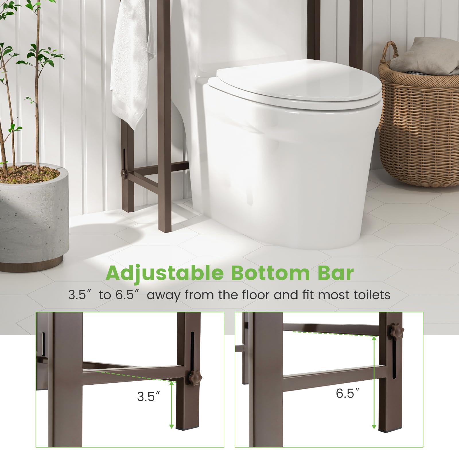 - Adjustable Bottom Bar: With an adjustable bottom bar, the over-the-toilet storage allows you to adjust 8.5cm/3.5” to 16.5cm/6.5” away from the floor and can well fit most standard toilets. You can easily adjust it to the height you need based on the size of the toilet you are placing.