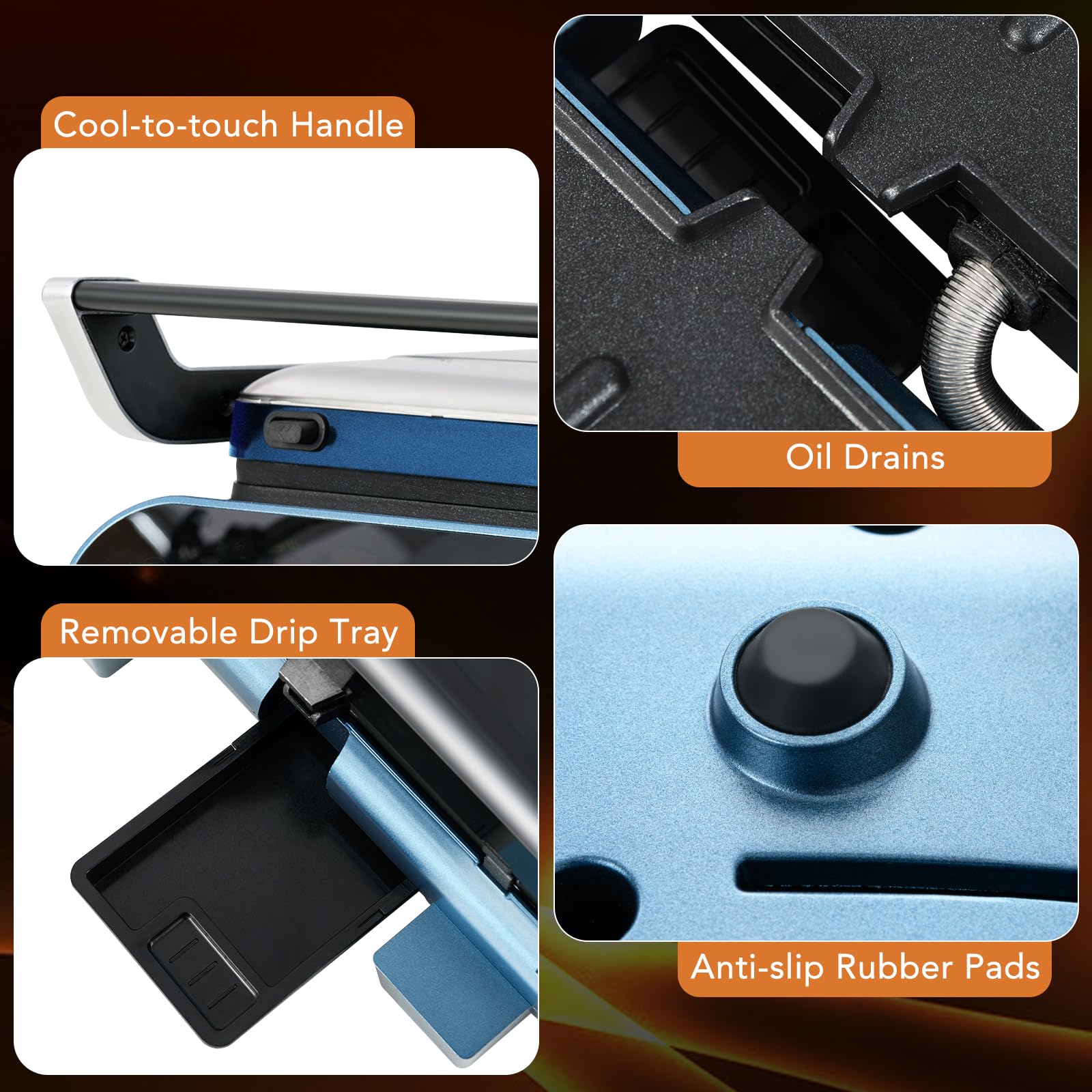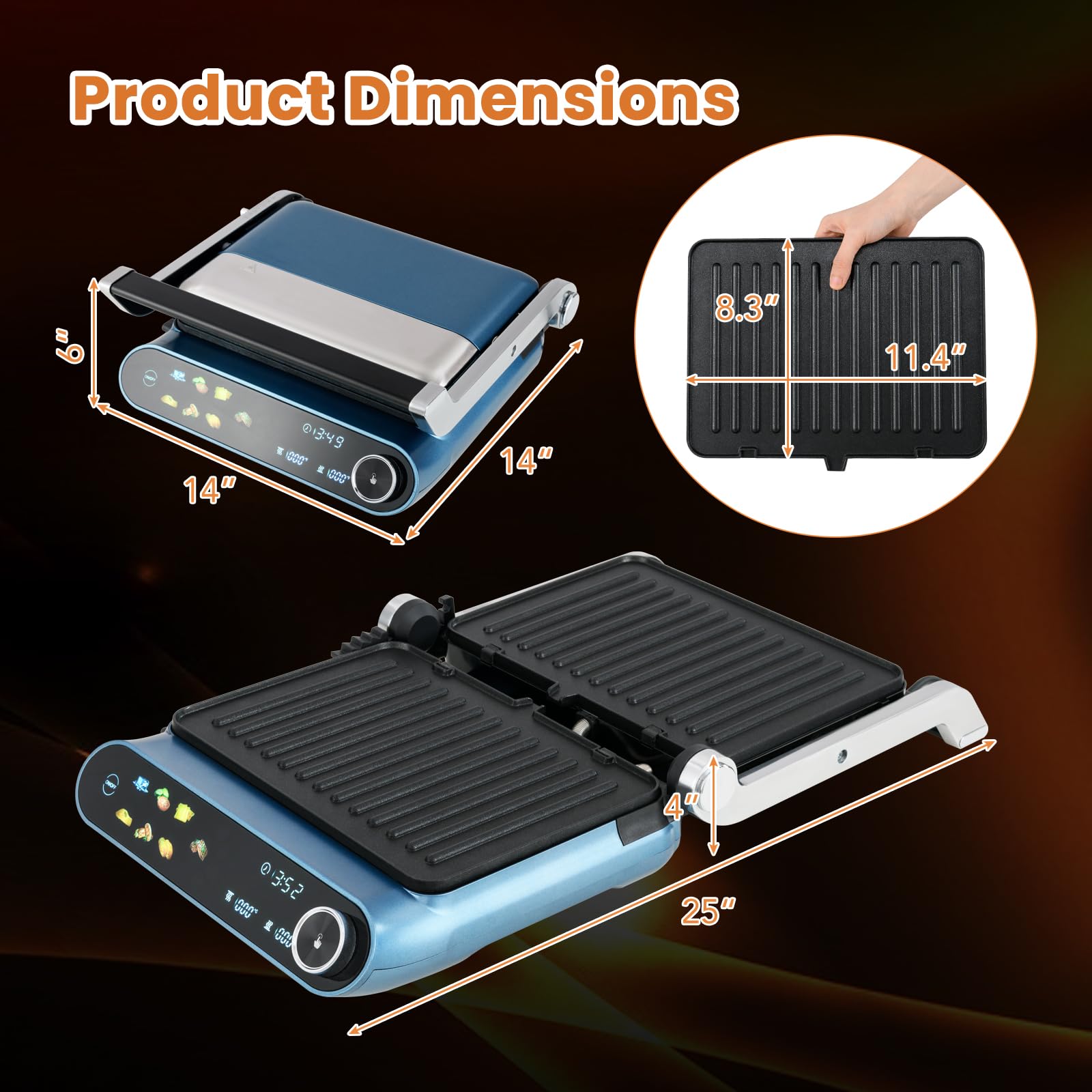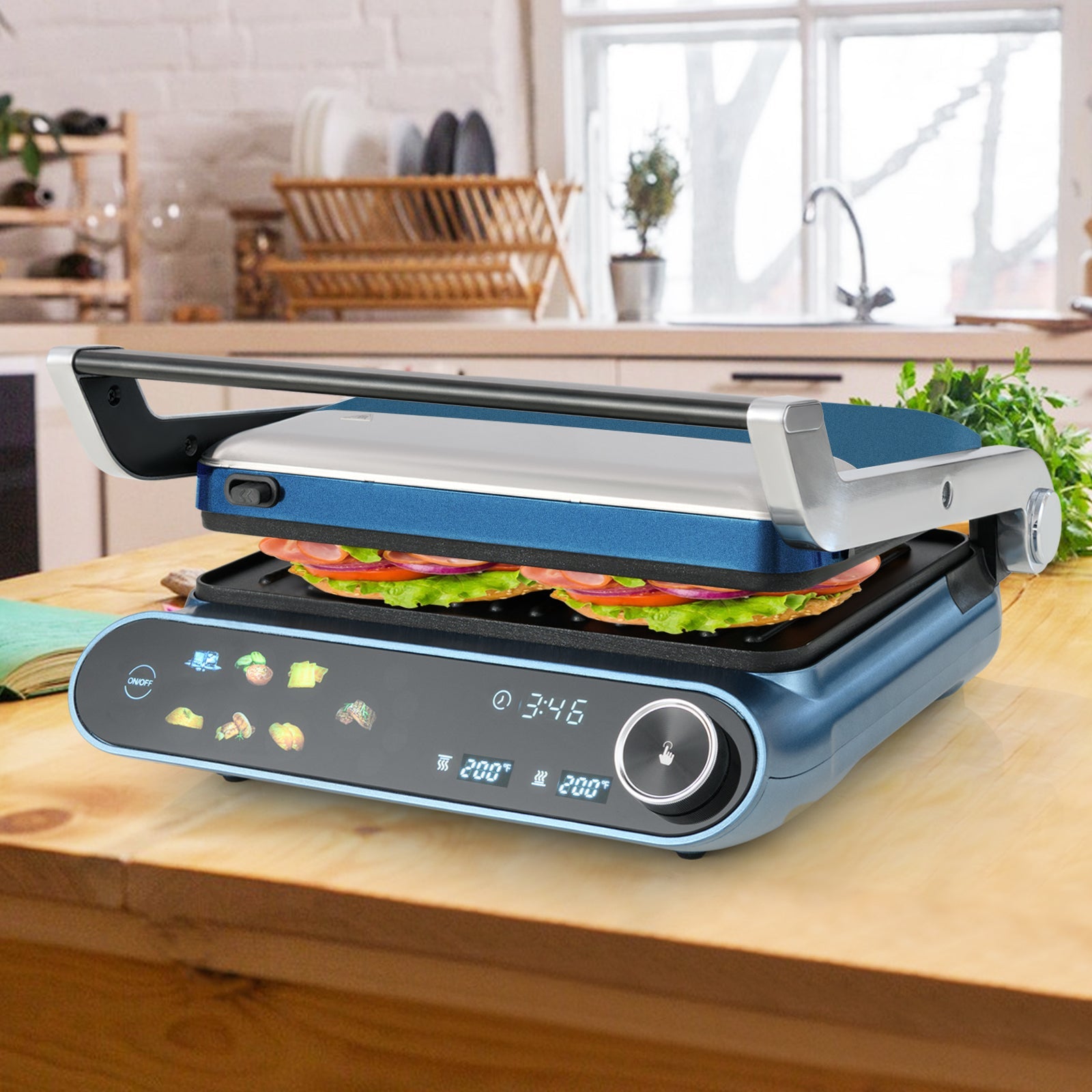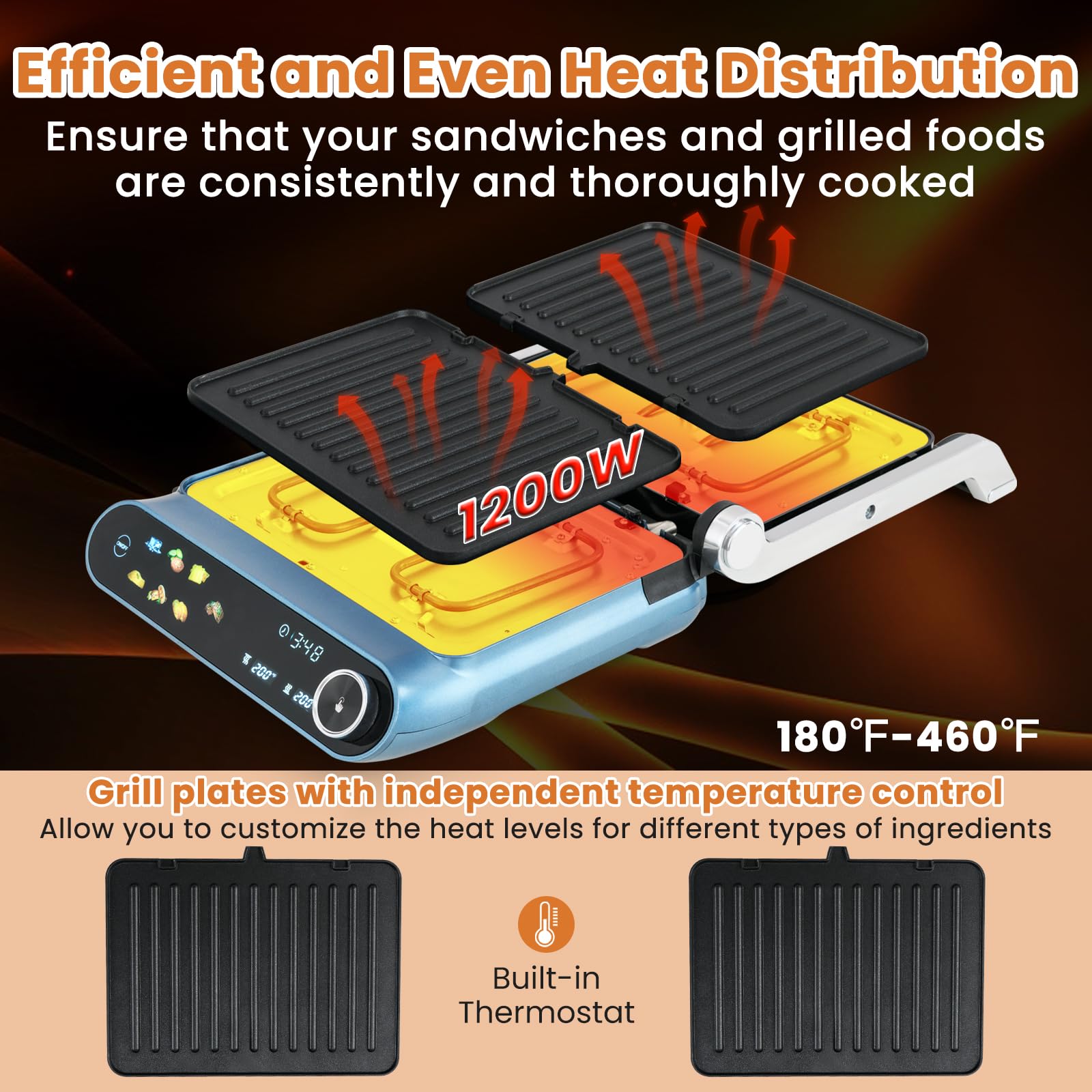 Unleash your grilling potential with the 1200W Panini Press Grill. Its 180-degree hinge and adjustable positions handle everything from four sandwiches to large paninis with ease. Featuring seven grilling modes, including steak doneness options (3, 5, 7, or 10 minutes at 460℉), it ensures perfect results every time. The smart LED display and intuitive controls simplify cooking, while the dishwasher-safe non-stick plates and removable drip tray make cleanup effortless. Bring efficiency and versatility to your kitchen with this premium indoor grill.