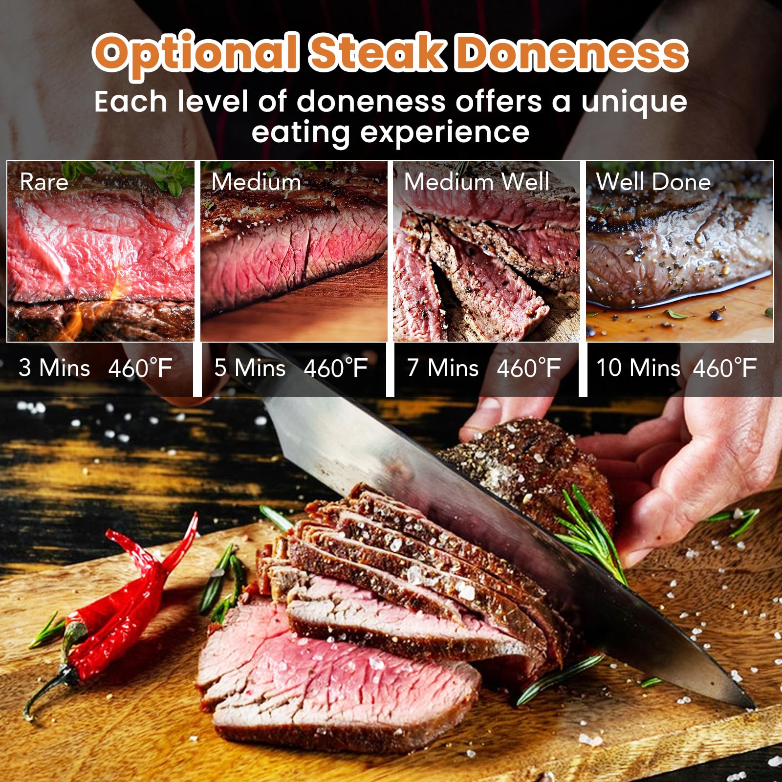 4 steak doneness levels: 3/5/7/10 mins at 460℉