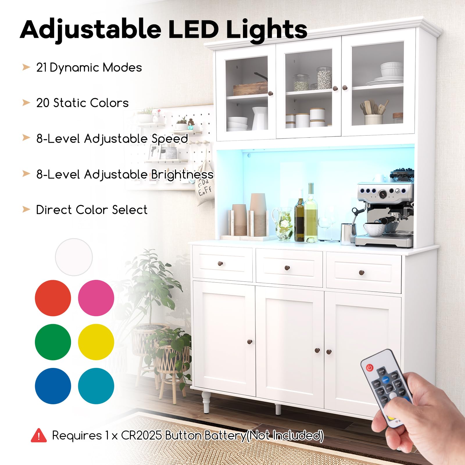 Our kitchen buffet cabinet offers 3 spacious drawers for easy access to your kitchenware, complemented by 4 door cupboards with adjustable shelves for your versatile storage needs. The dual tempered glass doors on the upper cupboards exude a modern elegance, offering both a clear view of your organized contents and an added layer of strength and safety. The large countertop of this tall cupboard serves as an additional workspace, and is equipped with a built-in charging station, which enables you to plug in your household appliances at all times. Set the mood for any occasion with the sophisticated, integrated LED lighting system, offering a spectrum of colors, modes, brightness, and speeds to choose from. Safety is prioritized with anti-toppling devices and a support leg for stability, and cleaning is made easy with generous ground clearance for vacuum robots. Upgrade your kitchen with our stylish and practical utility pantry cabinet!