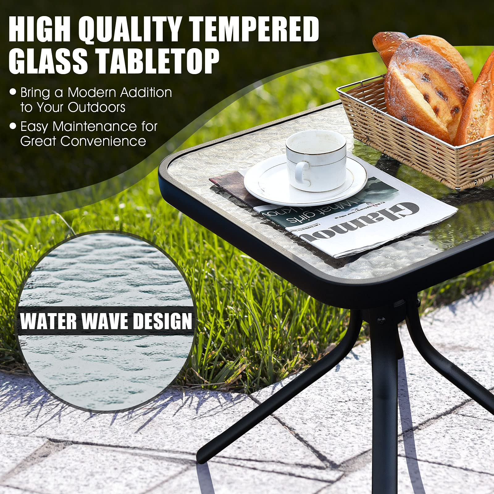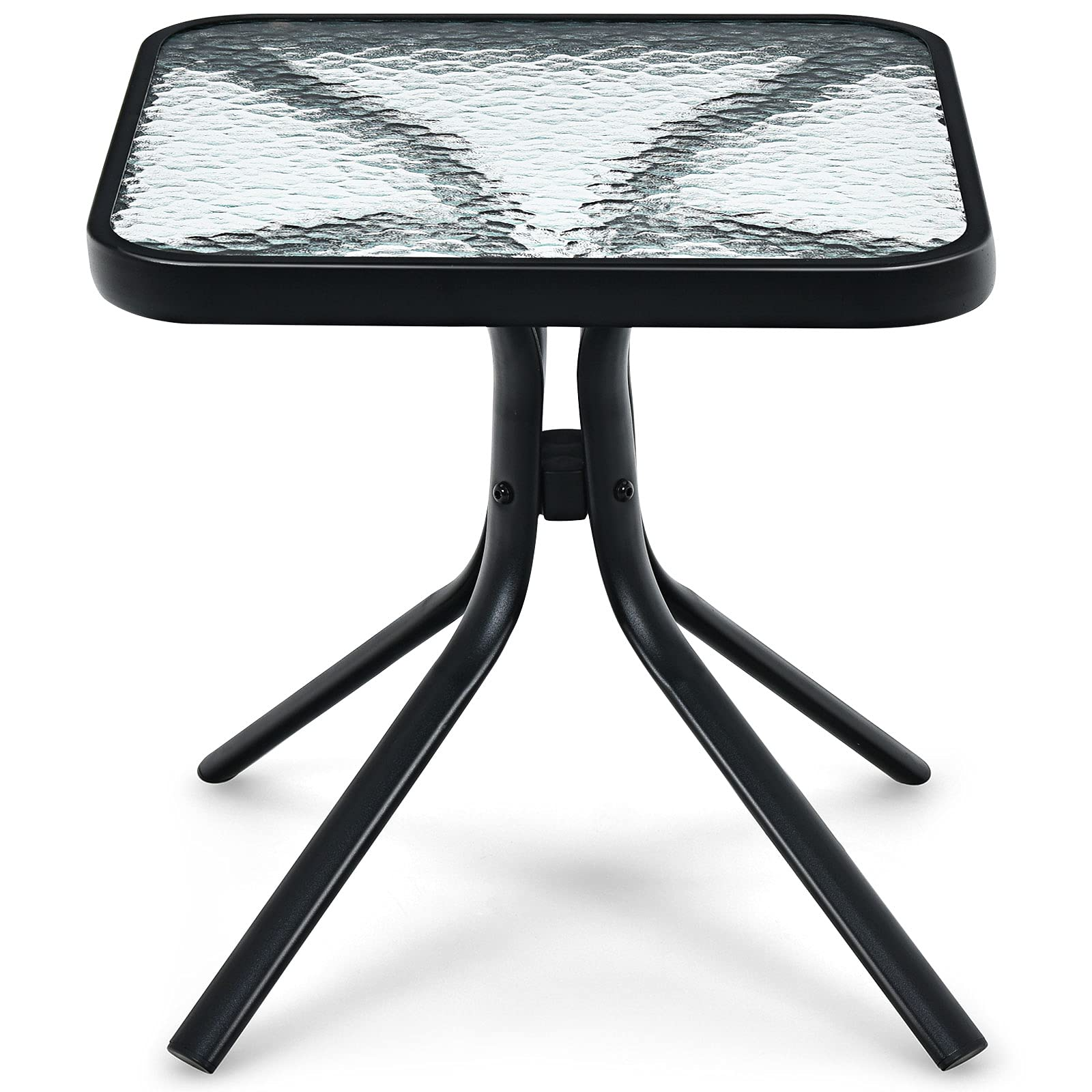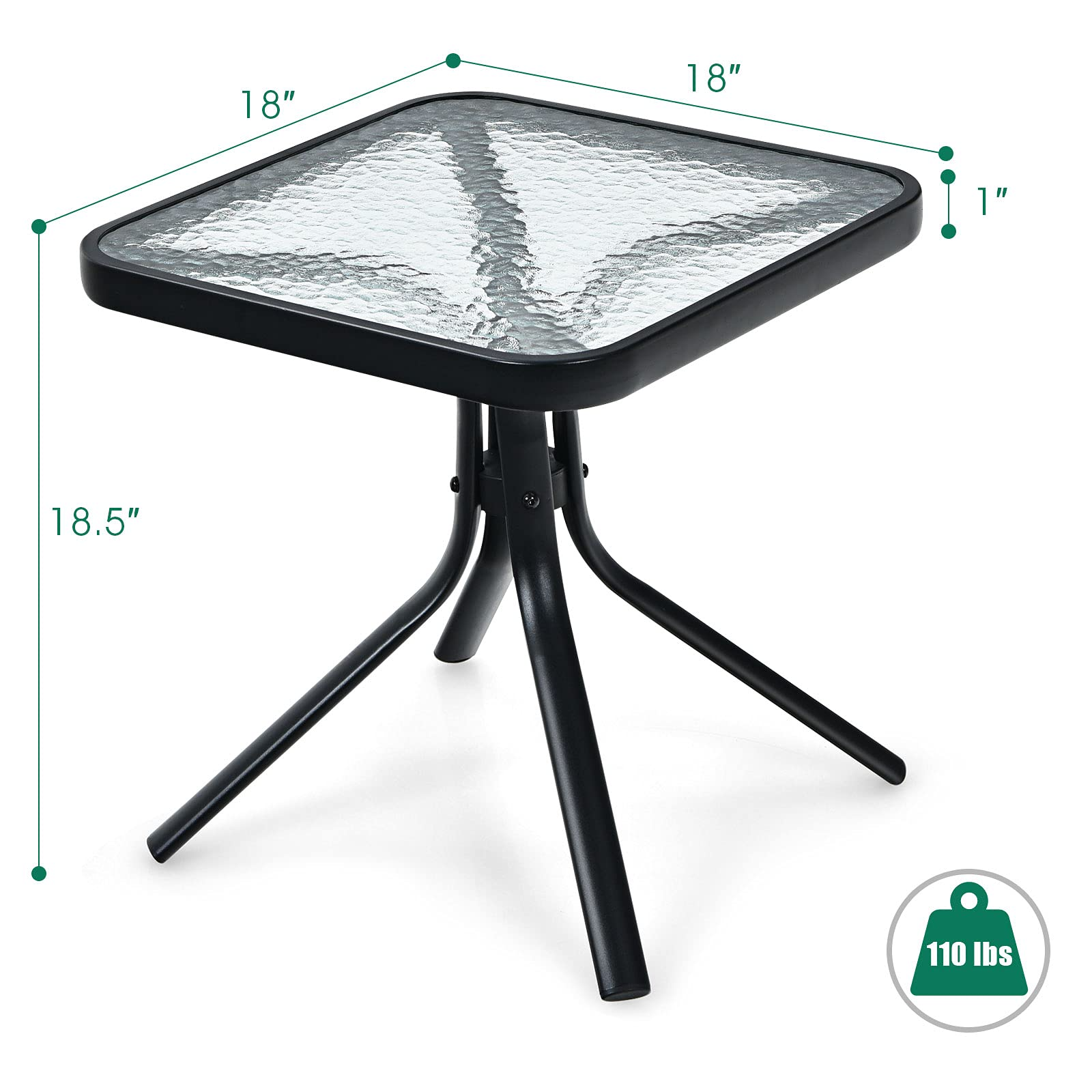 - Furthermore, the tempered glass and anti-rust steel frame make this outdoor end table durable and stable to support up to 110 lbs.