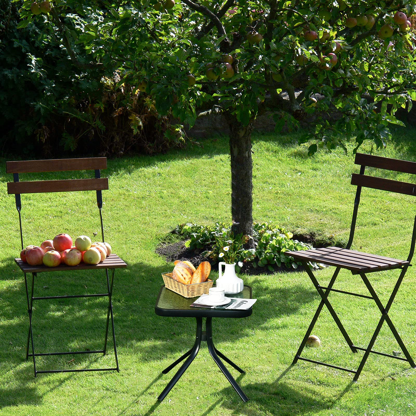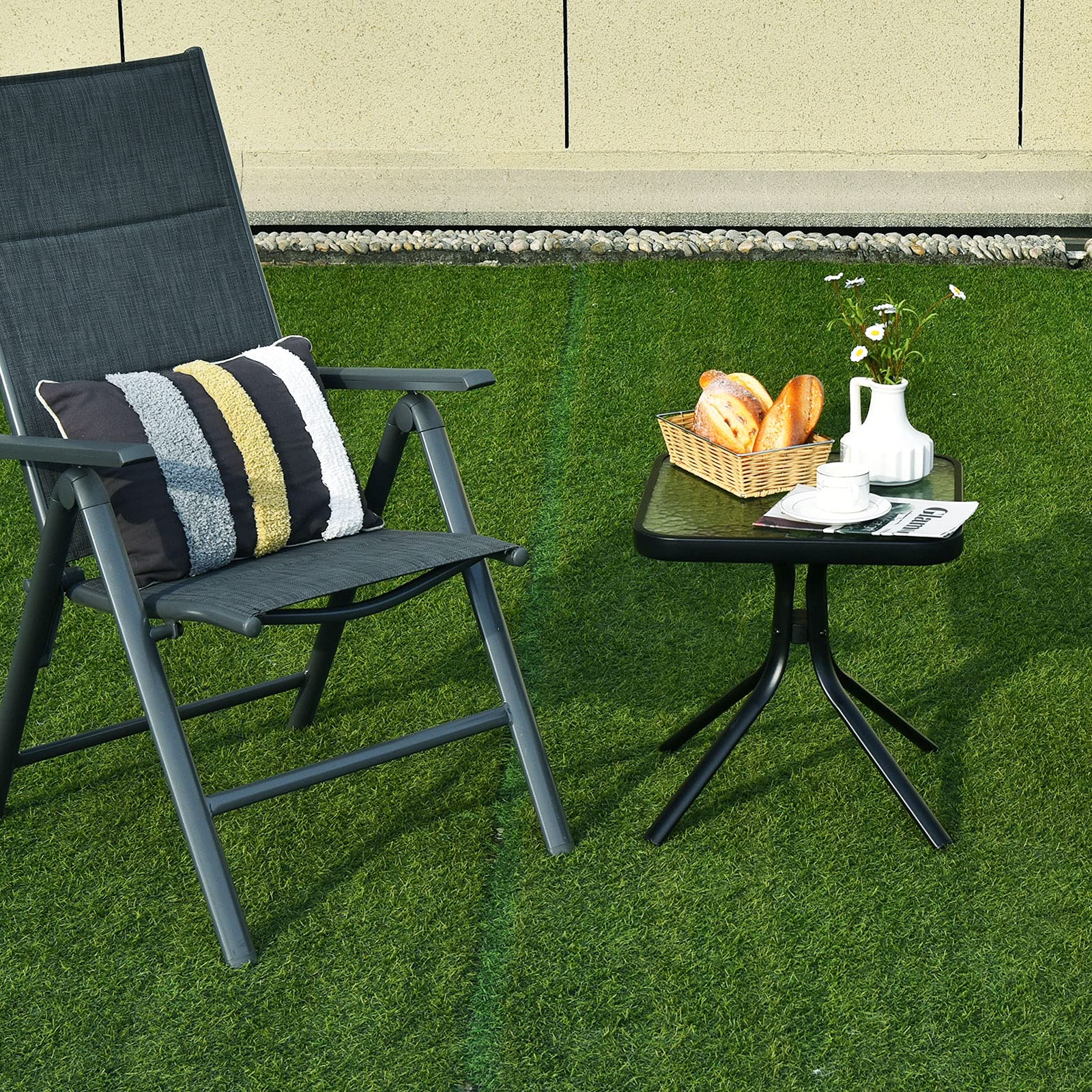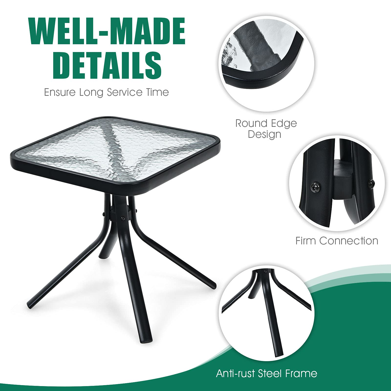 - Furthermore, the tempered glass and anti-rust steel frame make this outdoor end table durable and stable to support up to 110 lbs.