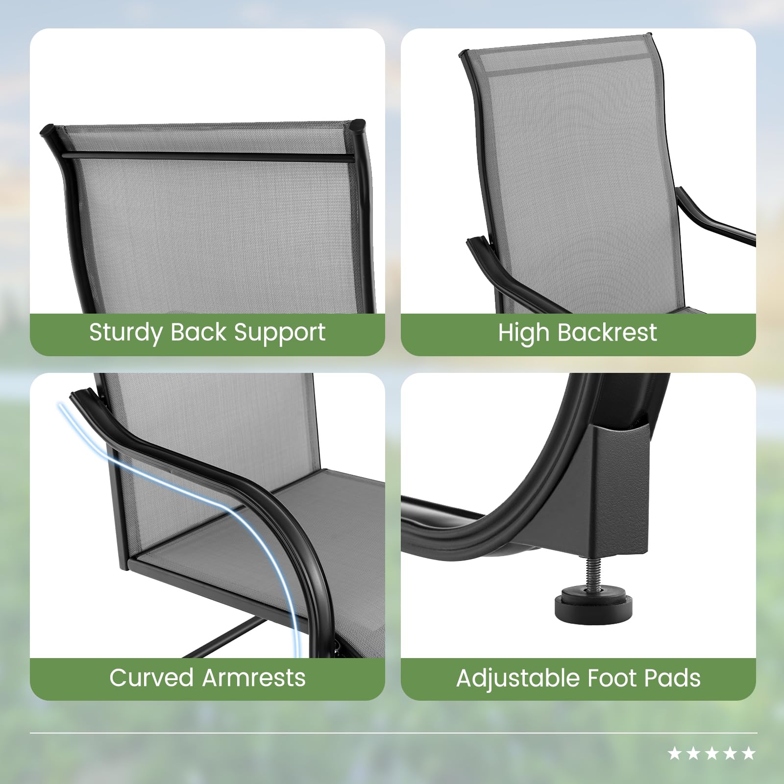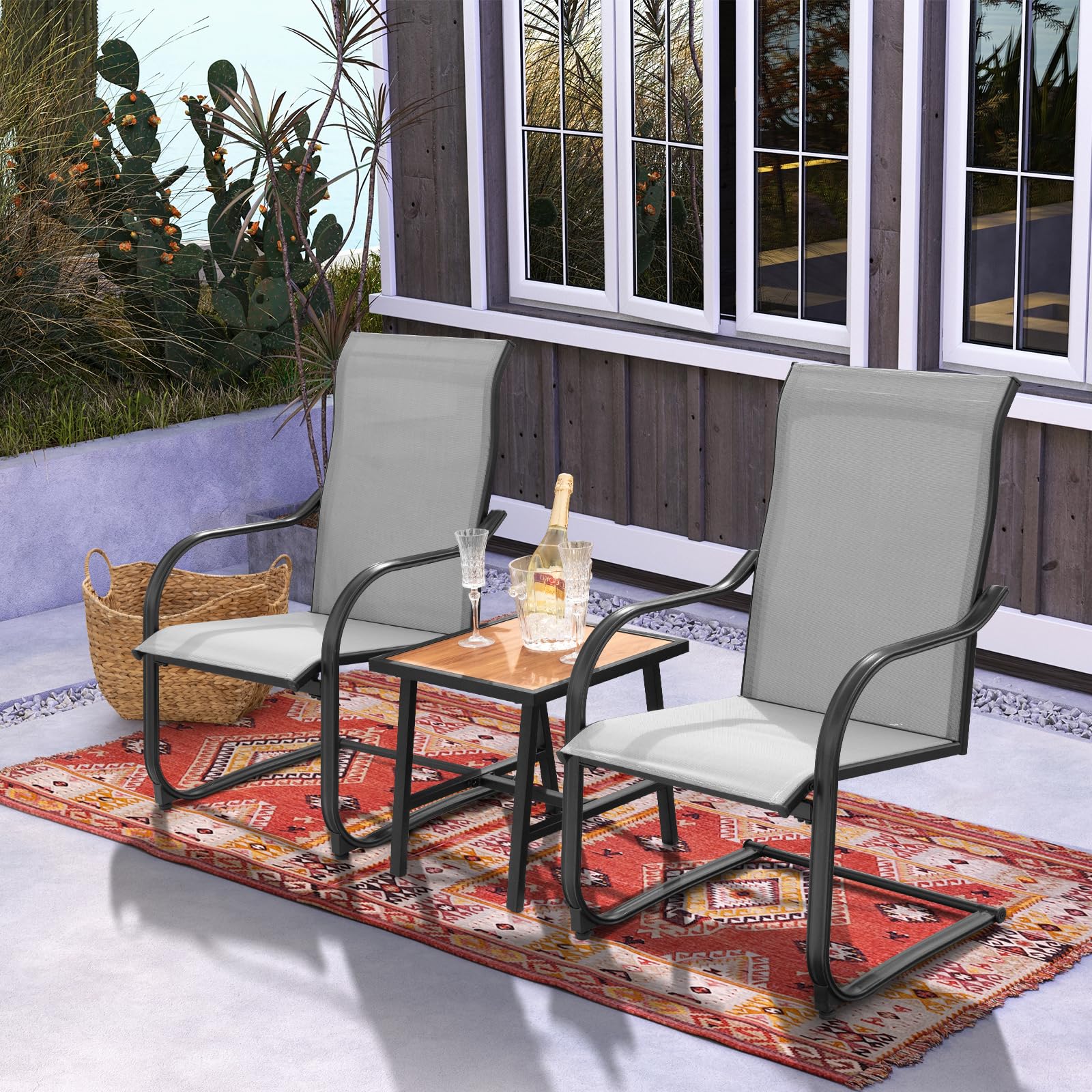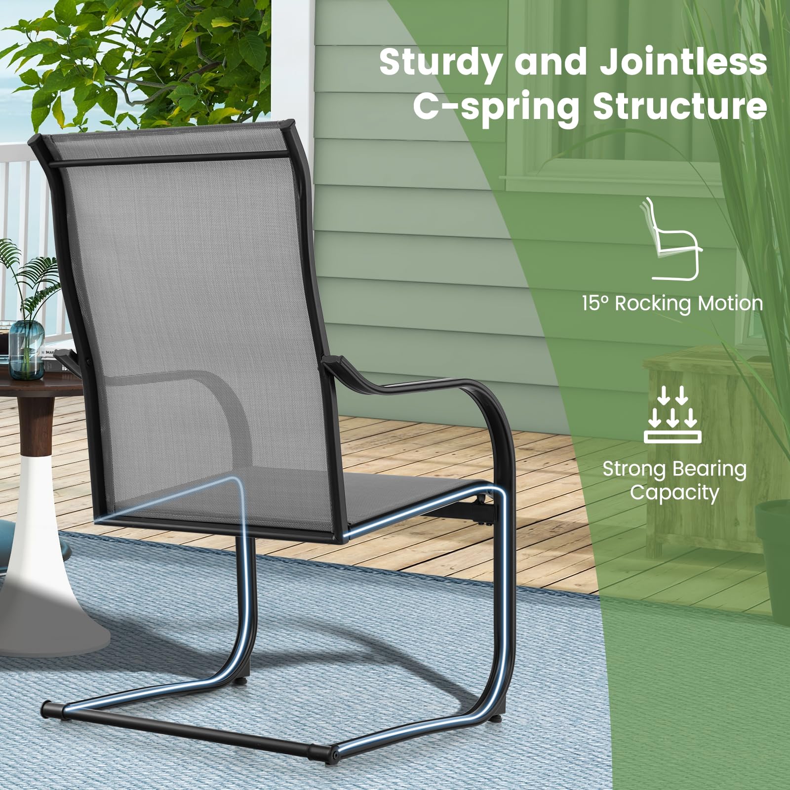 - [15° Slight Rocking]: Designed with sturdy and jointless C-spring structures, these outdoor dining chairs feature 15° rocking motions, allowing you to get better relaxation.