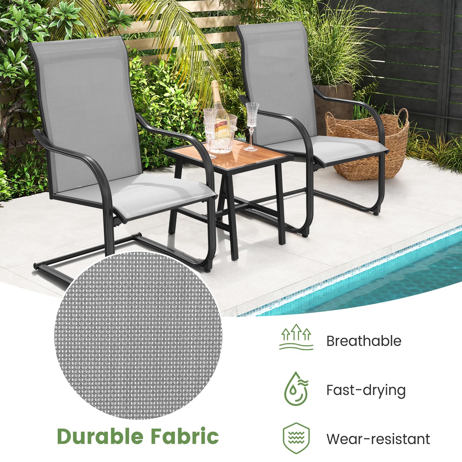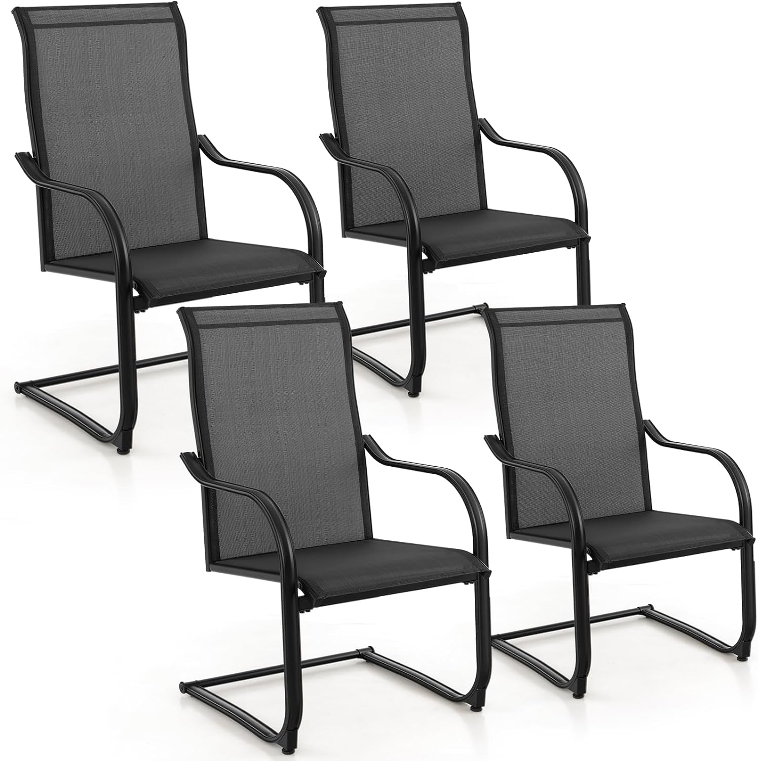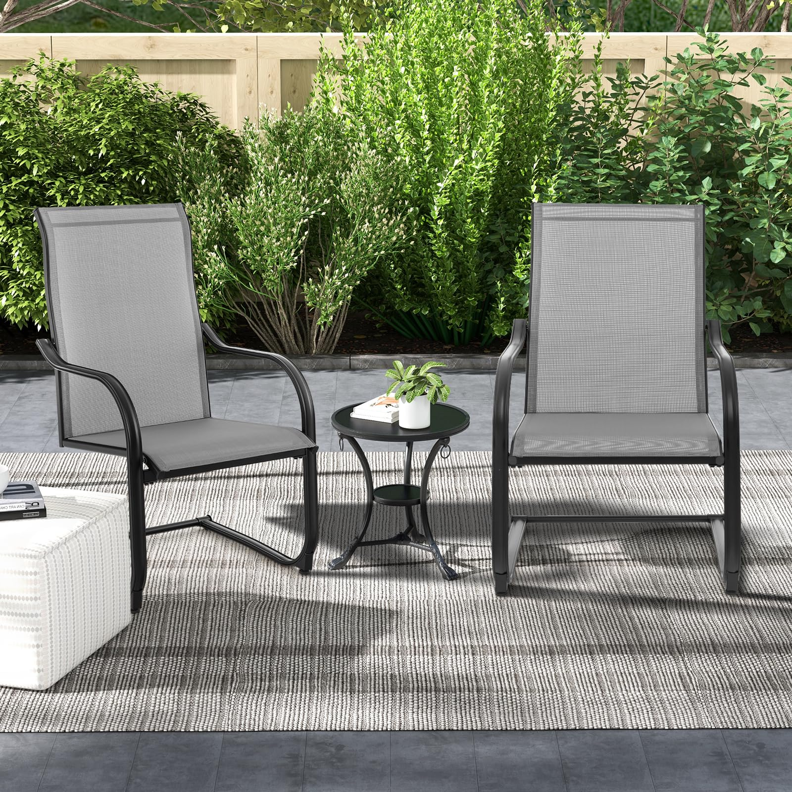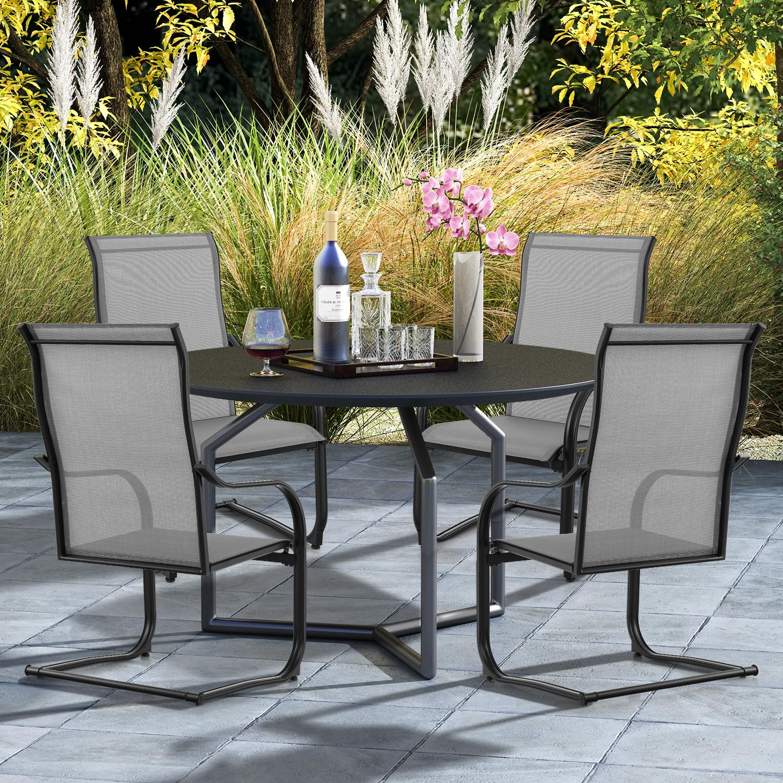 - [15° Slight Rocking]: Designed with sturdy and jointless C-spring structures, these outdoor dining chairs feature 15° rocking motions, allowing you to get better relaxation.