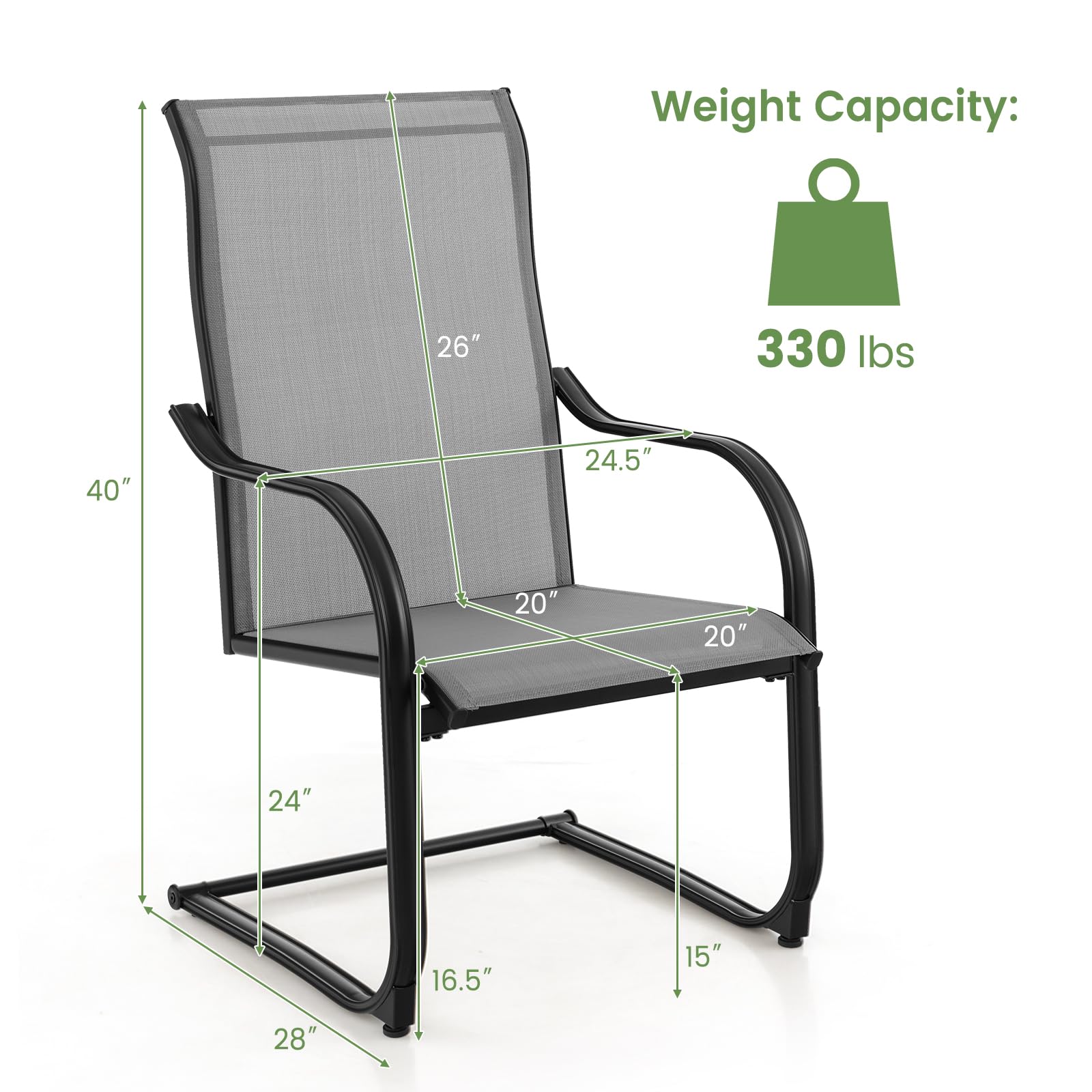 - [Sturdy Metal Frame]: These patio dining chairs are supported by heavy-duty metal frames that endow them with 330 lbs strong bearing capacity. Likewise, the rustproof surfaces make these dining chairs suitable for outdoors.